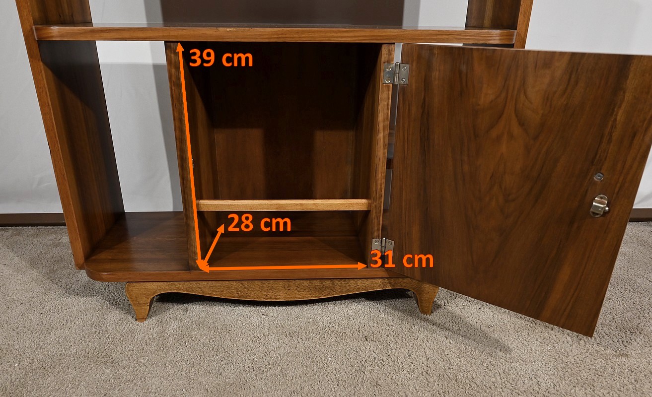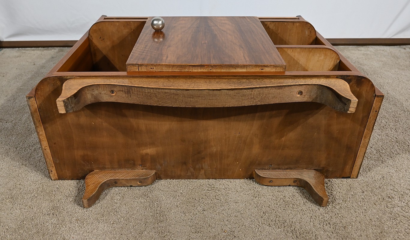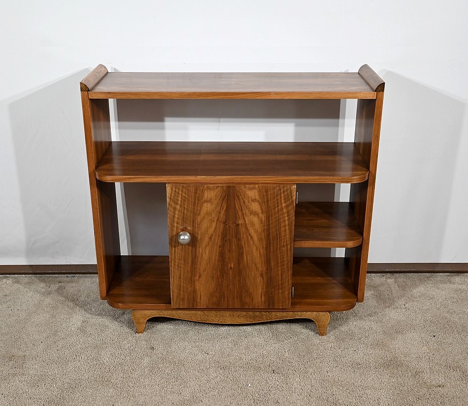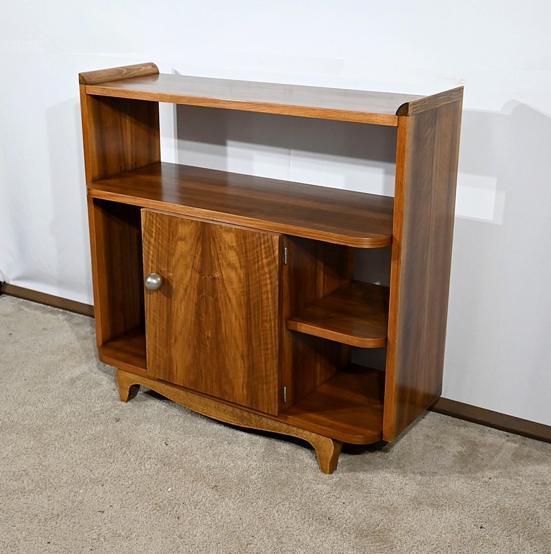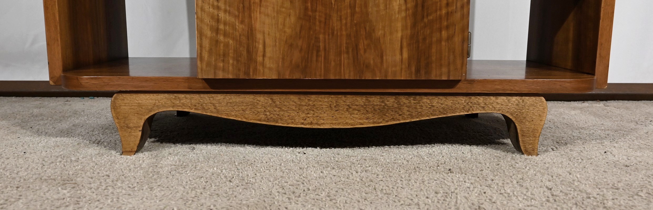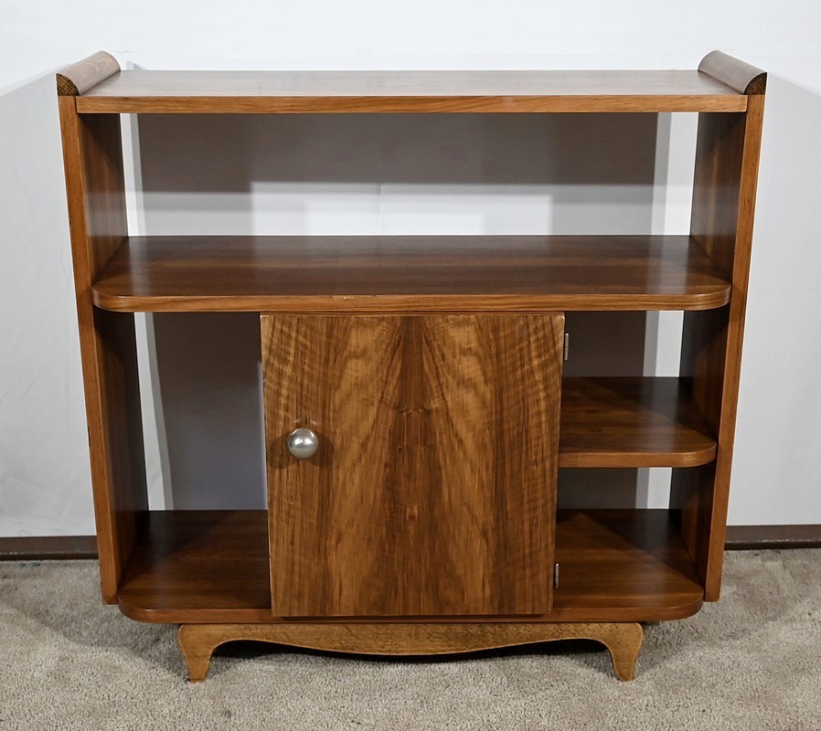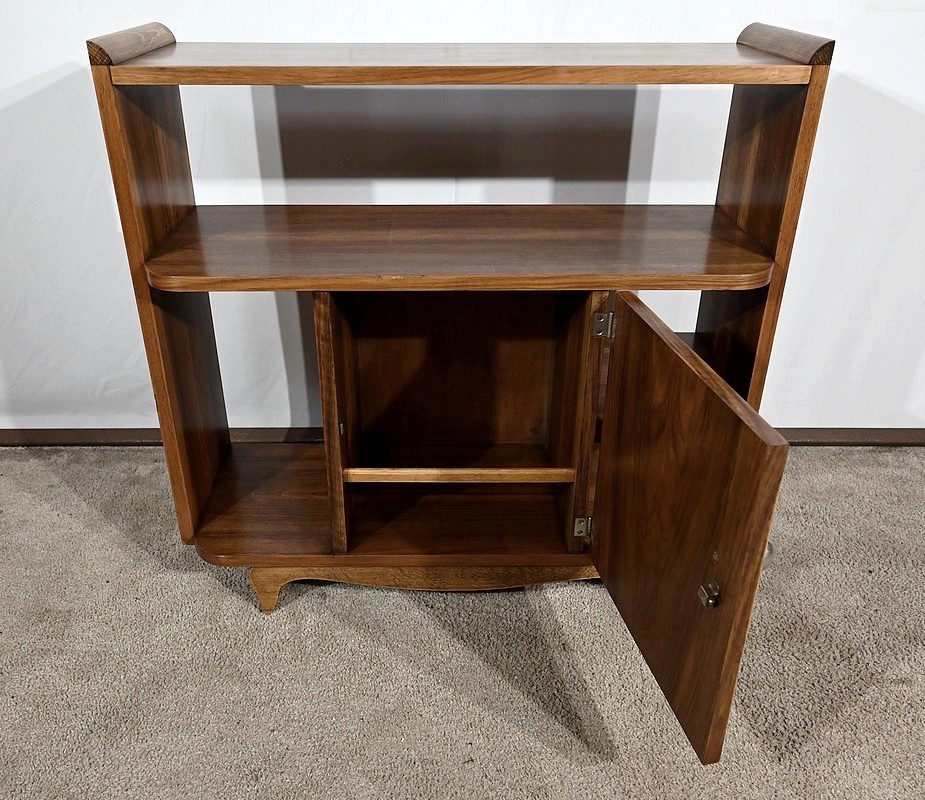 Petit mobilier en noyer massif et placage de noyer, composé d’étagères et d’une porte centrale se tirant par un gros bouton chromé. De chaque côté, des espaces de rangement apportent fonctionnalité à cette desserte Art déco aux lignes courbes et aux pieds à mouvement.