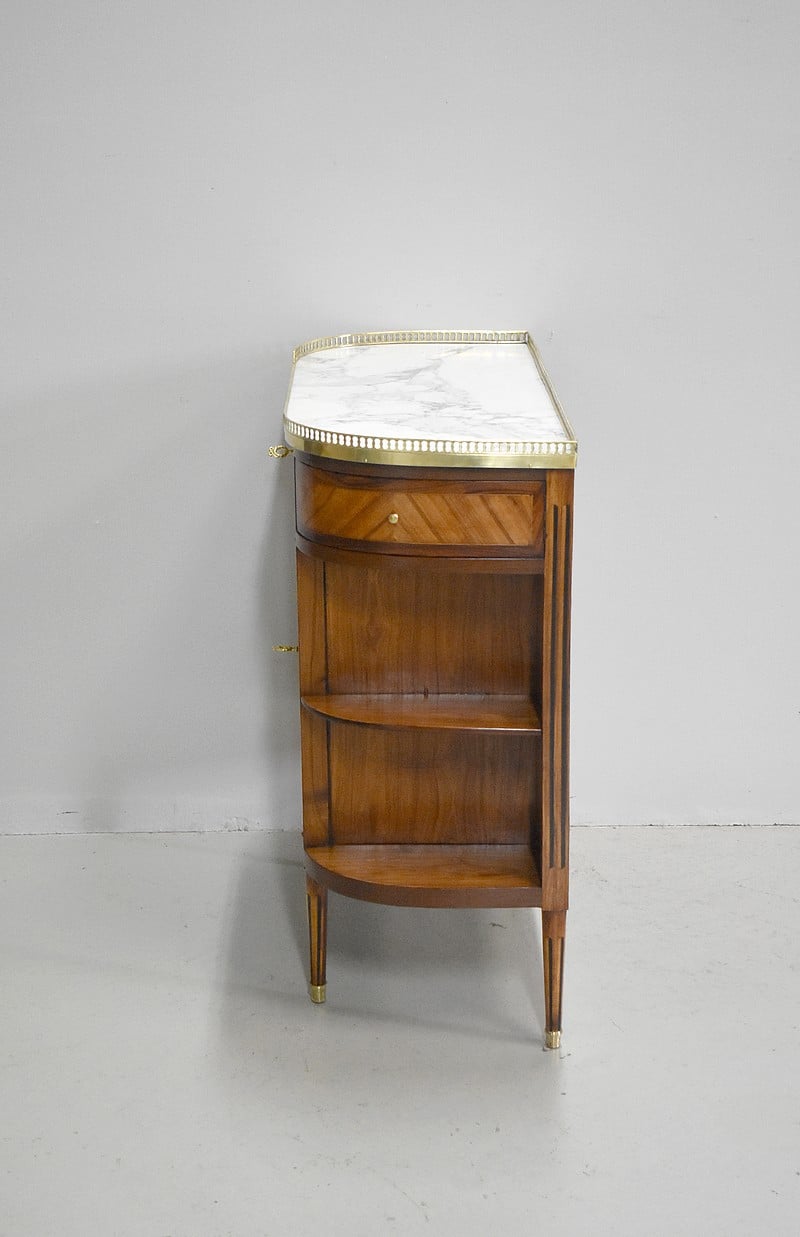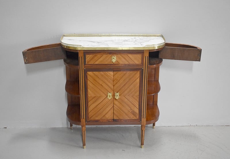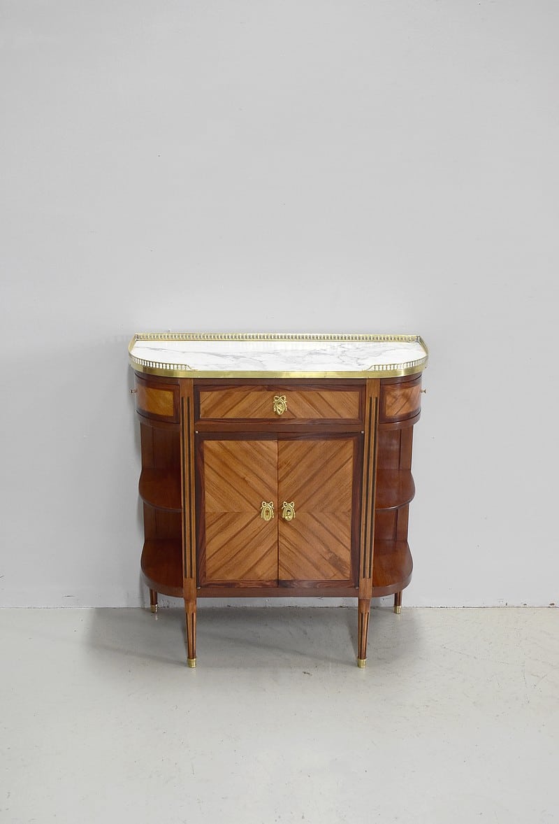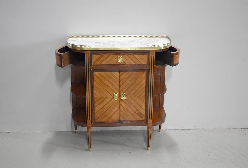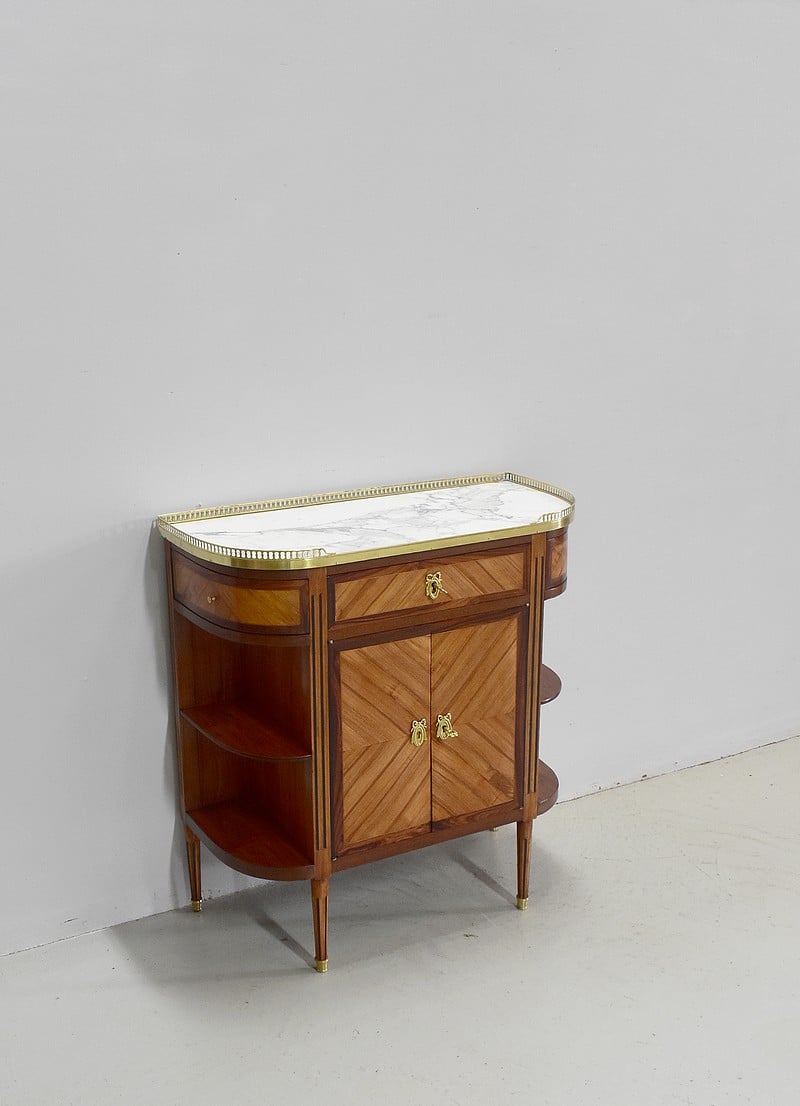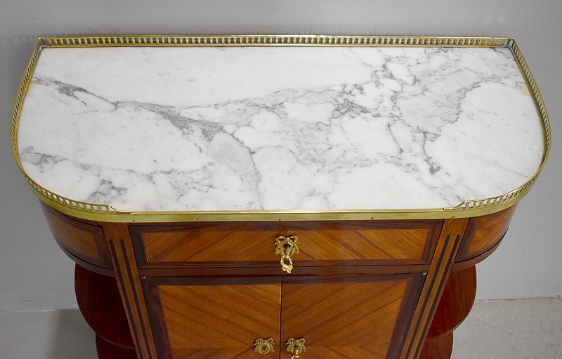 Petit meuble desserte d’entre-deux de style Louis XVI marqueté avec son dessus en marbre blanc de Carrare et bordé d’une galerie ajourée de laiton.