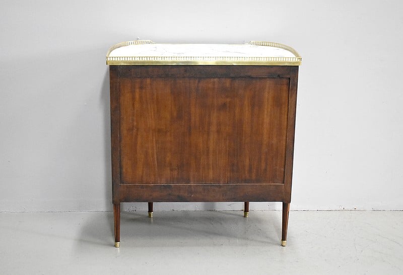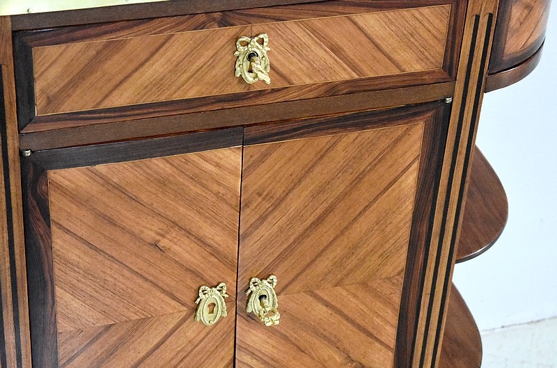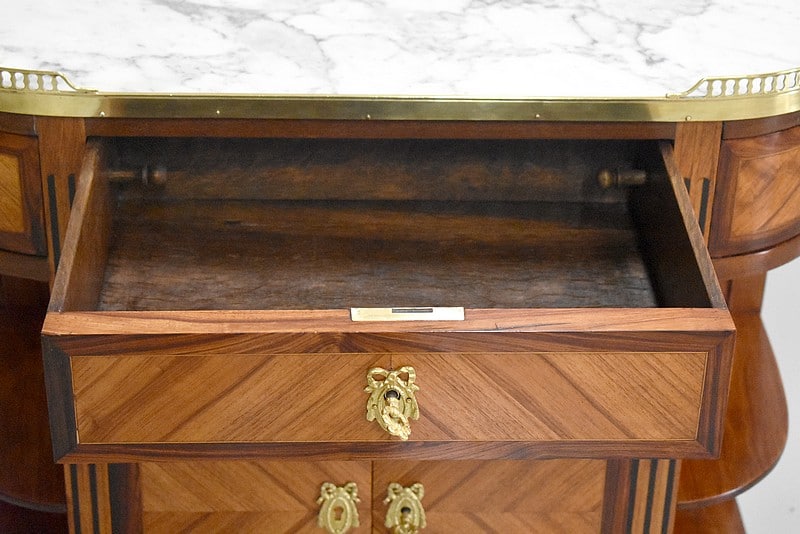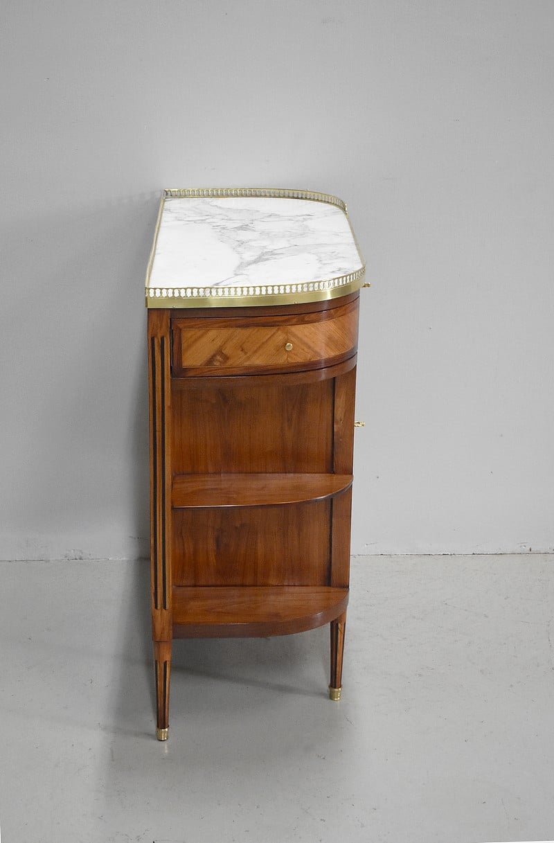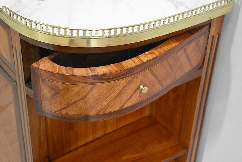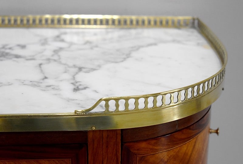 Petit meuble desserte d’entre-deux de style Louis XVI marqueté avec son dessus en marbre blanc de Carrare et bordé d’une galerie ajourée de laiton.