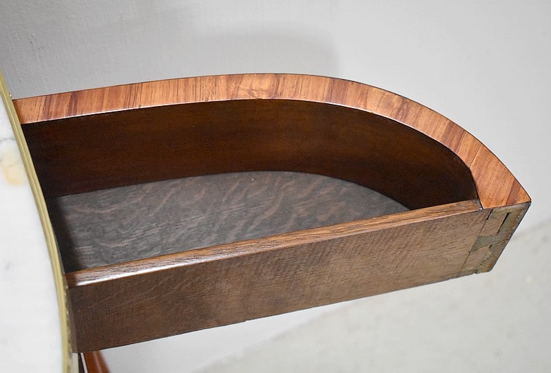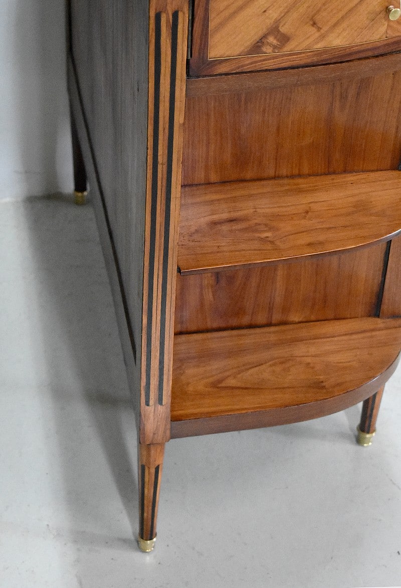 Il ouvre par trois tiroirs en ceinture marquetés de bois de rose, Palissandre de Rio et filets de citronnier. Les deux latéraux pivotants sont découpés en quart de rond et agrémentés de fins boutons et le tiroir central ferme à clef.