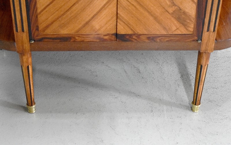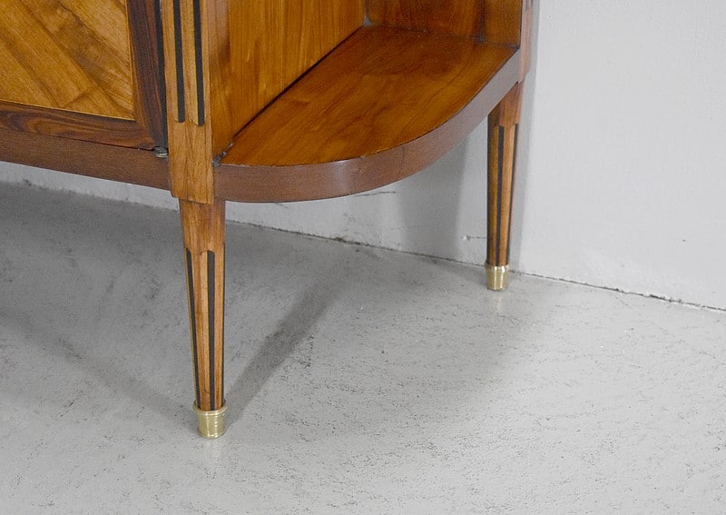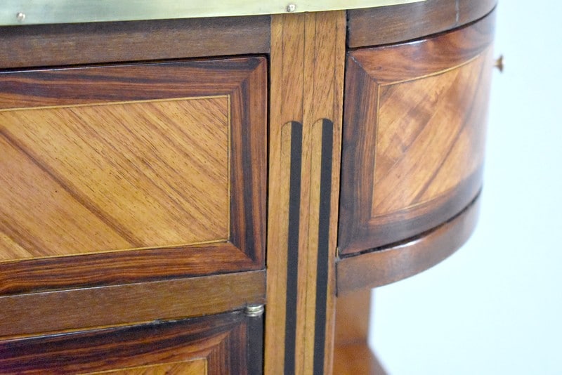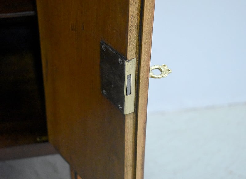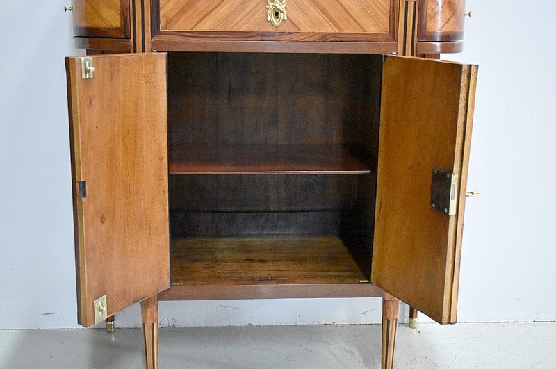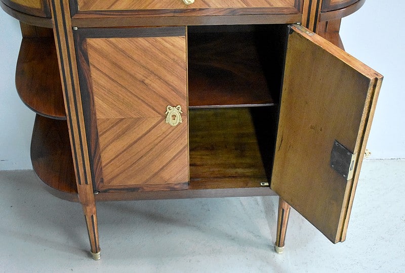 Deux petites portes centrales plaquées d’une marquèterie en aile de papillon en Bois de rose et encadrée de Palissandre sont entourées de montants plats à fausses cannelures marquetées d’Ébène et d’Acajou. Elles ouvrent sur un intérieur composé d’une fine étagère posée sur tasseaux fixes et ferment à clef ainsi que par une fermeture haut et bas à l’intérieur de la porte gauche.