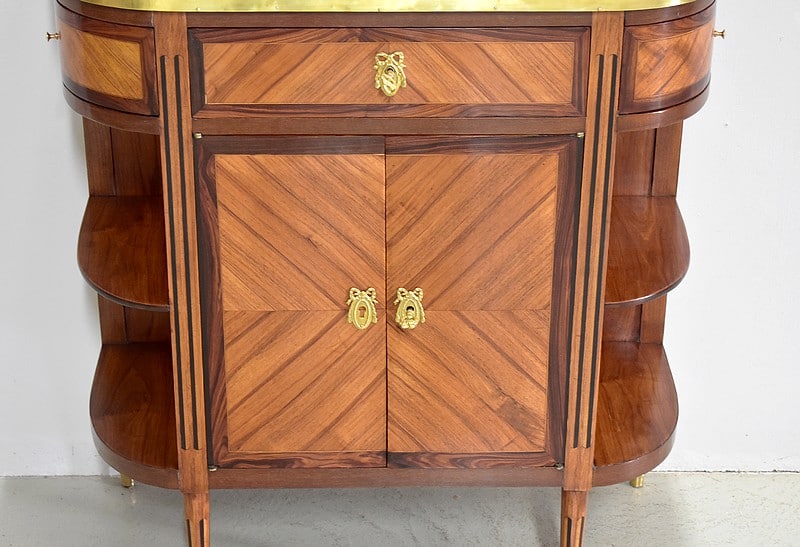 Il dispose également de deux vantaux latéraux flanqués d’une fine étagère de chaque côté, également en quart de rond.