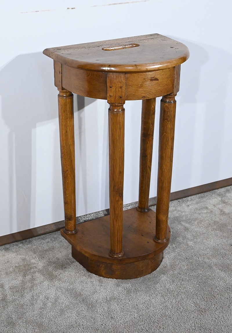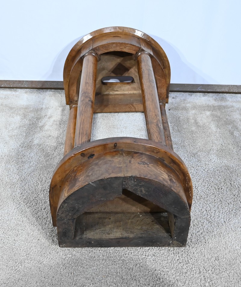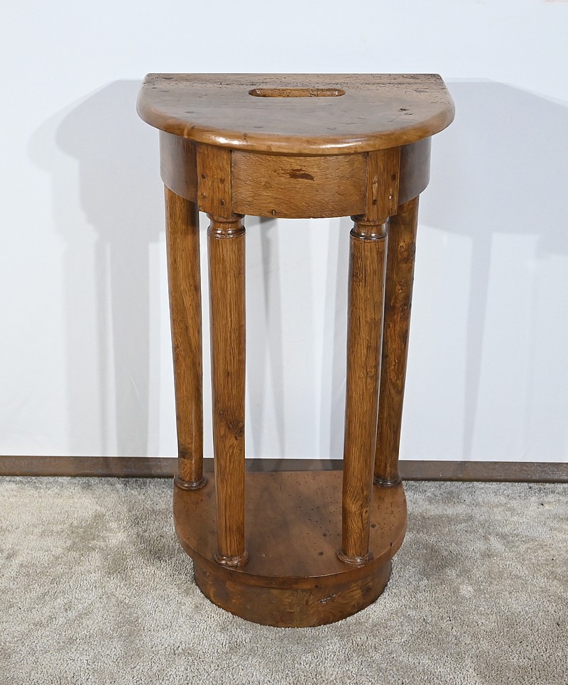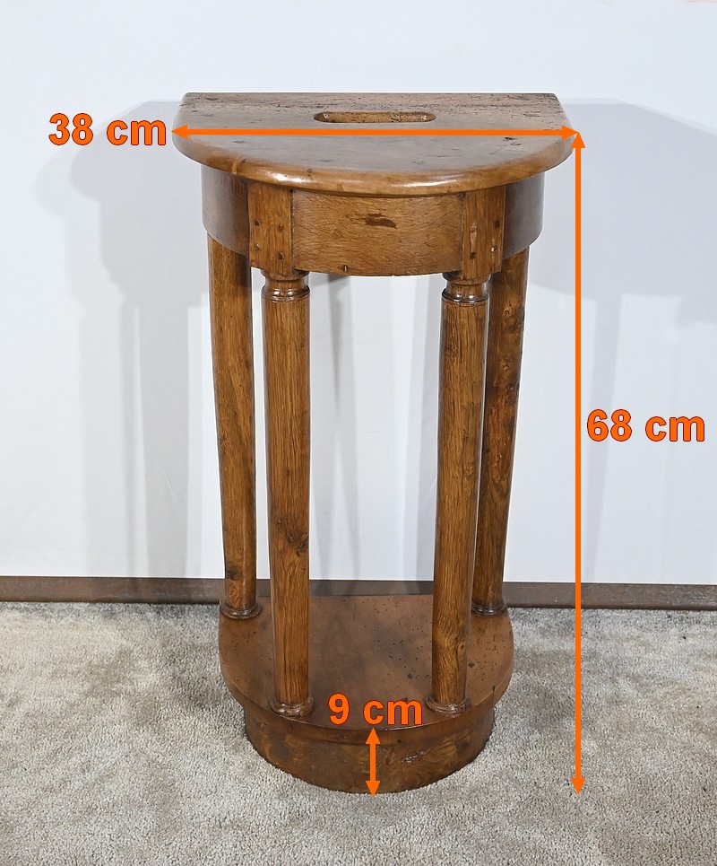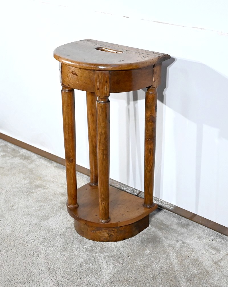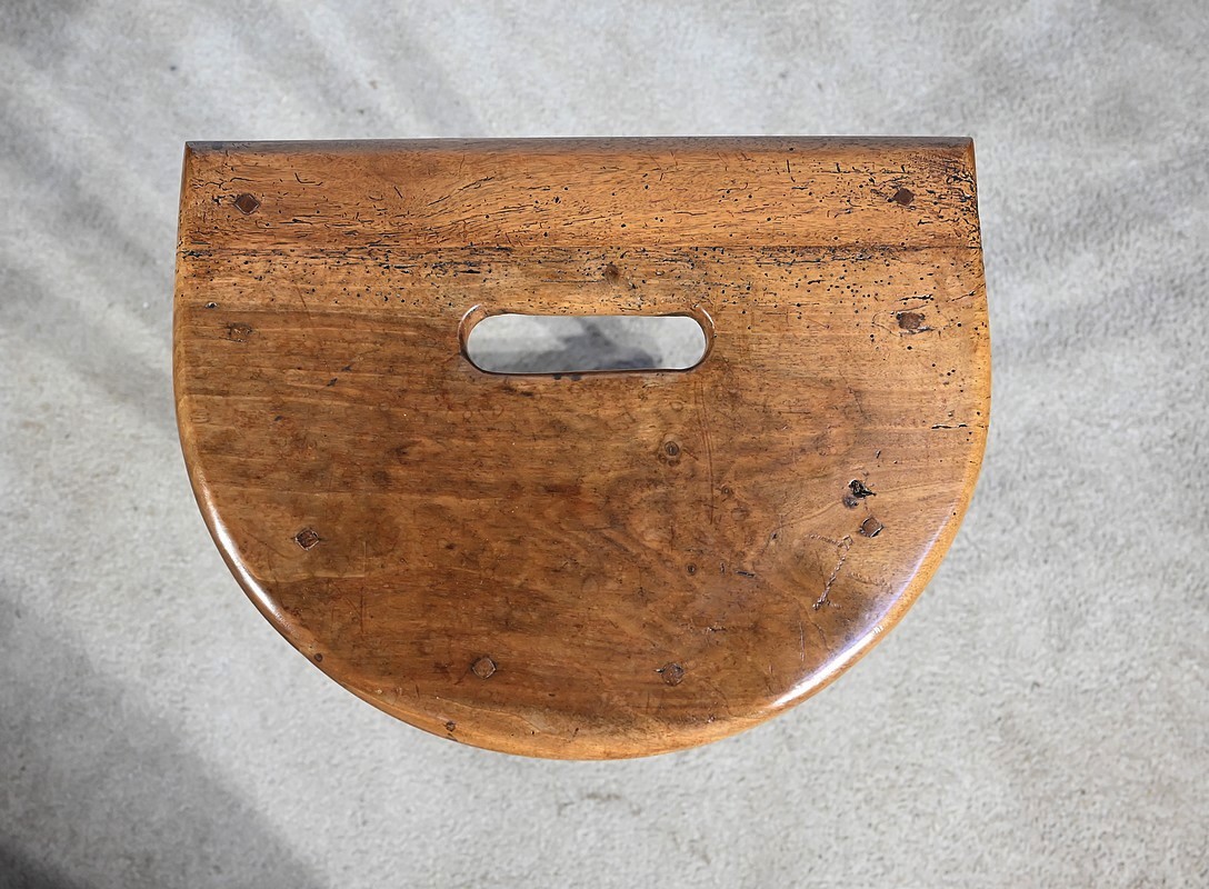Ce petit meuble demi-lune, tabouret de chantre, est constitué d’un dessus en noyer avec une échancrure permettant le passage de la main afin de le transporter.