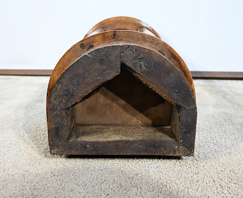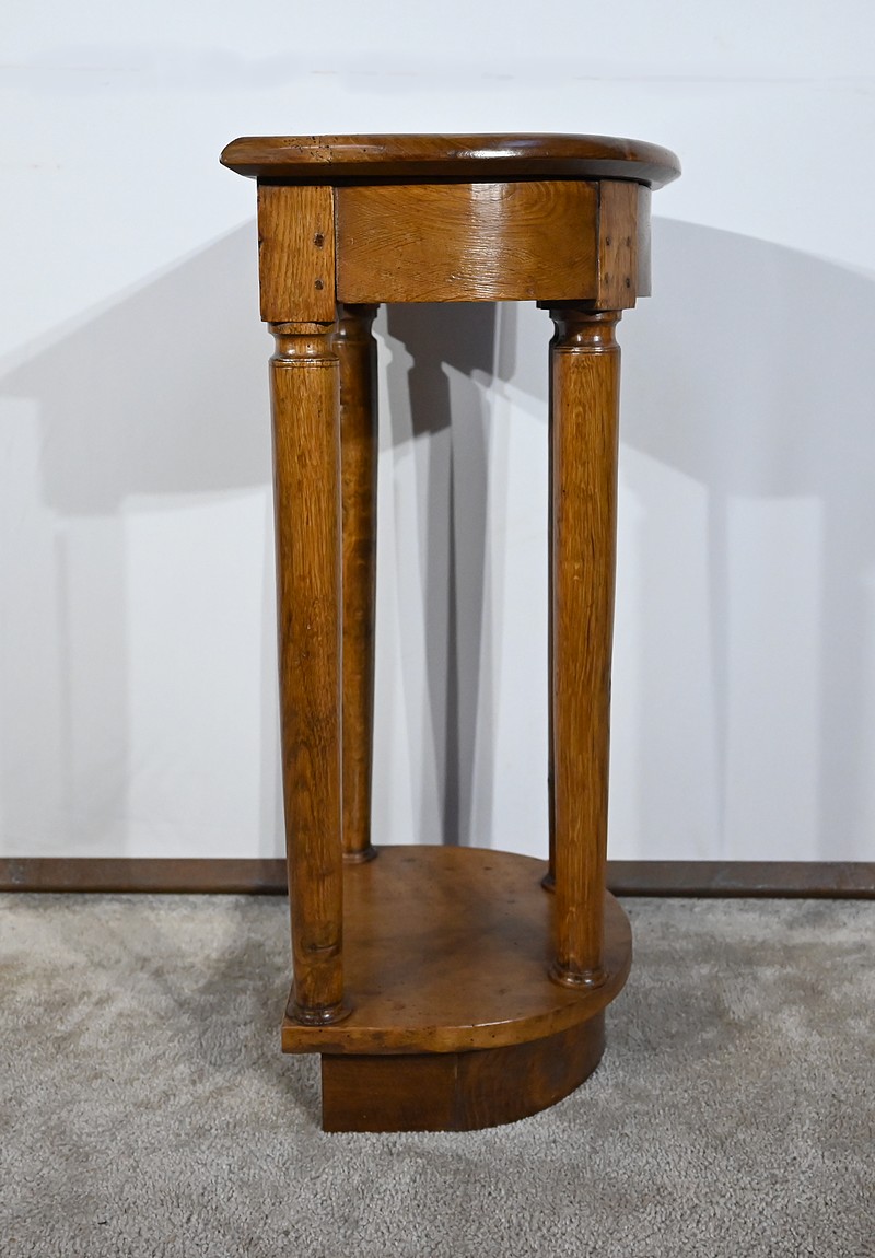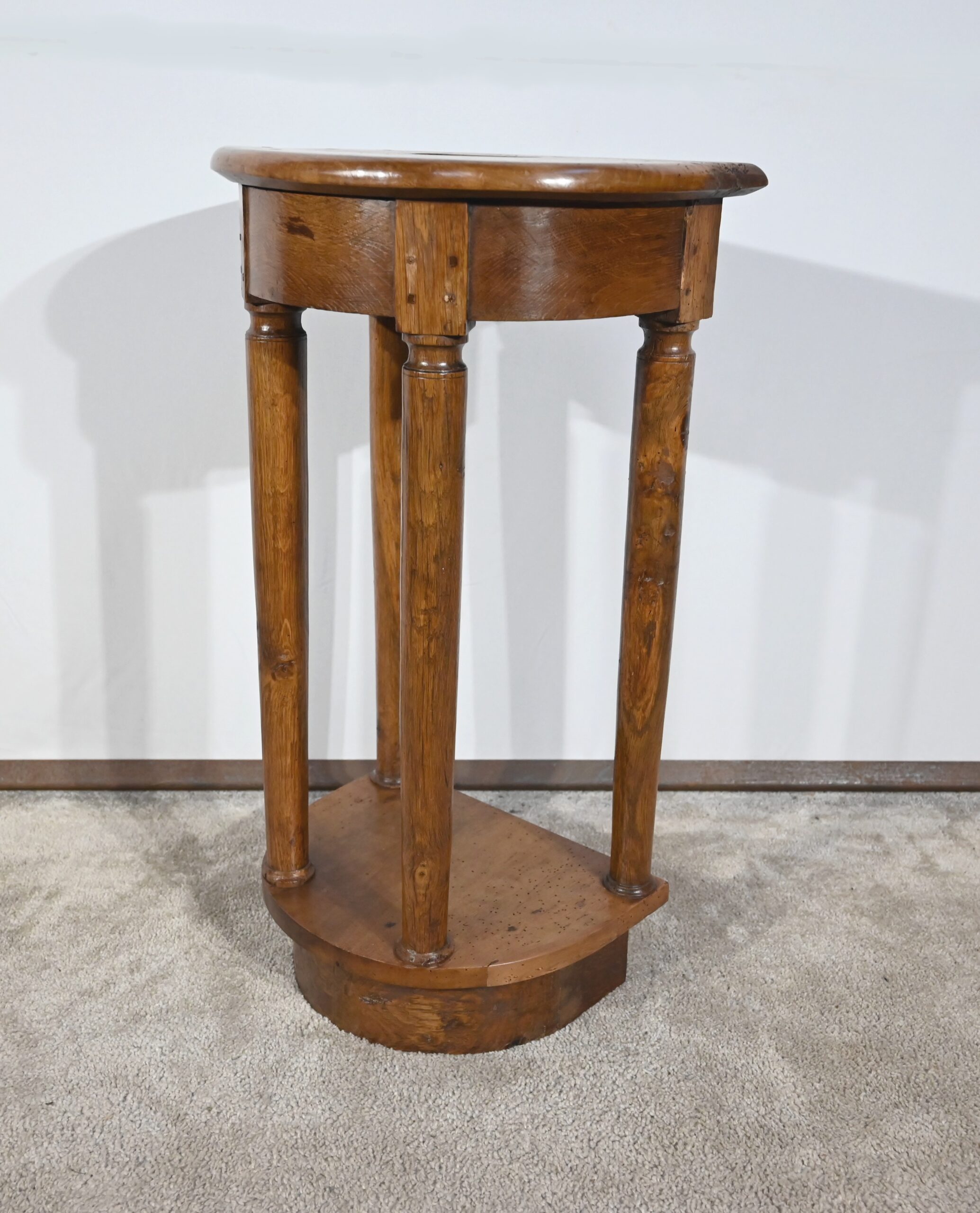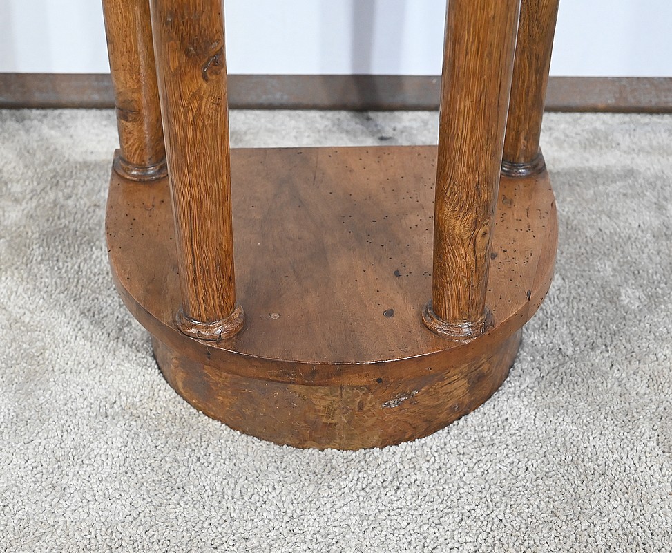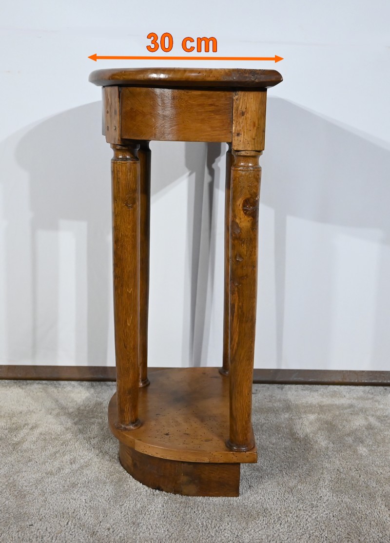 Ce petit meuble demi-lune, tabouret de chantre, est constitué d’un dessus en noyer avec une échancrure permettant le passage de la main afin de le transporter.