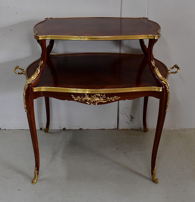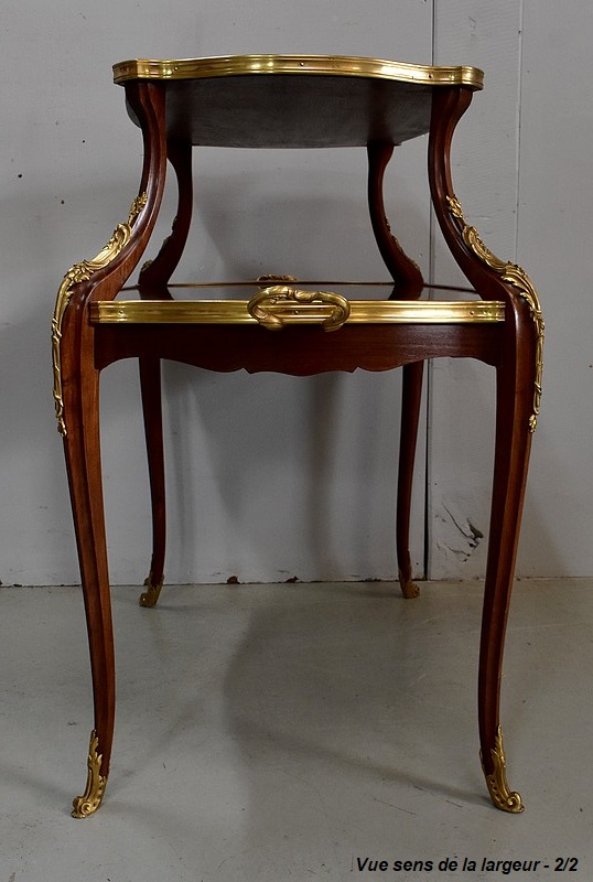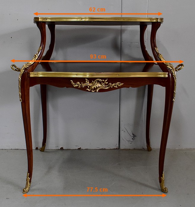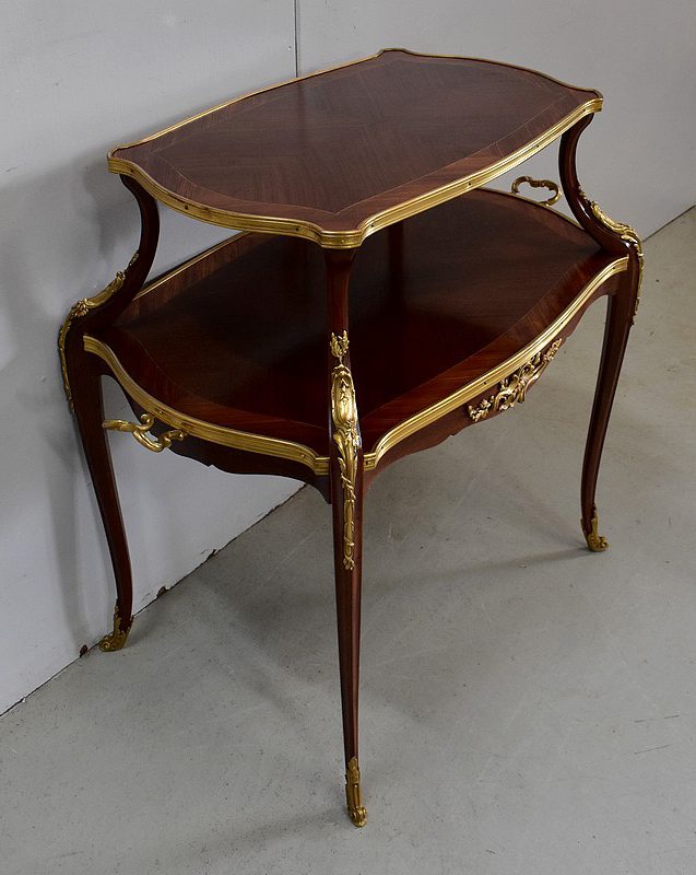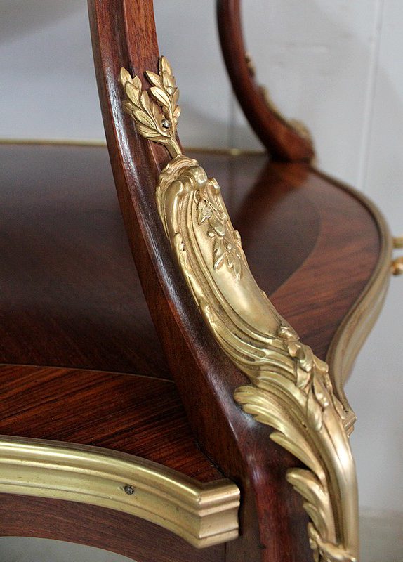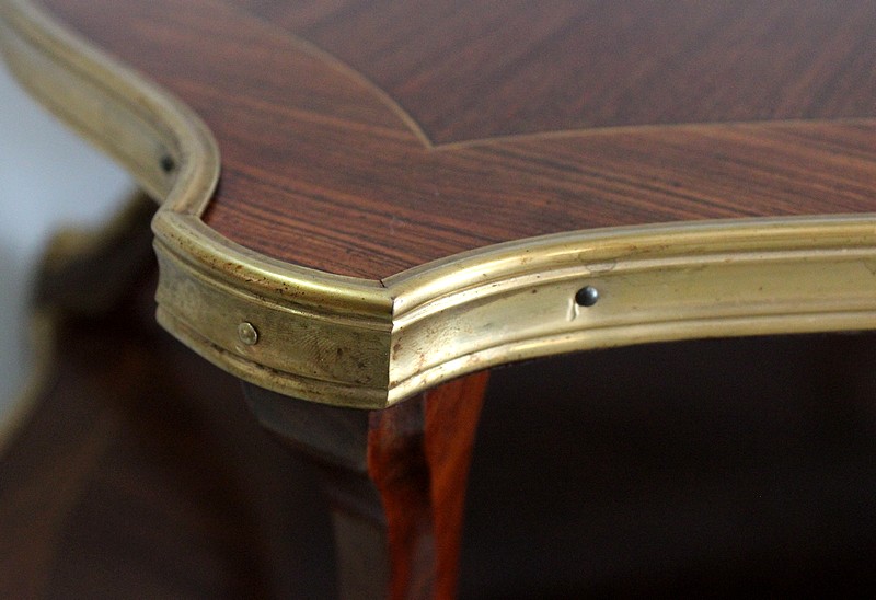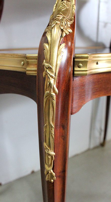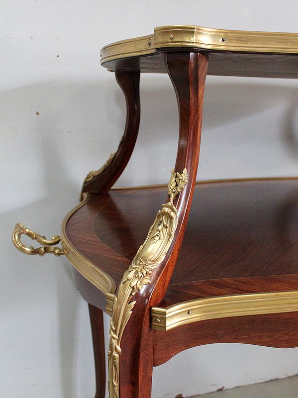 Cette Table bénéficie d’une Ornementation en Bronzes Dorés et Ciselés, tels que Chutes d’angles, Cul-de-Lampe et Doubles Sabots. De plus, deux poignées Ajourées et Ouvragées sont fixées sur la baguette en Laiton du plus grand des plateaux.