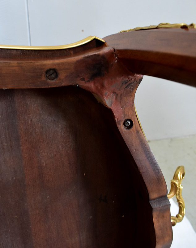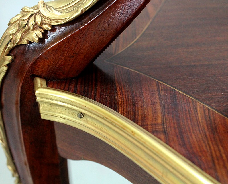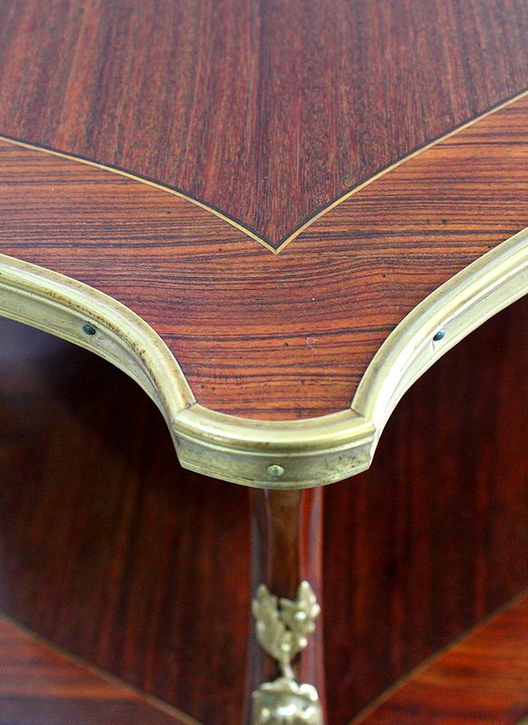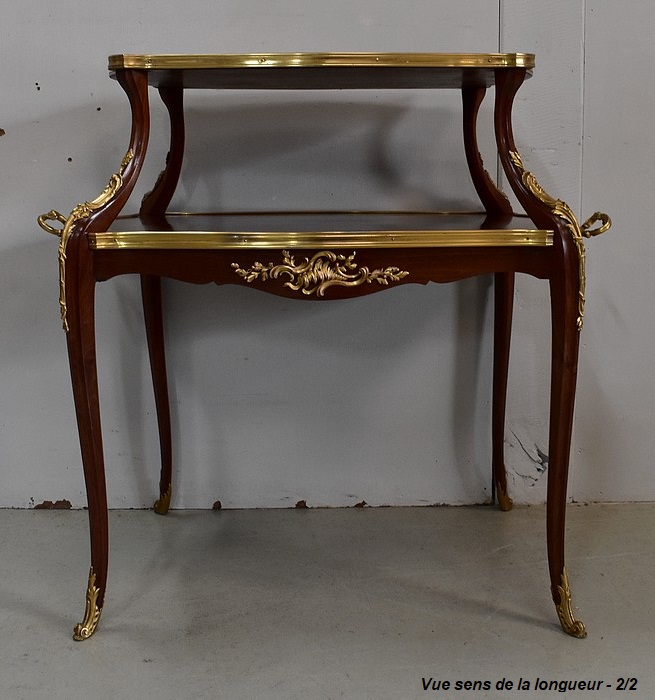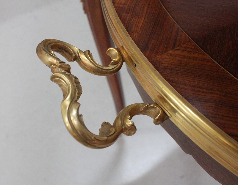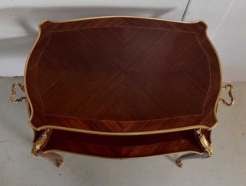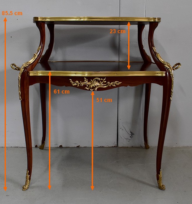 Cette Table bénéficie d’une Ornementation en Bronzes Dorés et Ciselés, tels que Chutes d’angles, Cul-de-Lampe et Doubles Sabots. De plus, deux poignées Ajourées et Ouvragées sont fixées sur la baguette en Laiton du plus grand des plateaux.