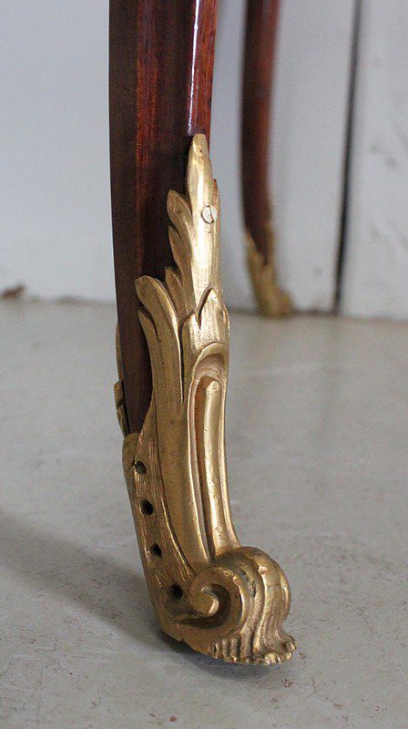 Les montants intermédiaires, en Acajou massif, sont Courbes et Concaves, et ils sont prolongés par quatre pieds Moulurés et Élégamment Galbés.