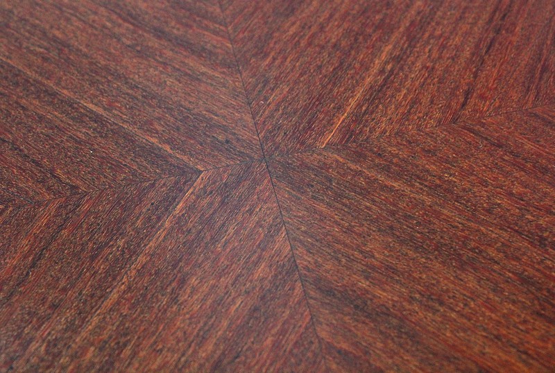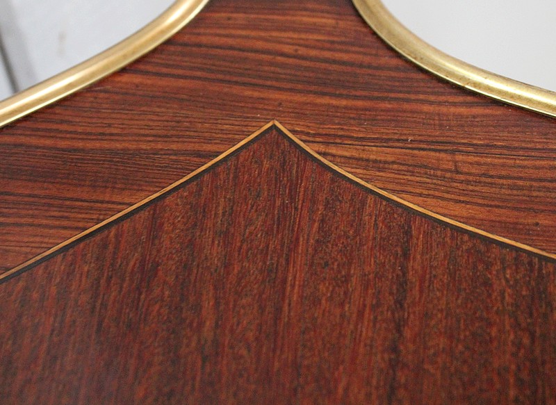 Meuble composé par définition d’une Petite Table Volante de Salon, surmontée d’un second plateau qui est une réduction du premier. Tous deux sont constitués au centre d’un Placage d’Acajou disposé en Ailes de Papillon, bordé d’une Marqueterie de Bois de Violette en Frise. Ces deux essences de Bois sont Joliment séparées par un double filet en Ébène et Citronnier. Plateau principal et Tablette supérieure sont Chantournés, et agrémentés sur leurs pourtours de Lingotières.