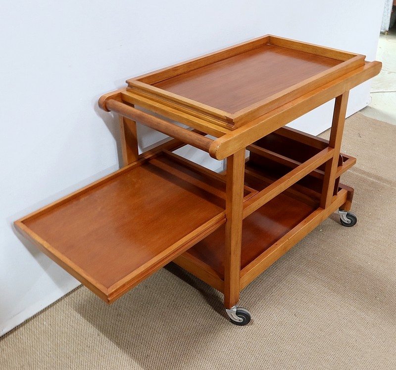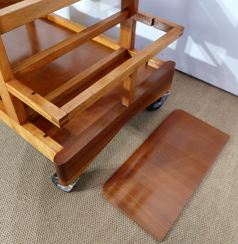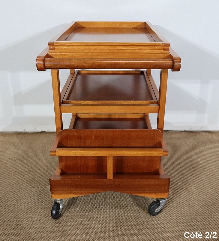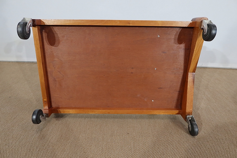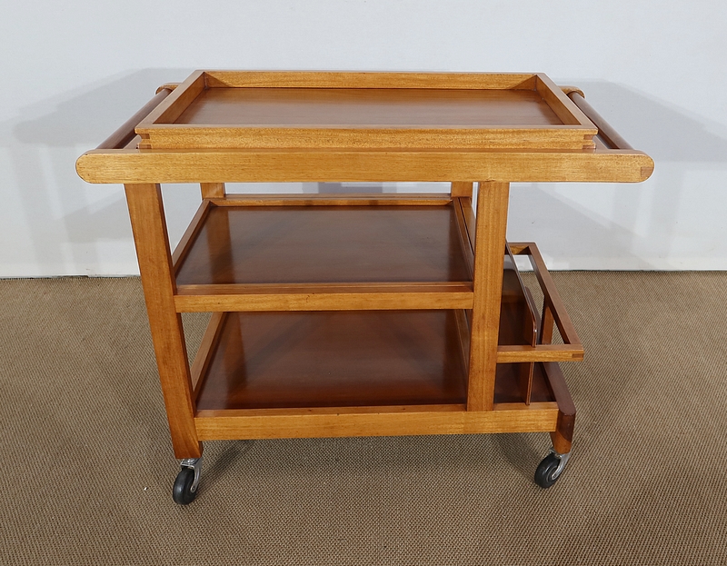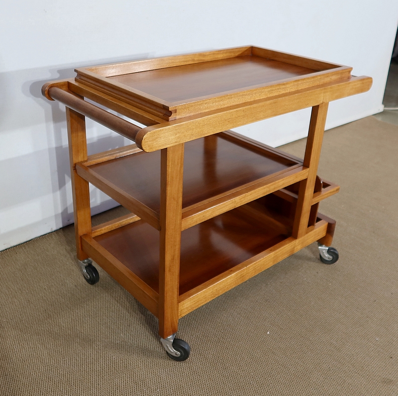 Desserte roulante en Acajou blond disposant d’un plateau supérieur amovible munis de gorge à ses extrémités pour une prise en main optimale. Ce plateau de bonne profondeur est idéal pour un service à table ou un repas individuel.