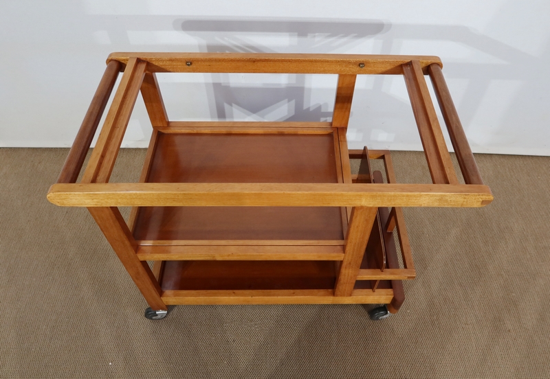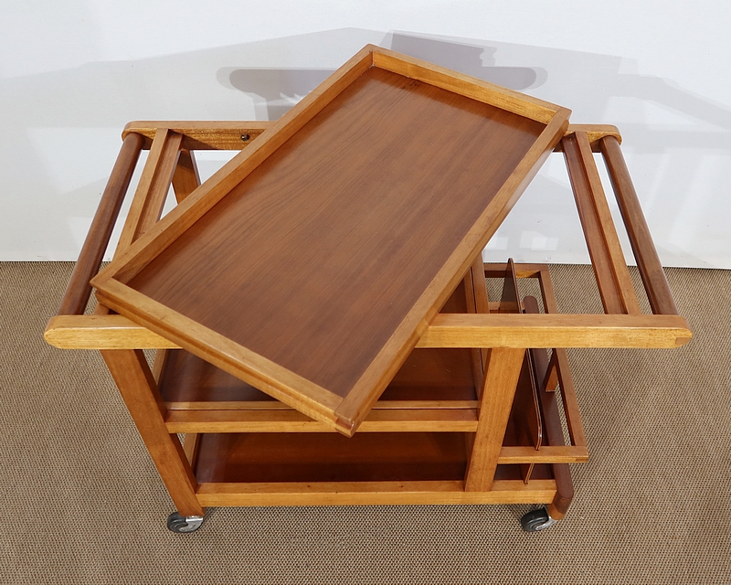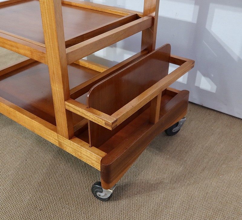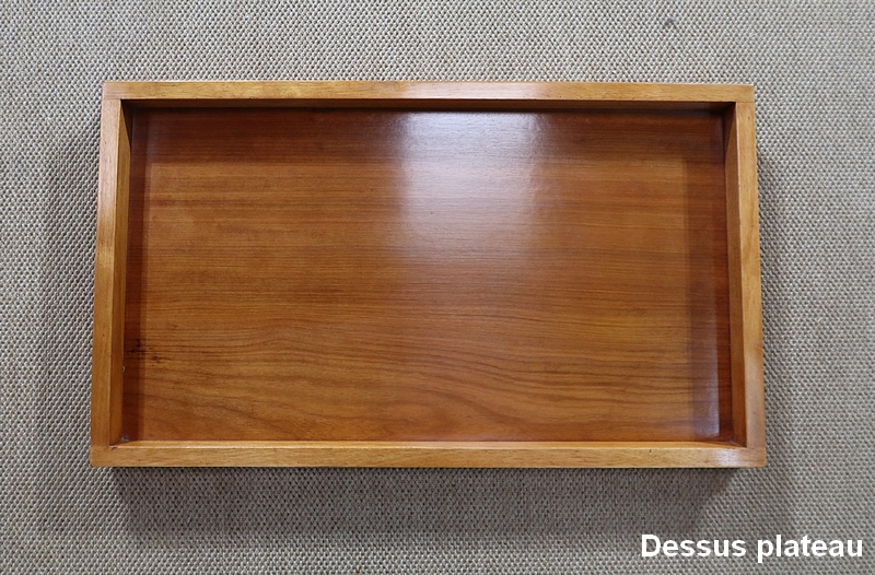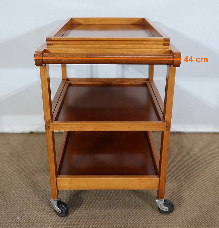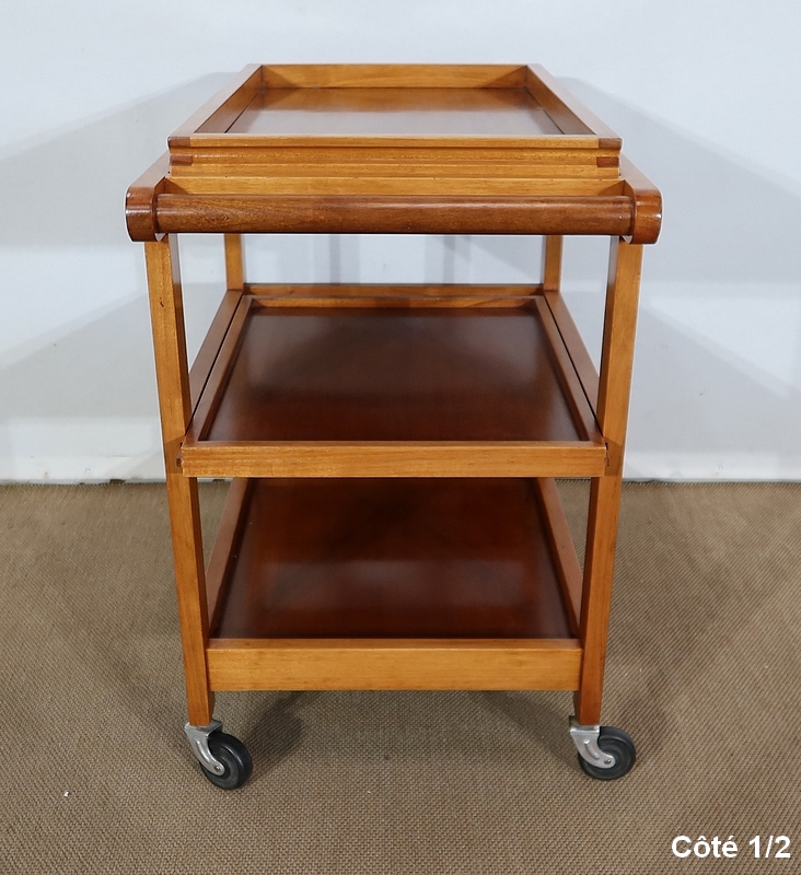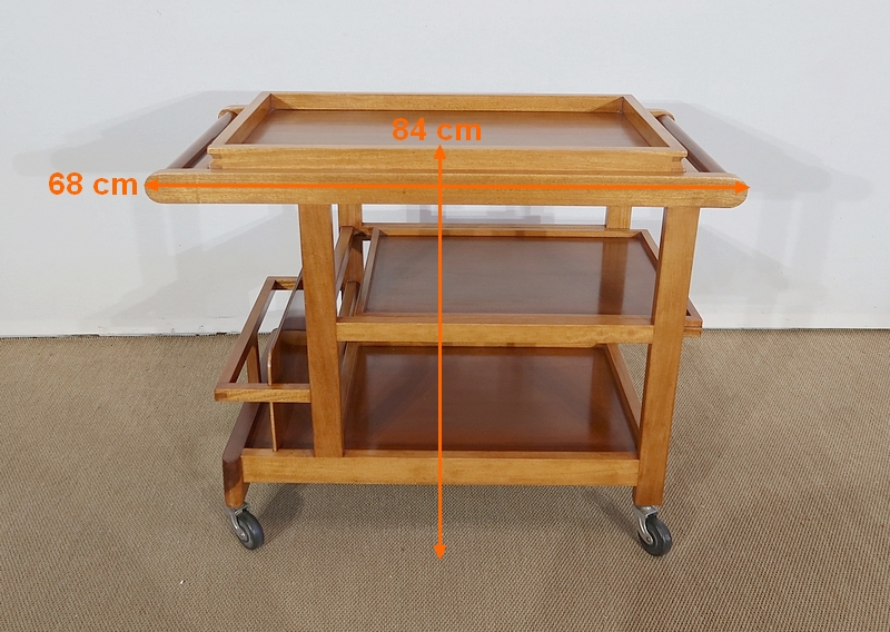 Desserte roulante en Acajou blond disposant d’un plateau supérieur amovible munis de gorge à ses extrémités pour une prise en main optimale. Ce plateau de bonne profondeur est idéal pour un service à table ou un repas individuel.