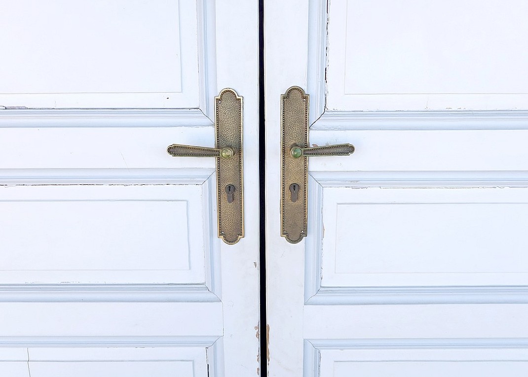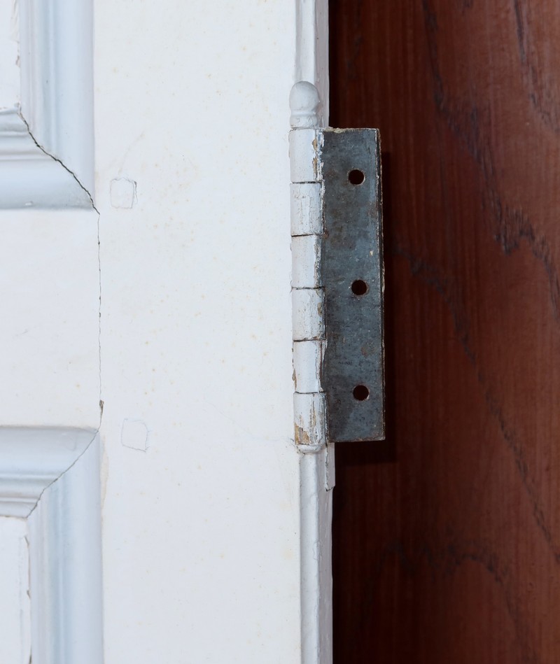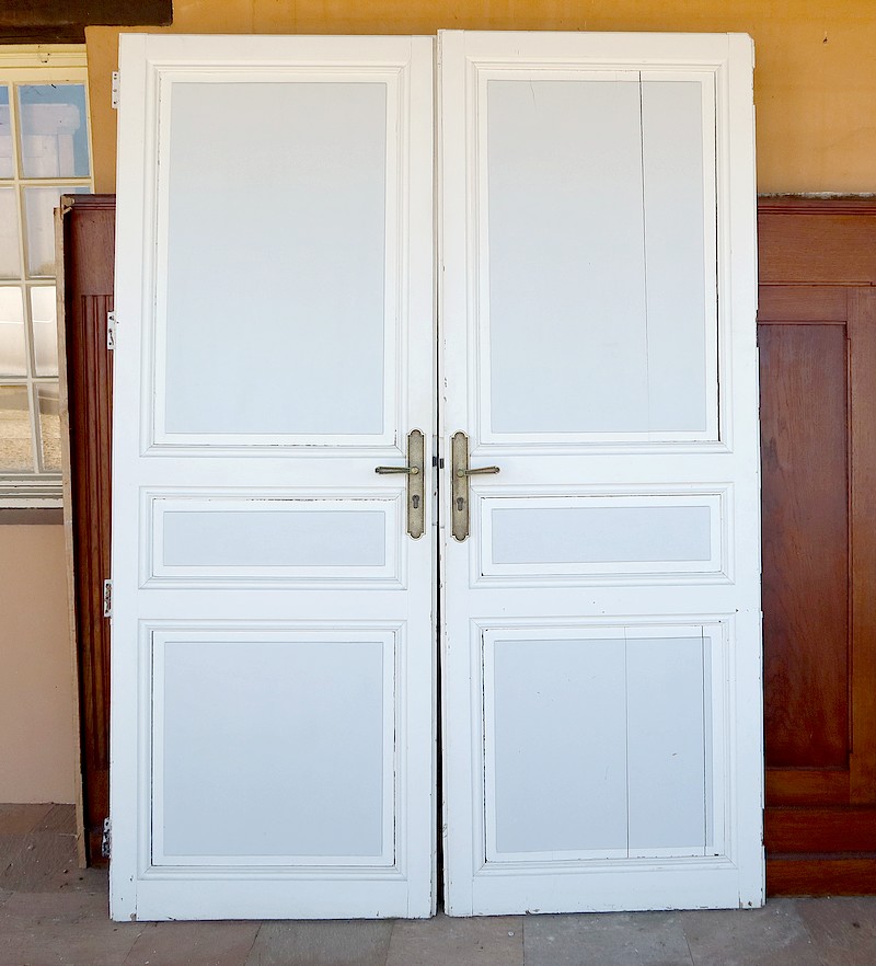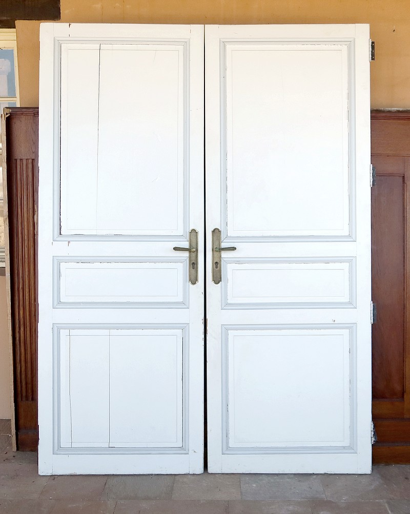 Anciennes portes provenant d’un château de la région nantaise, composées chacune de deux grands panneaux et d’un petit horizontal. Ces panneaux à plate-bande sont dans un encadrement et des traverses moulurées par l’intérieur.