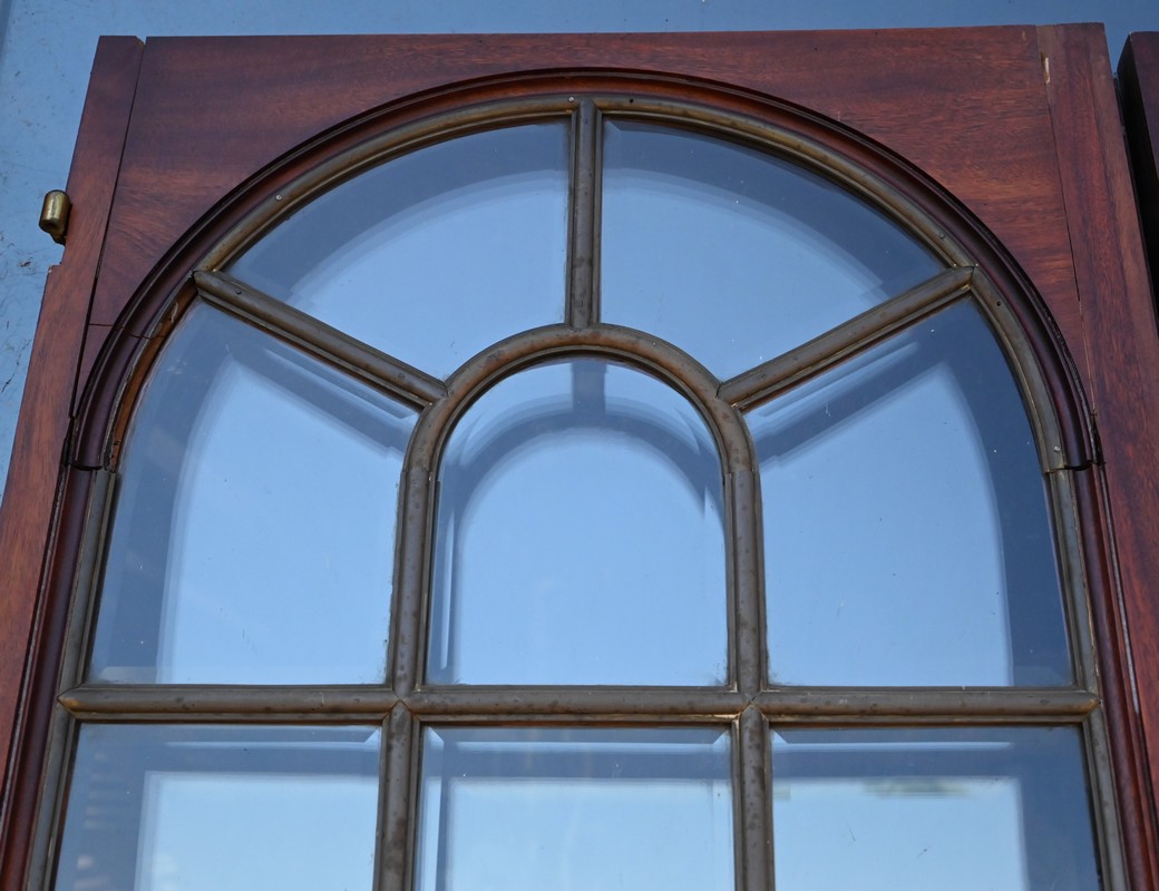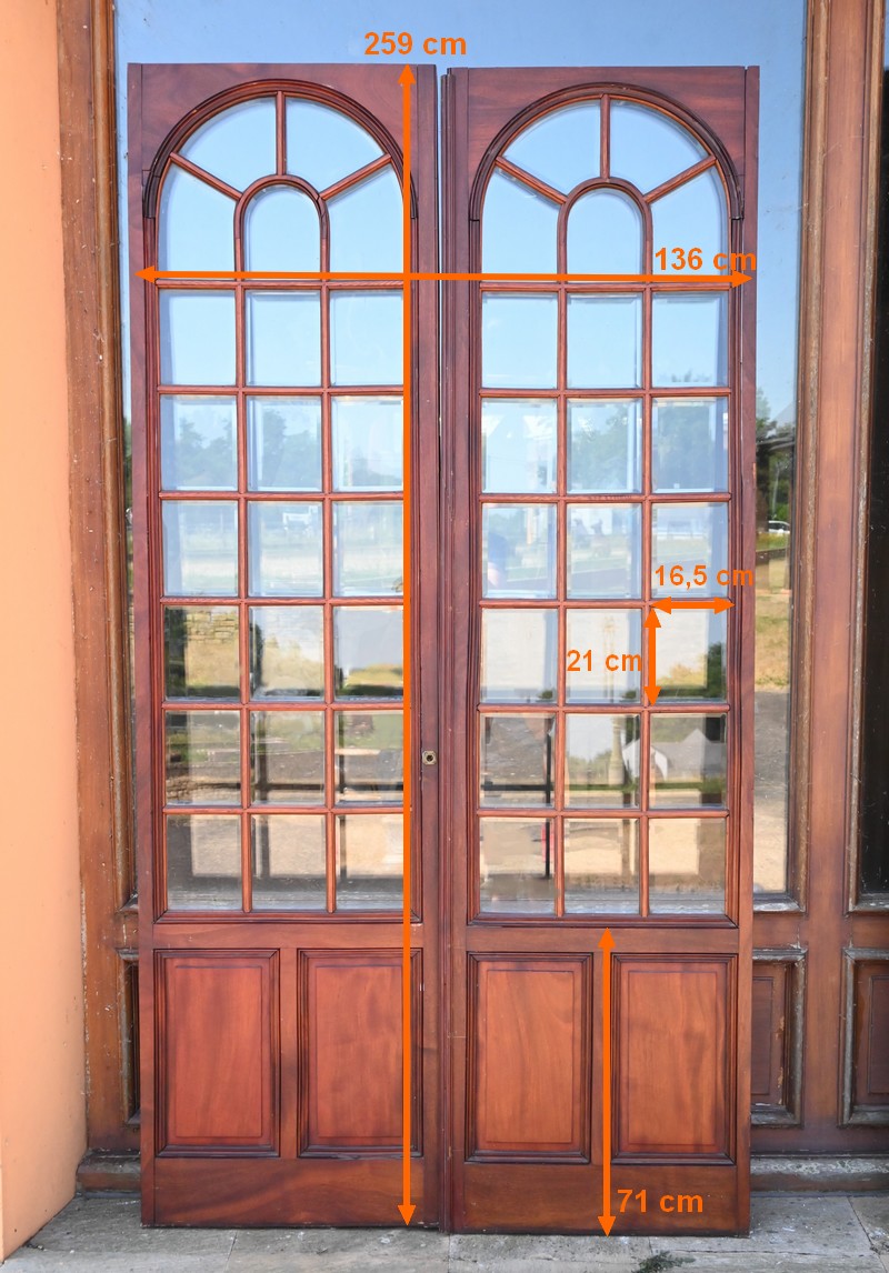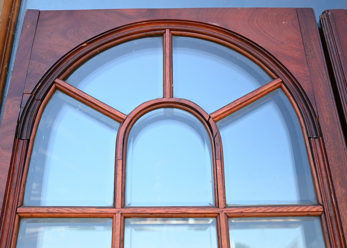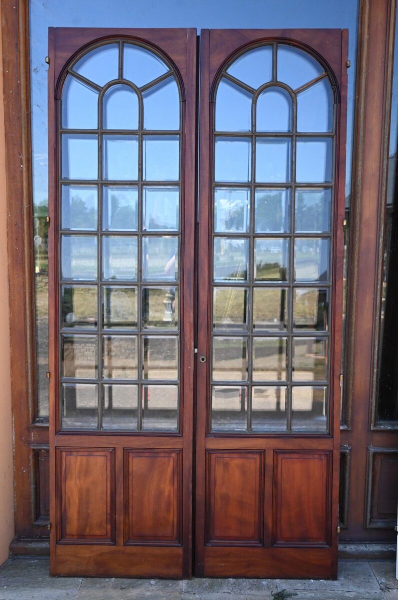 La partie haute de chaque porte comporte dix huit carreaux biseautés séparés verticalement et horizontalement d’un barreaudage bois recouvert de laiton. La partie supérieure, en forme de demi cercle, présente cinq verres en biseaux de structure et de dimensions différentes.