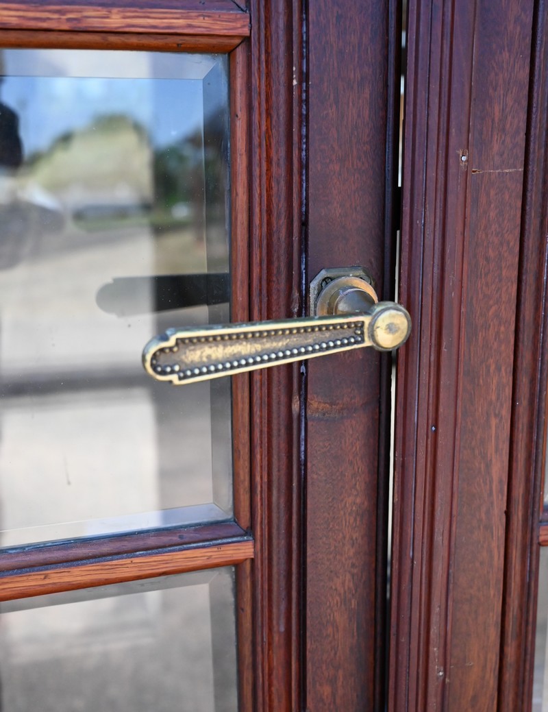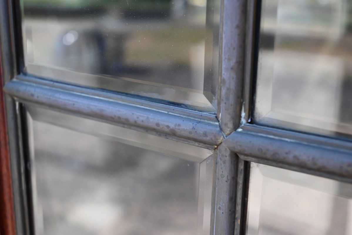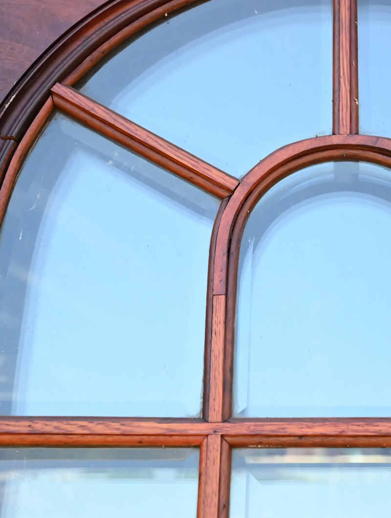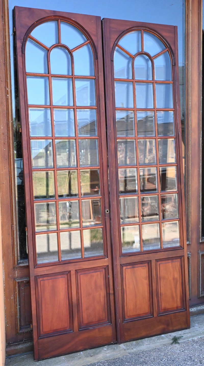 La partie haute de chaque porte comporte dix huit carreaux biseautés séparés verticalement et horizontalement d’un barreaudage bois recouvert de laiton. La partie supérieure, en forme de demi cercle, présente cinq verres en biseaux de structure et de dimensions différentes.