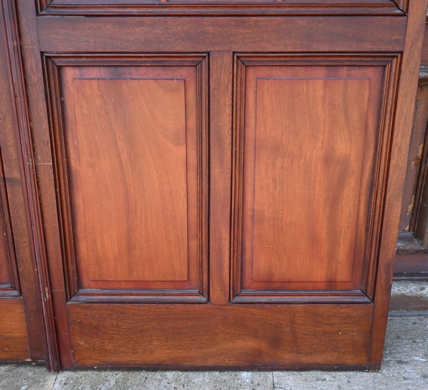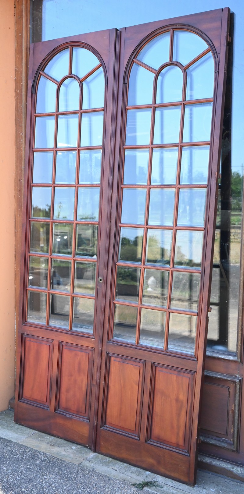 Cette paire de portes en acajou massif, provenant d’un château de la région nantaise, est composée en partie basse de deux panneaux à plates bandes à cadre mouluré.