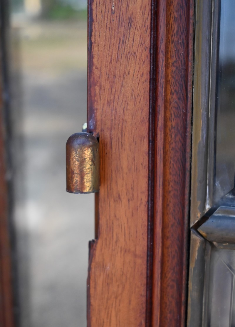 Chacune de ces portes possèdent quatre gonds en laiton pour fixation. La porte de gauche est munie d’une fixation haut et bas en laiton (voir photos).