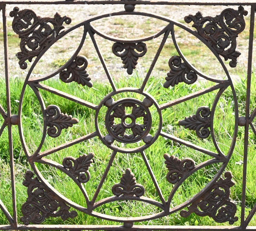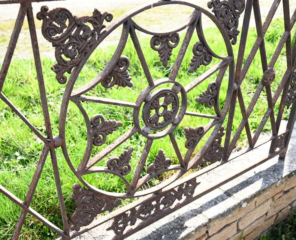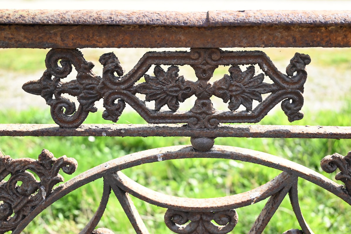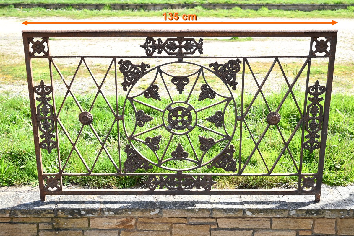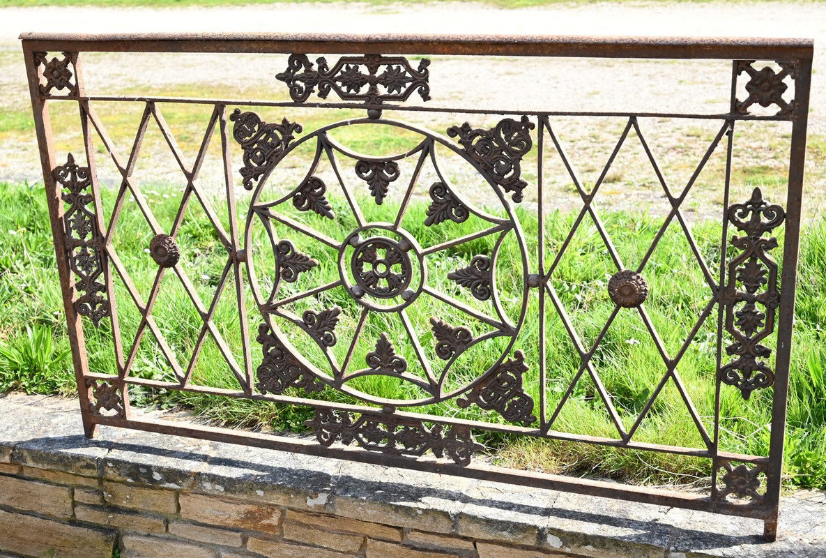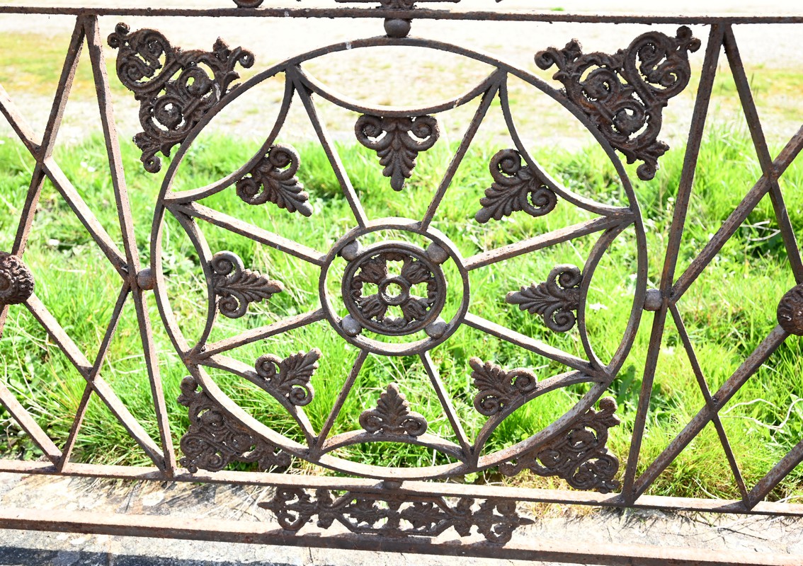 Ce garde-corps présente de nombreux décors complexes en fonte tels que des rosaces, des fleurs de lys ou des volutes.