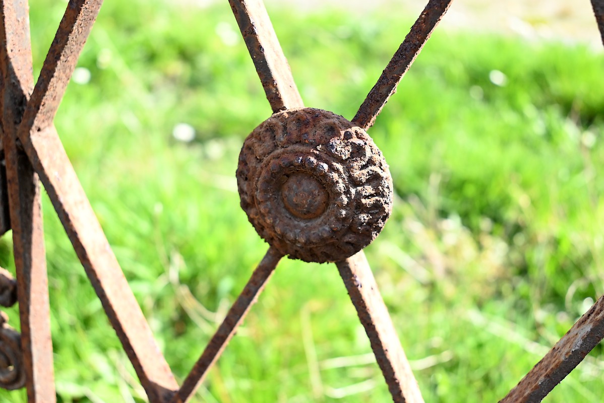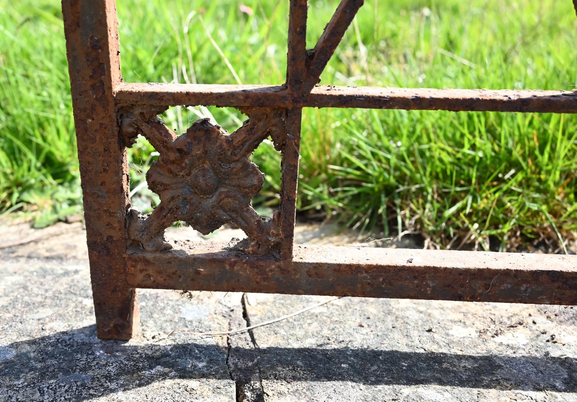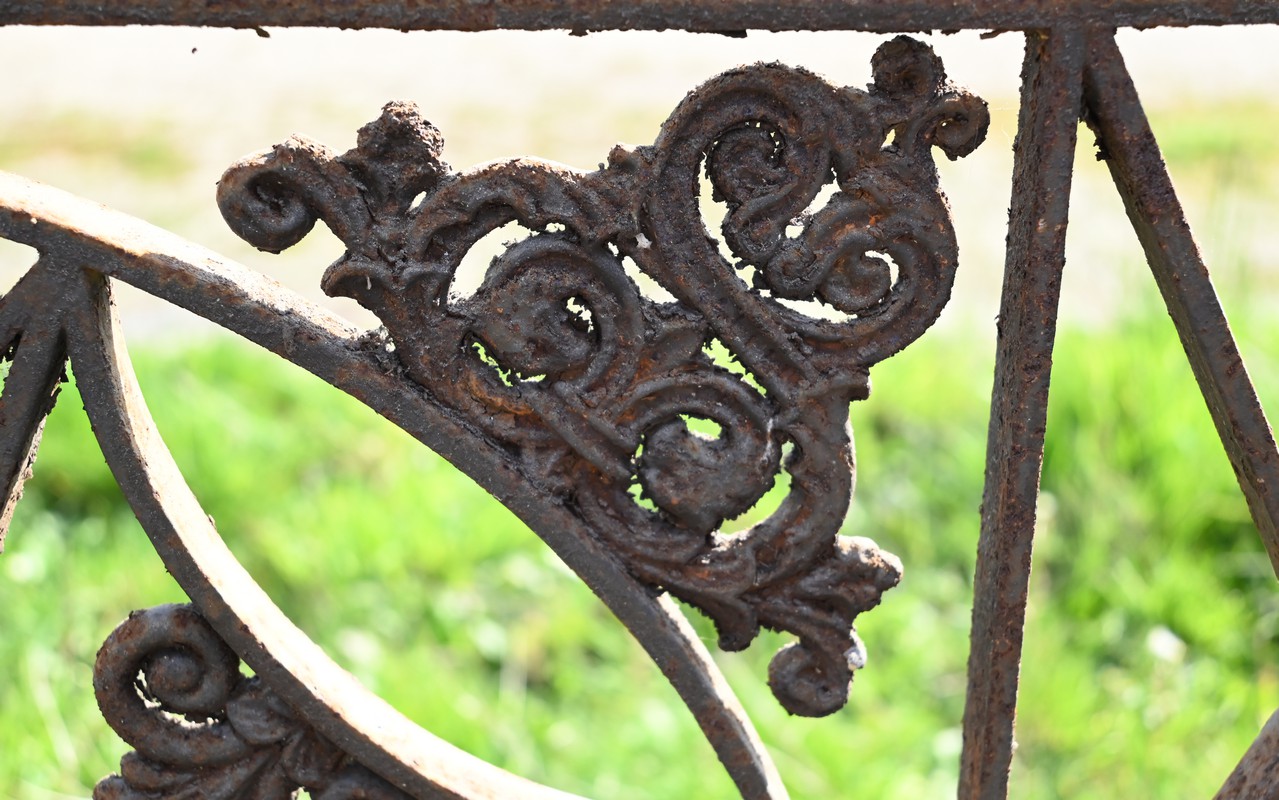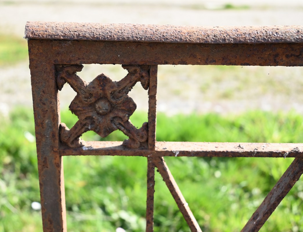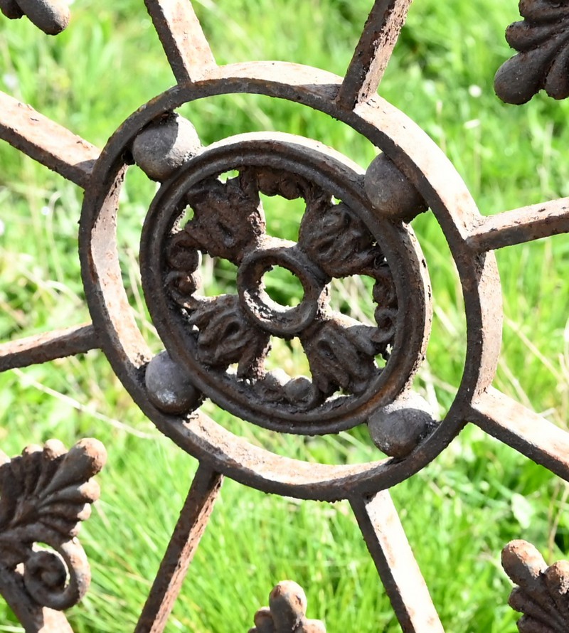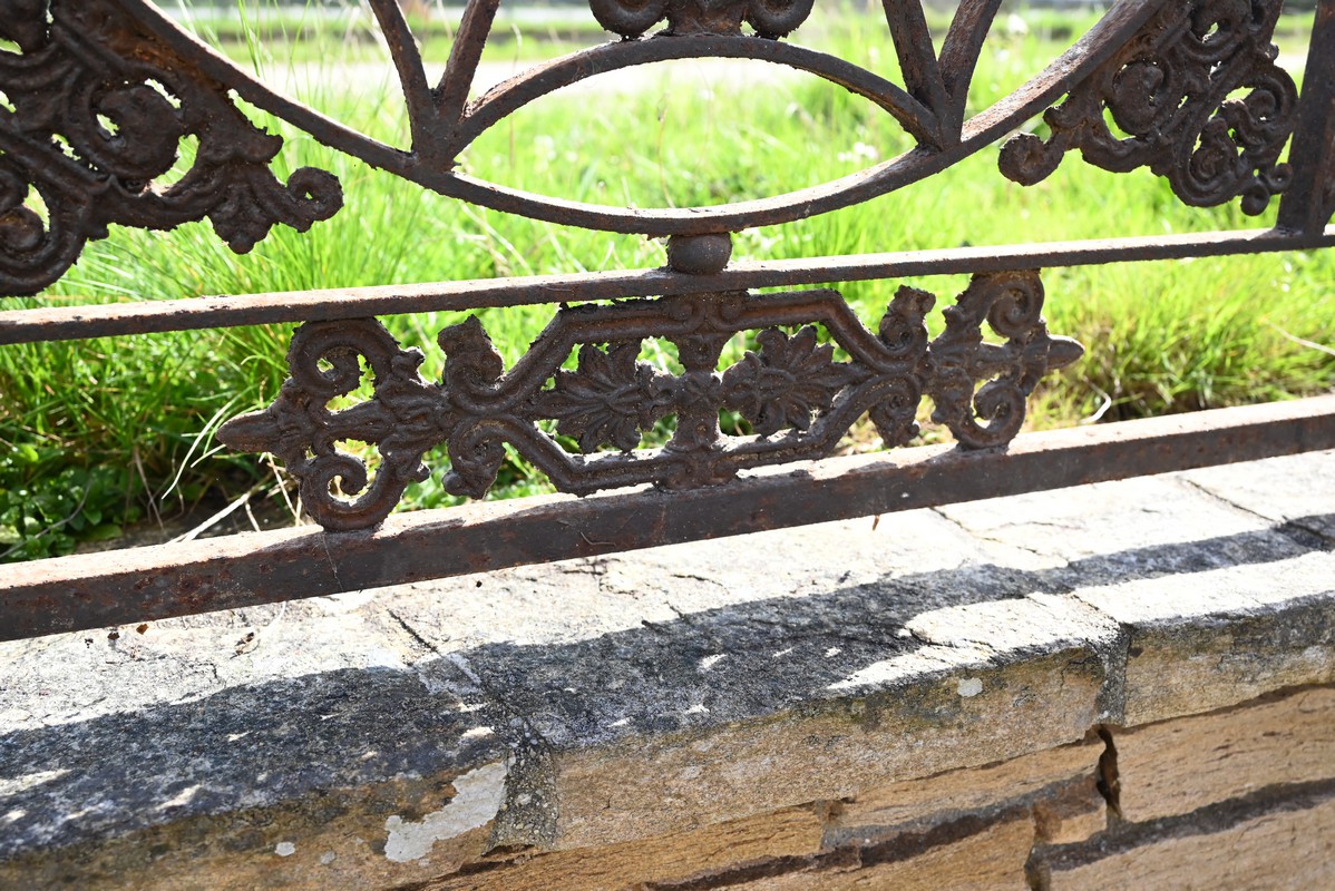 Ce garde-corps présente de nombreux décors complexes en fonte tels que des rosaces, des fleurs de lys ou des volutes.
