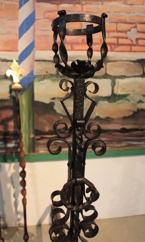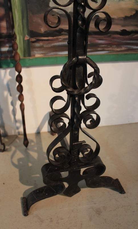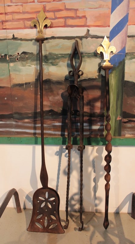 Paire de landiers en fer forgé avec les accessoires de cheminée.