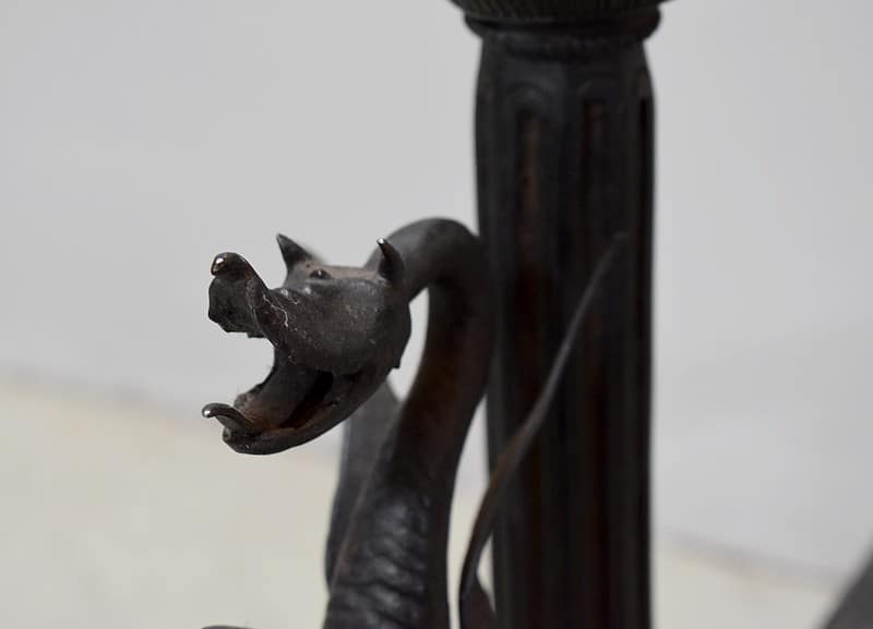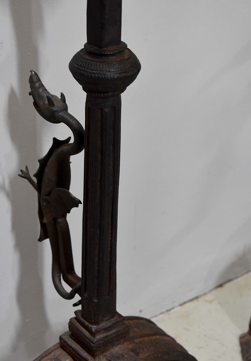 Ils sont ornés de petits dragons accrochés aux montants, lesquels sont surmontés d’une boule en bronze moulé à décors de masques de personnages.