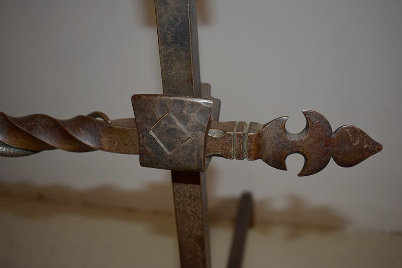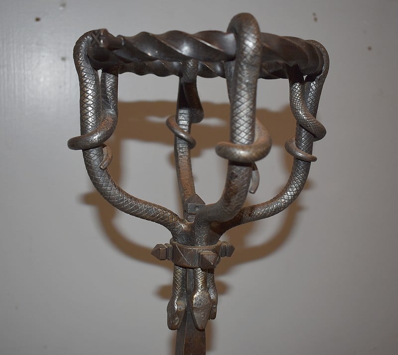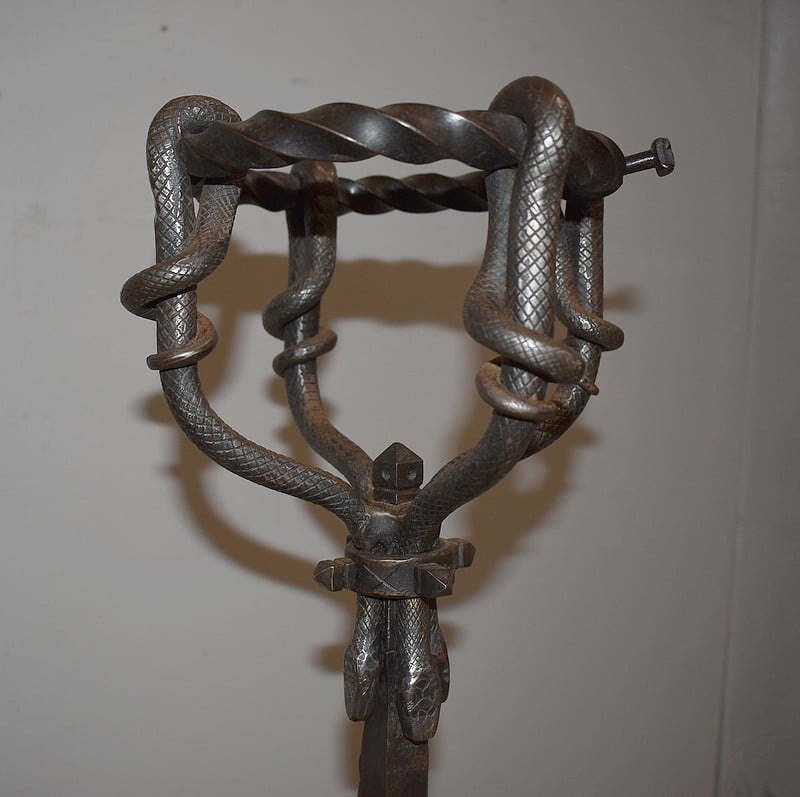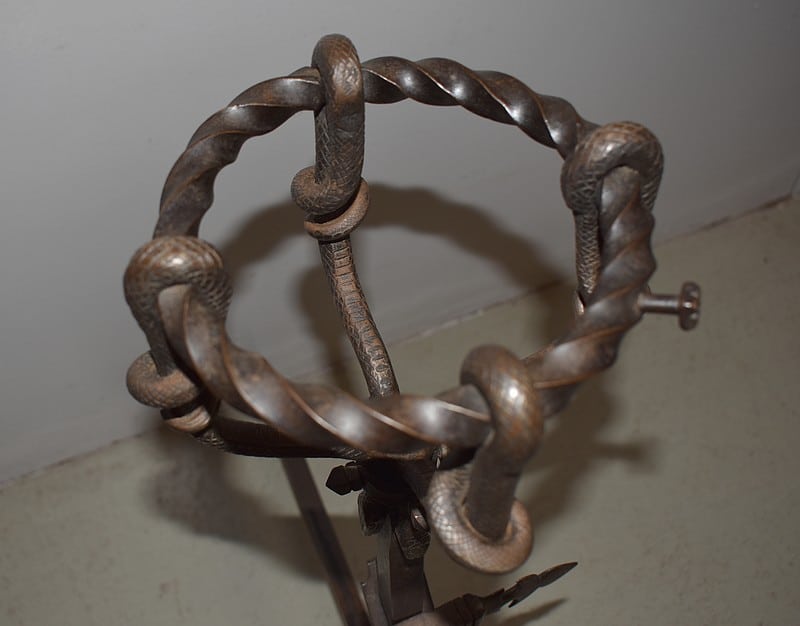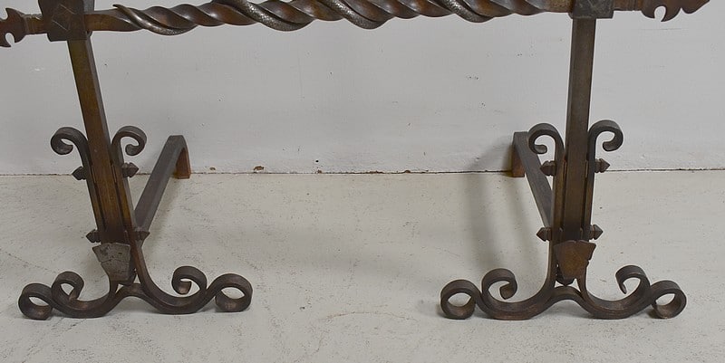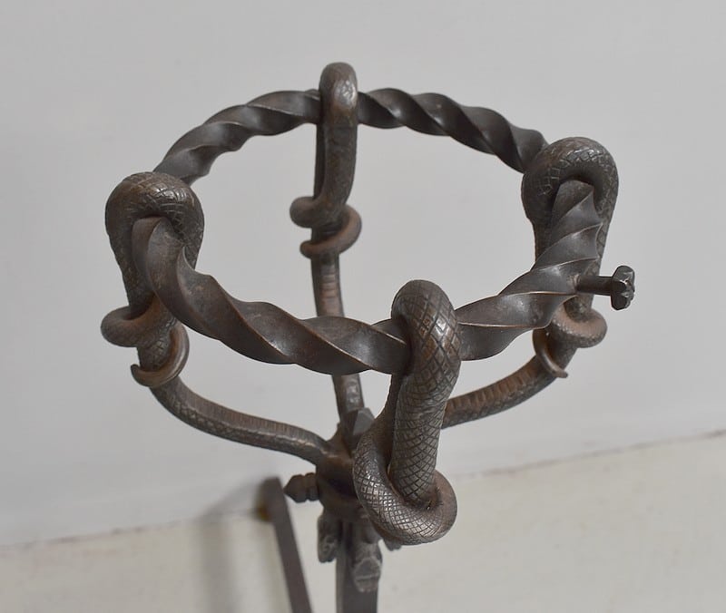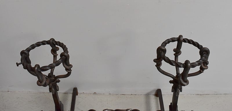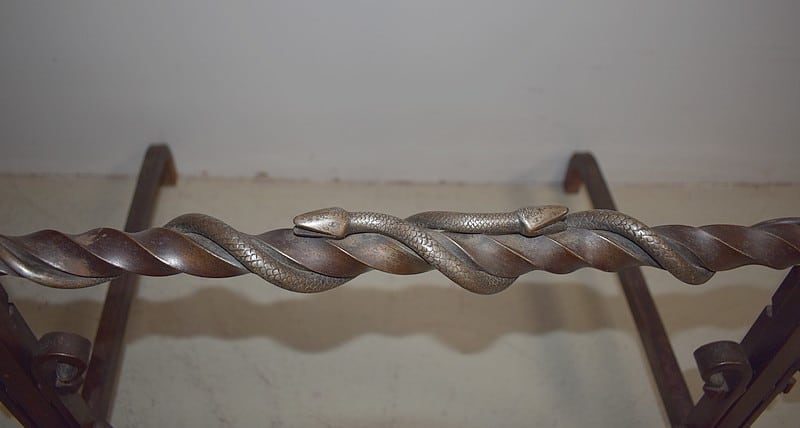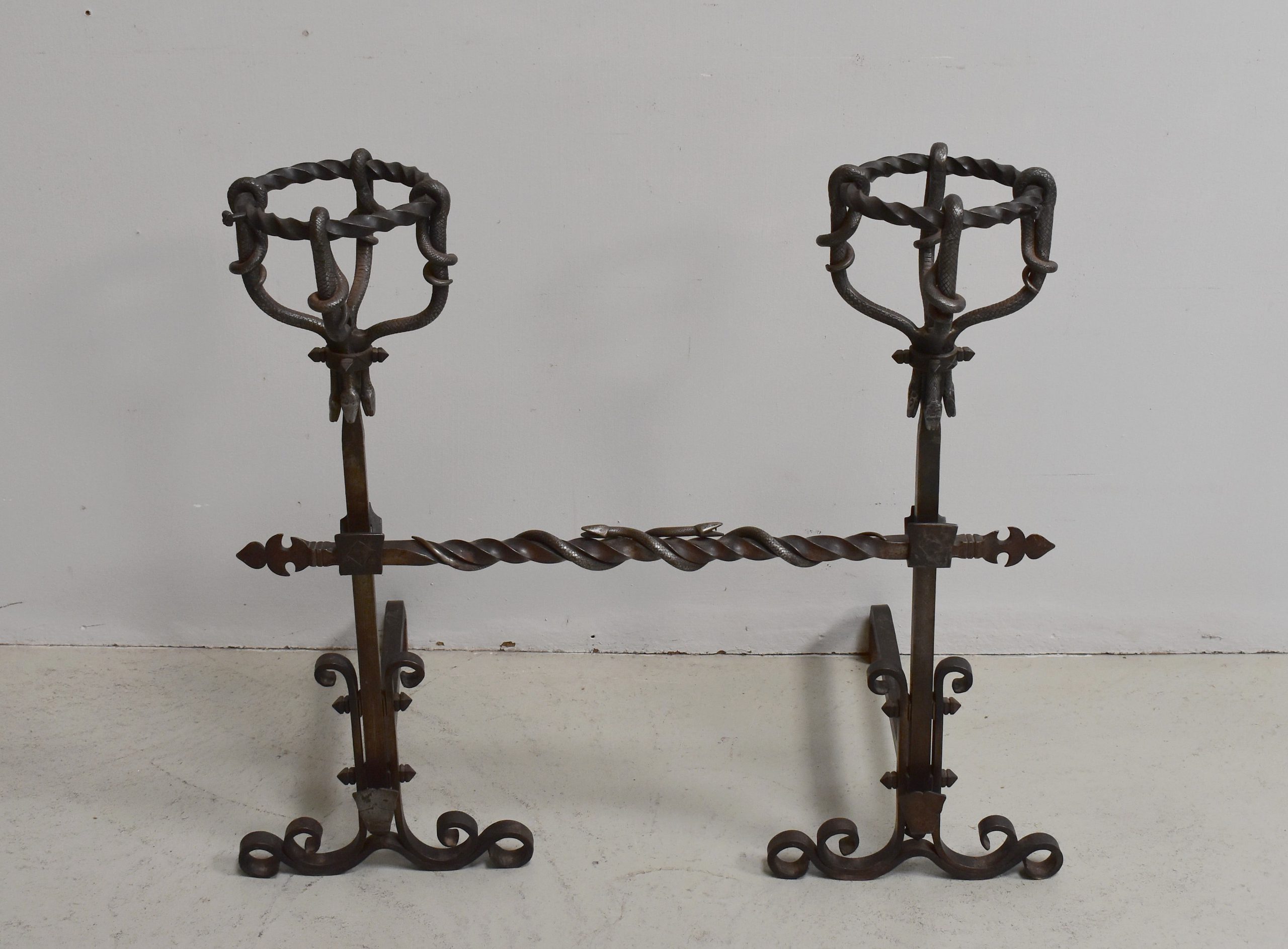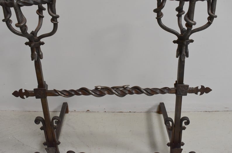 Paire de chenets en fer forgé torsadé, à décors de serpents, de style Renaissance.