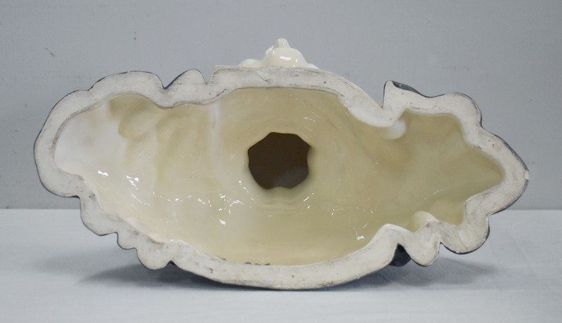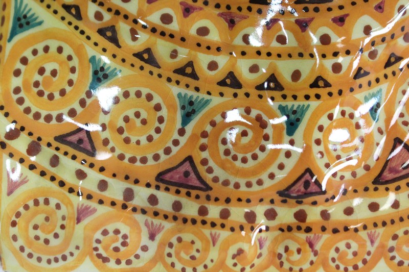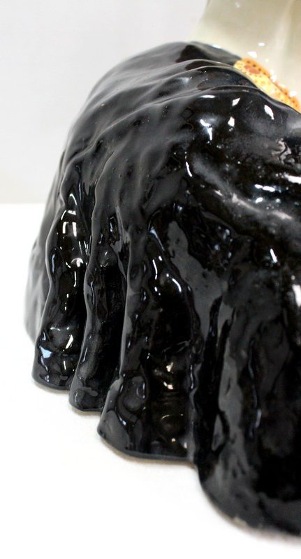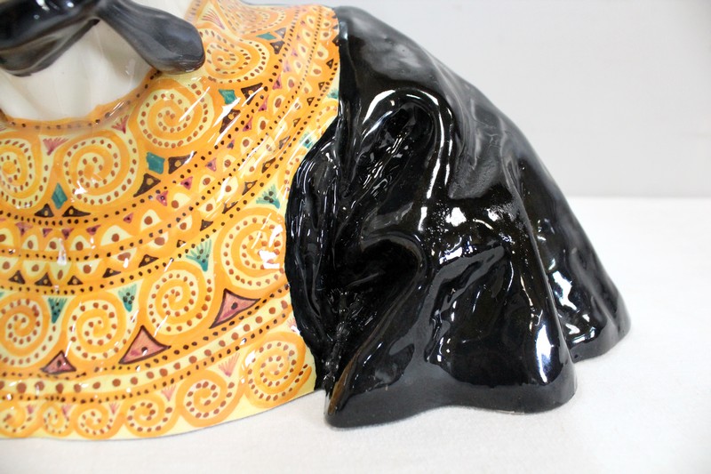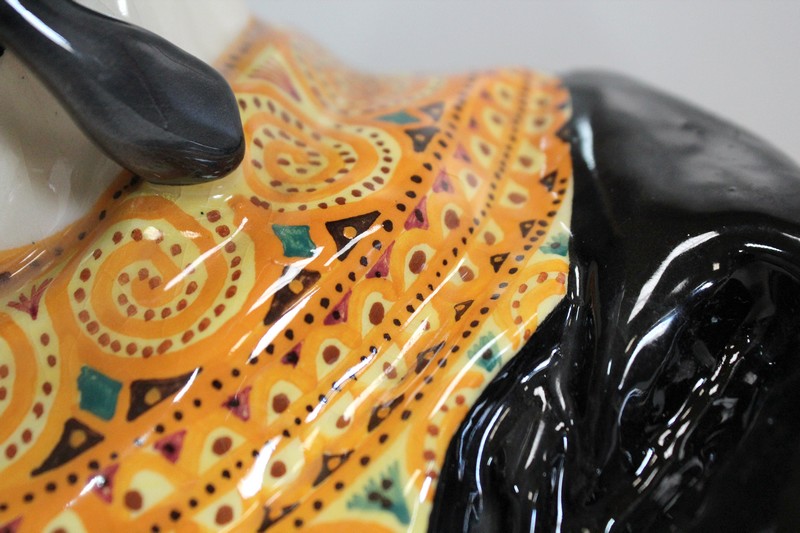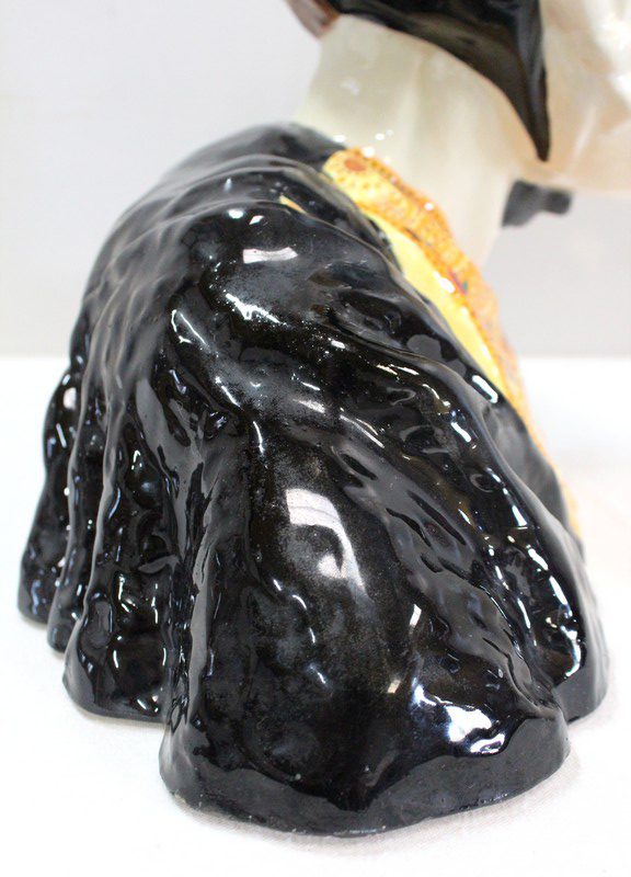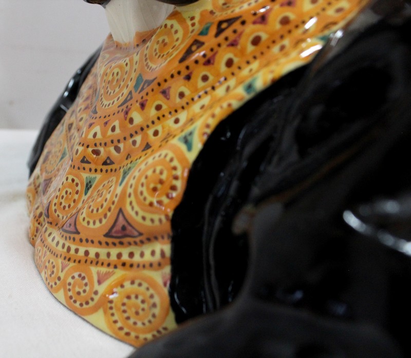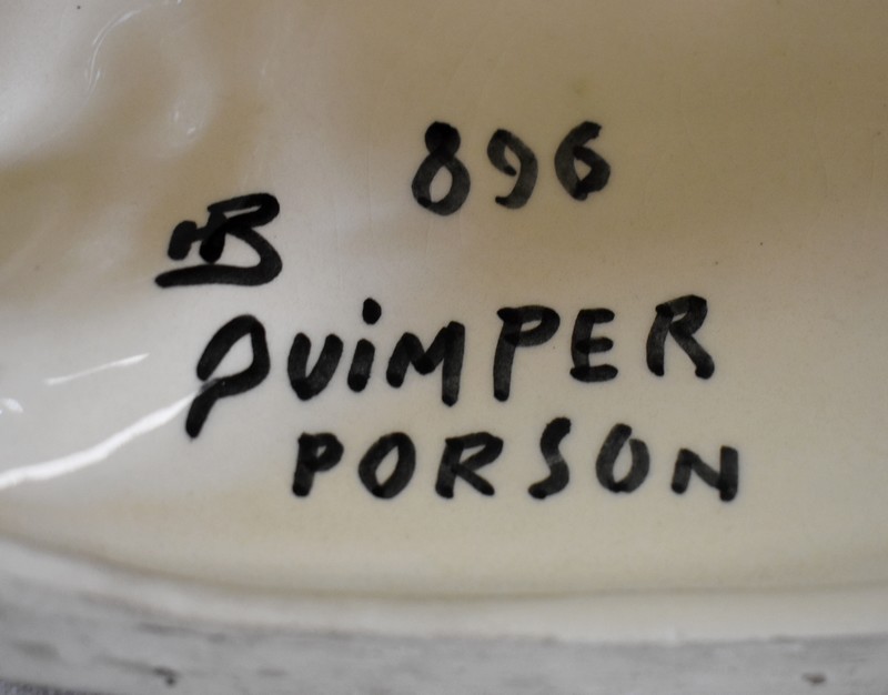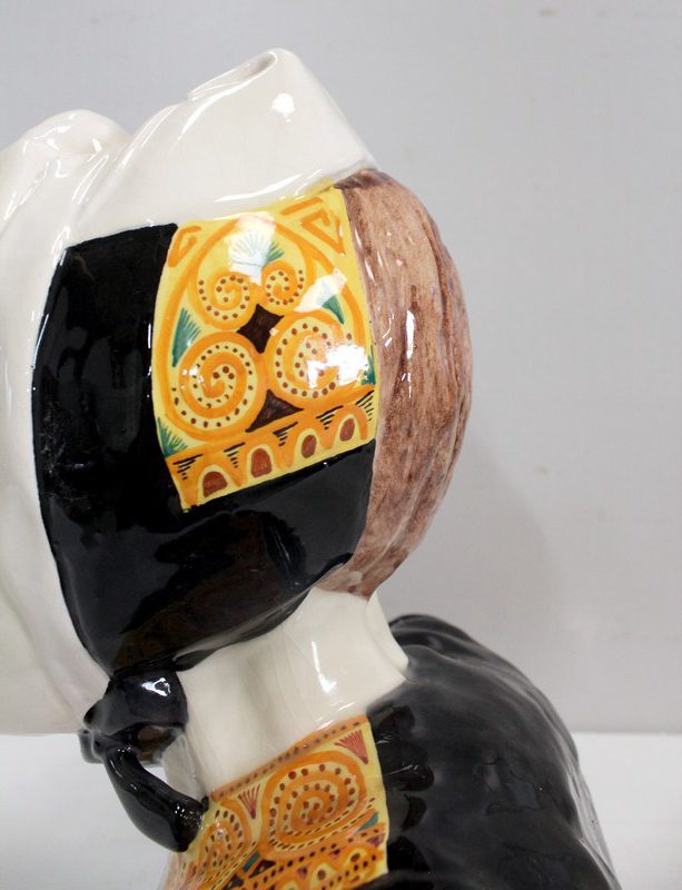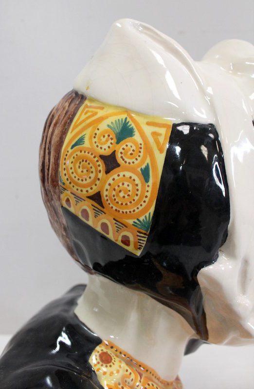Le Sujet porte l’habit et la coiffe traditionnels de la région de Pont-L’Abbé, identifiables par leurs Broderies aux Chatoyantes Couleurs. Ces Décors en relief, inspirés des dentelles caractéristiques du pays Bigouden, sont d’ailleurs une innovation de la Faïencerie Quimpéroise : elle lance le « Décor Broderie » à la fin de la Première Guerre Mondiale.