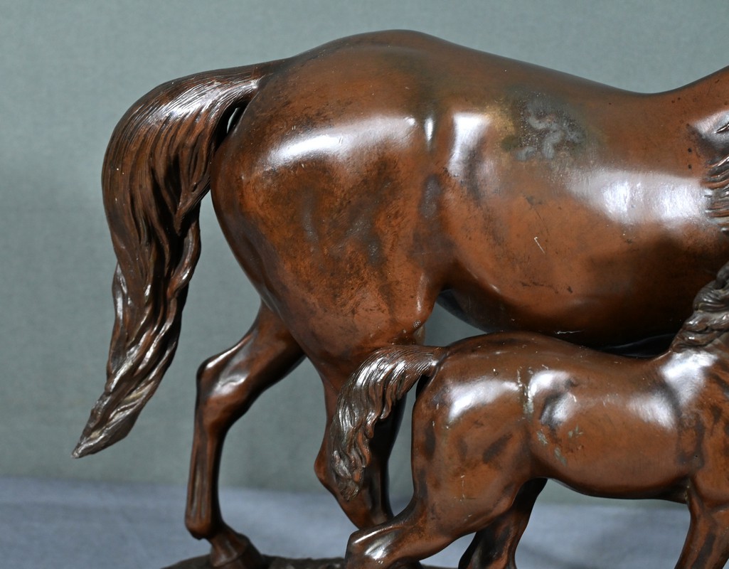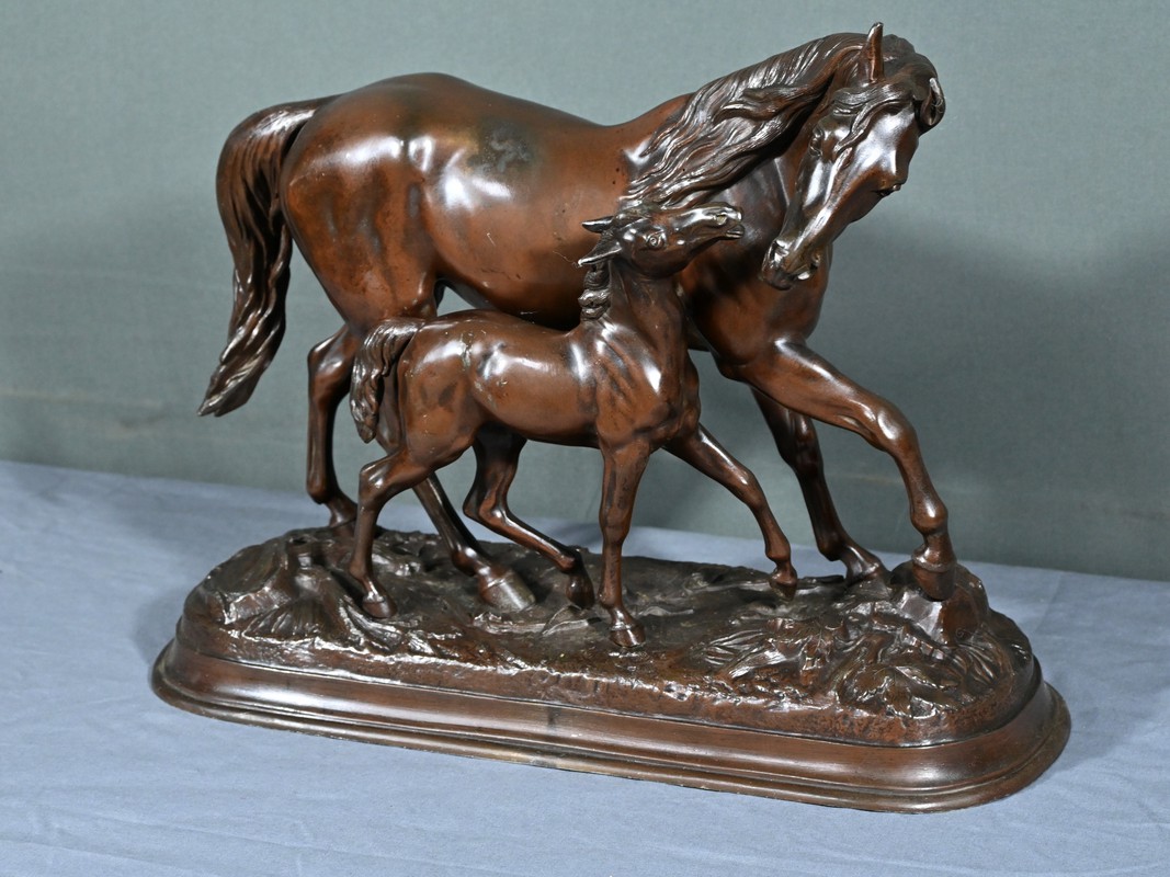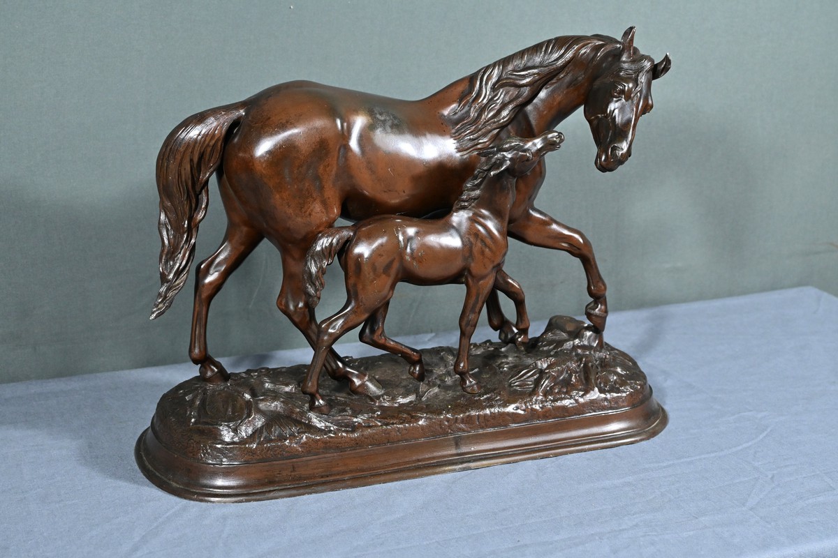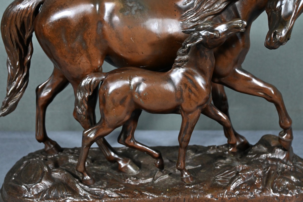 Elle représente avec une grande finesse et un réalisme saisissant une jument accompagnée de son poulain, capturant la grâce et la tendresse de ce duo équin en mouvement.