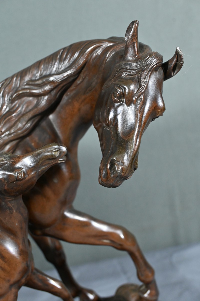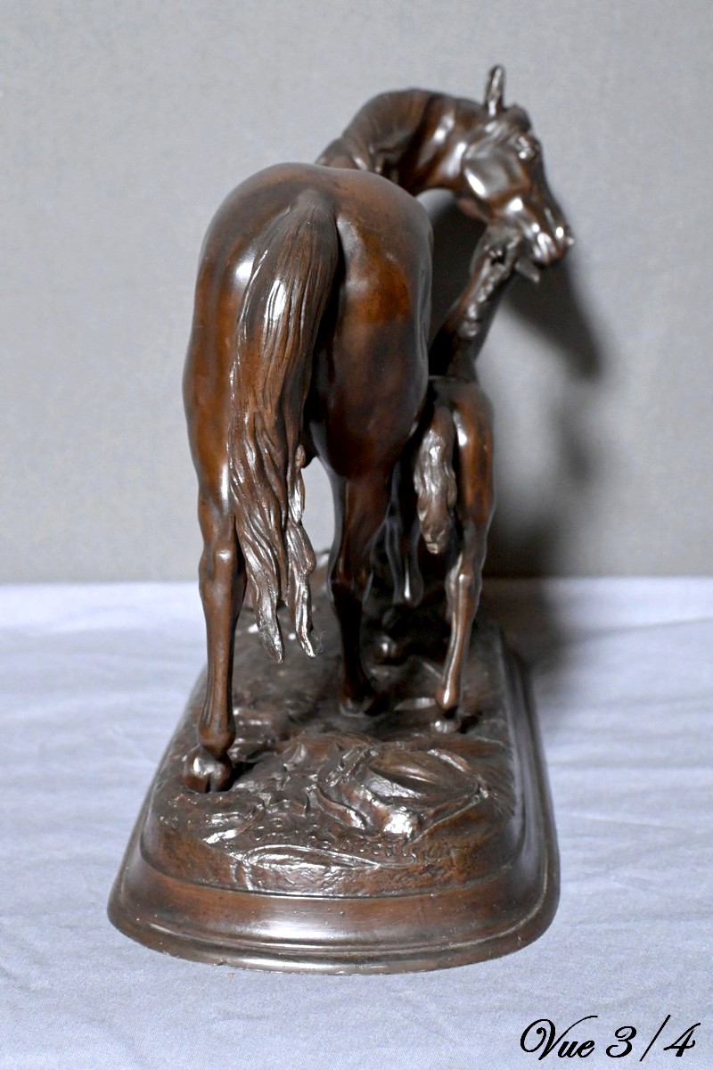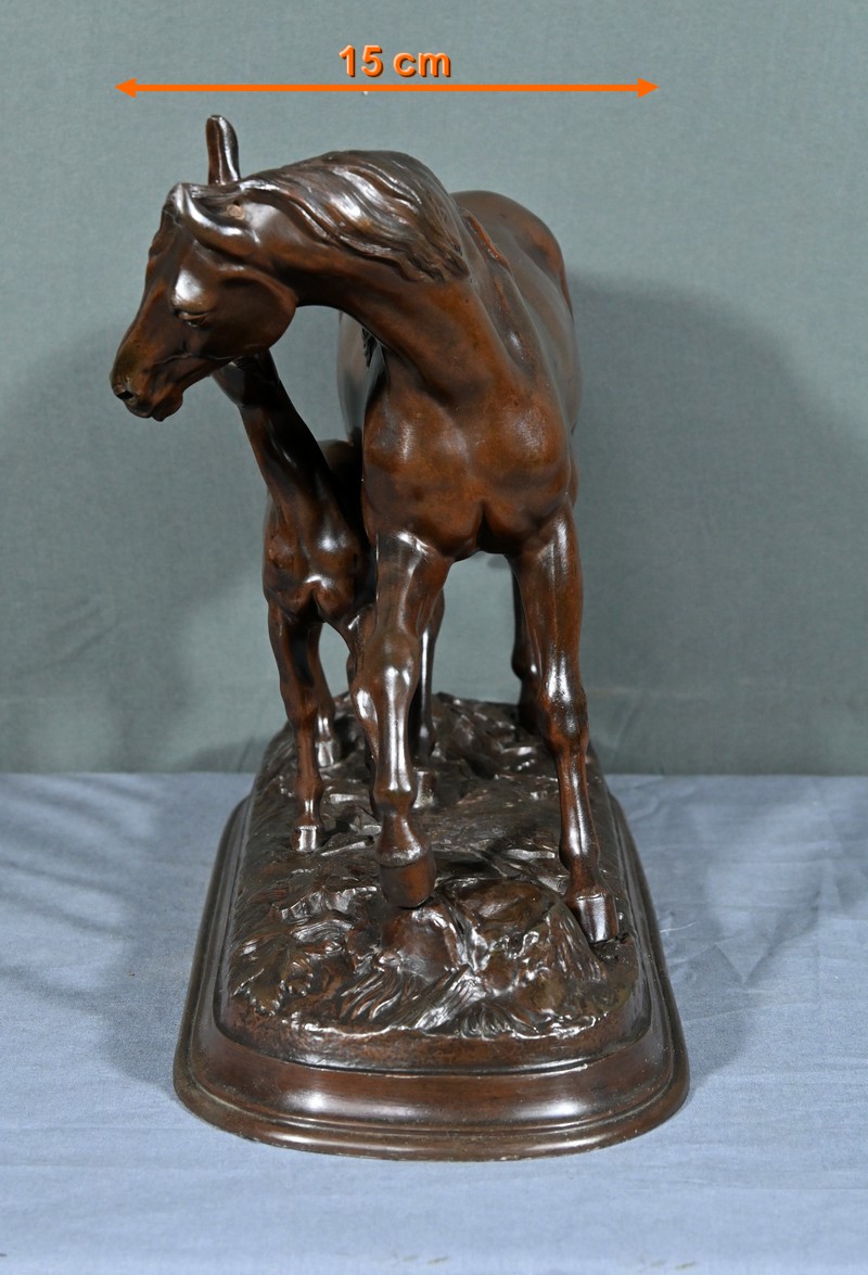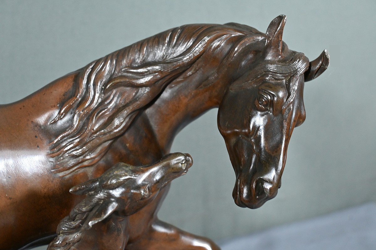 Elle représente avec une grande finesse et un réalisme saisissant une jument accompagnée de son poulain, capturant la grâce et la tendresse de ce duo équin en mouvement.