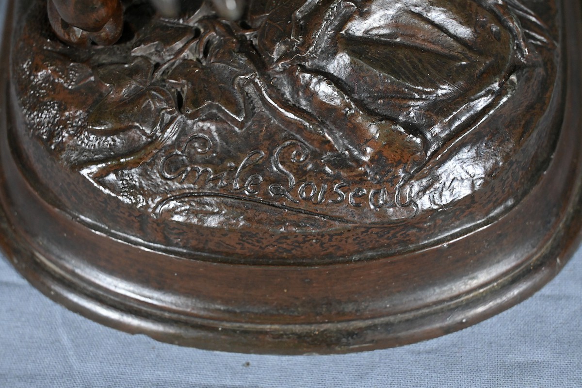 La signature d’Émile Loiseau, artiste reconnu pour son talent à immortaliser la beauté des animaux, est clairement visible sur la base de l’œuvre.