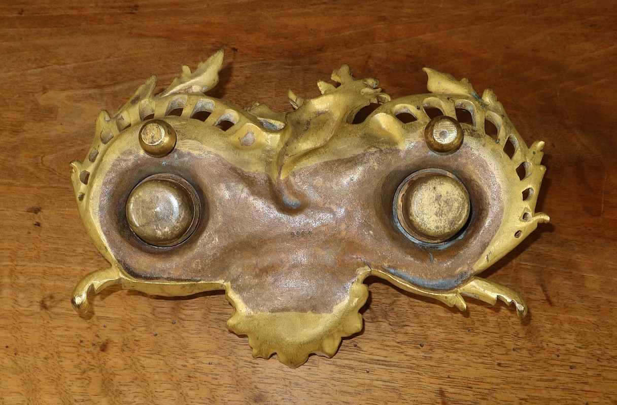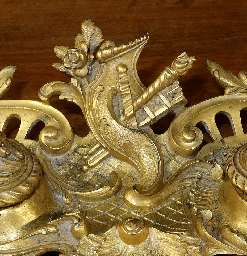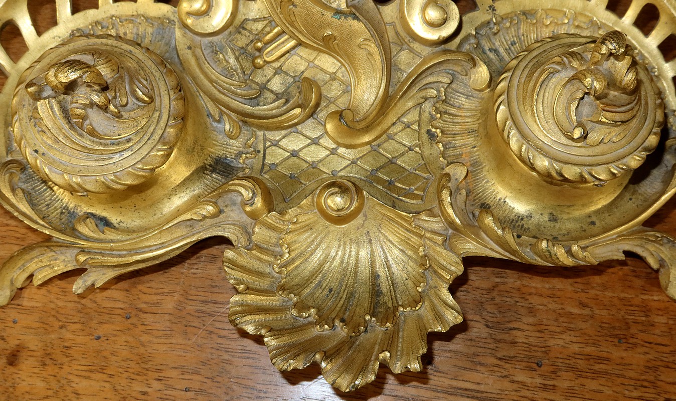 Encrier en bronze doré de style Louis XV muni de deux réceptacles à encre, avec couvercles en dôme feuillagé, figurant des rinceaux, des volutes et des coquilles. Sur le dessus, une partie plane grillagée permet d’accueillir de petits accessoires d’écriture. Finement sculpté, cet encrier est sommé d’un flambeau et d’un carquois rempli de flèches accompagnés d’une rose et de ses feuilles.