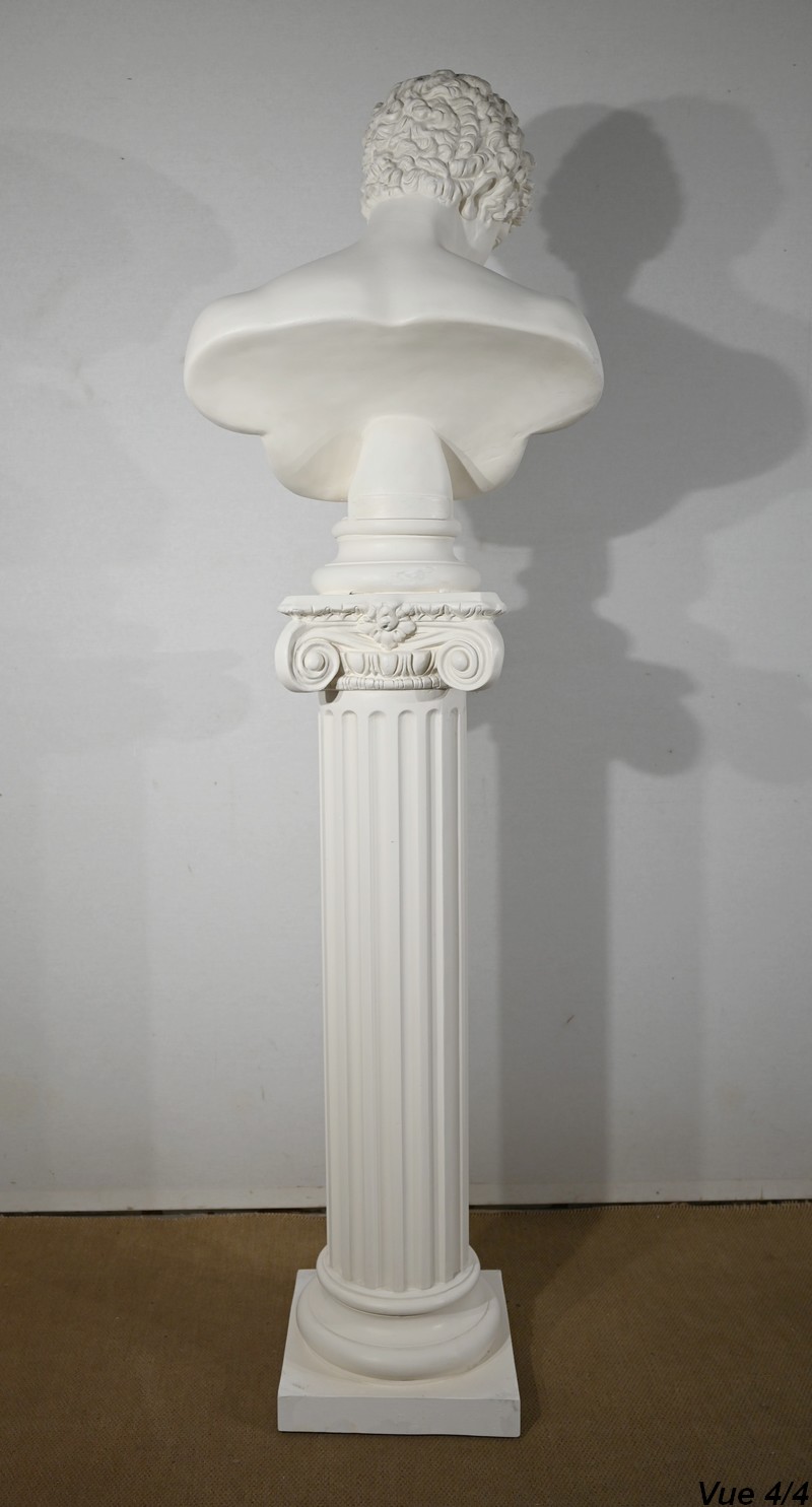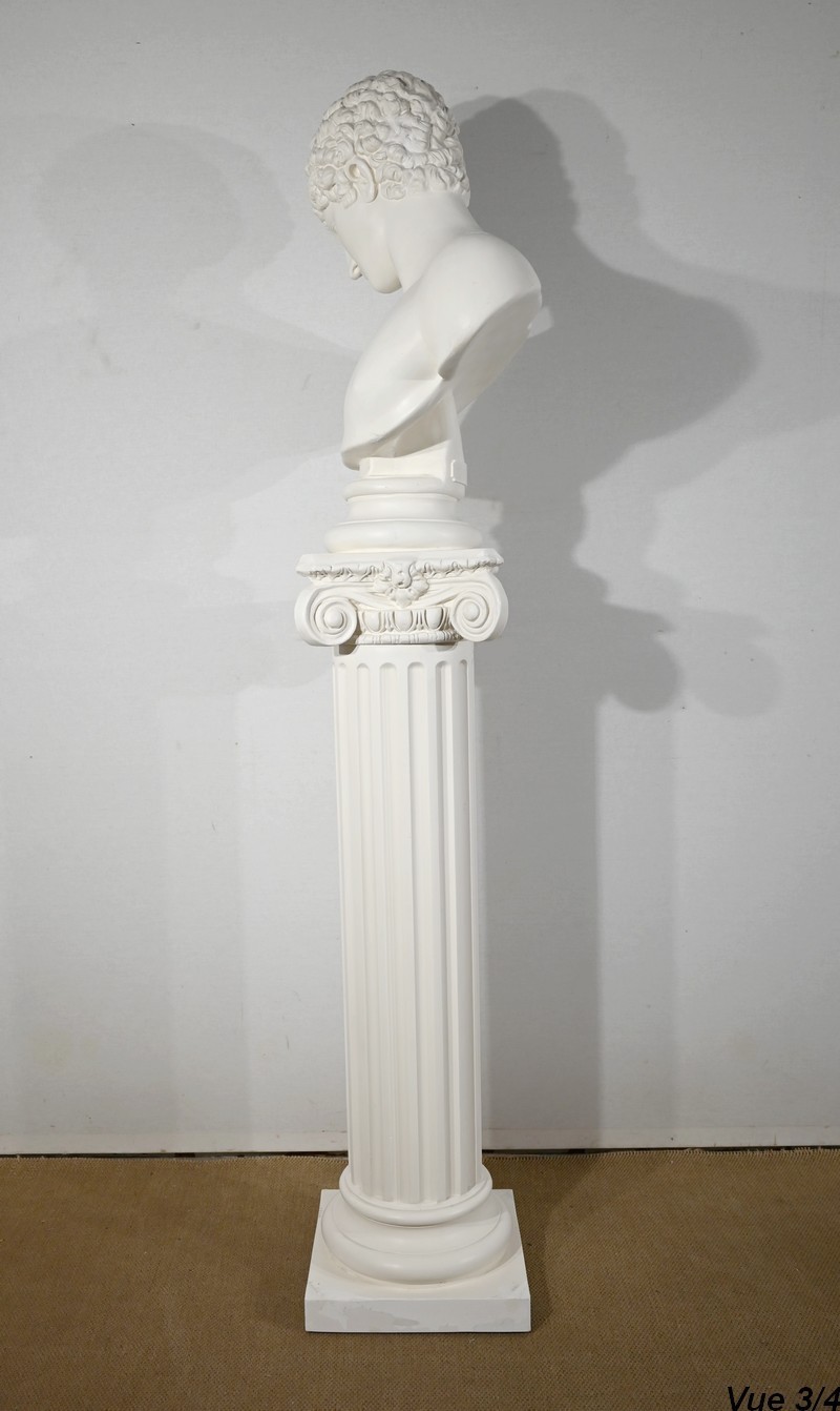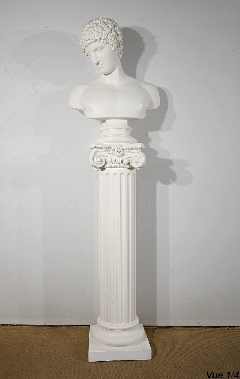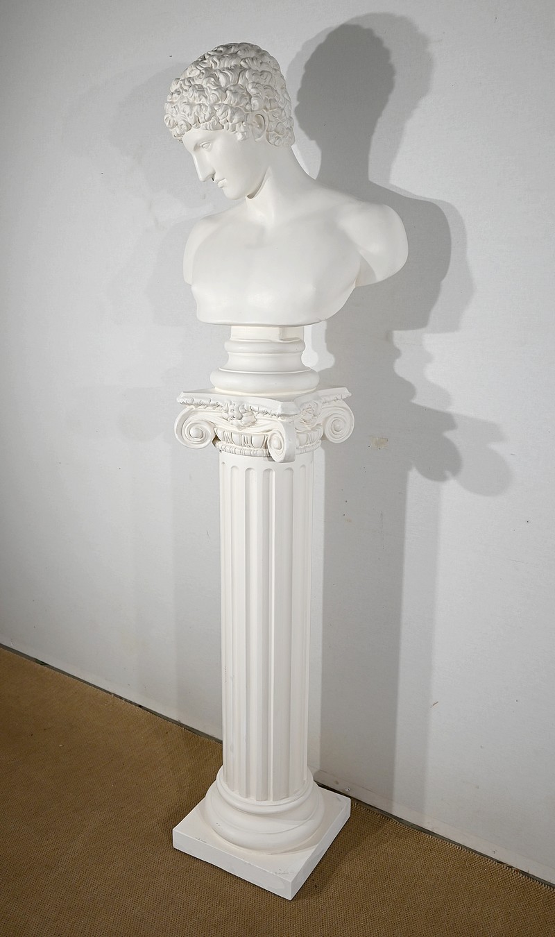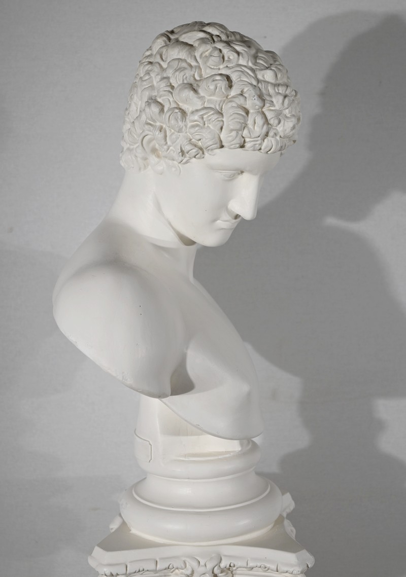 Ensemble en plâtre, buste d’Antinoüs du Capitole sur colonne, sculpté d’un seul bloc.