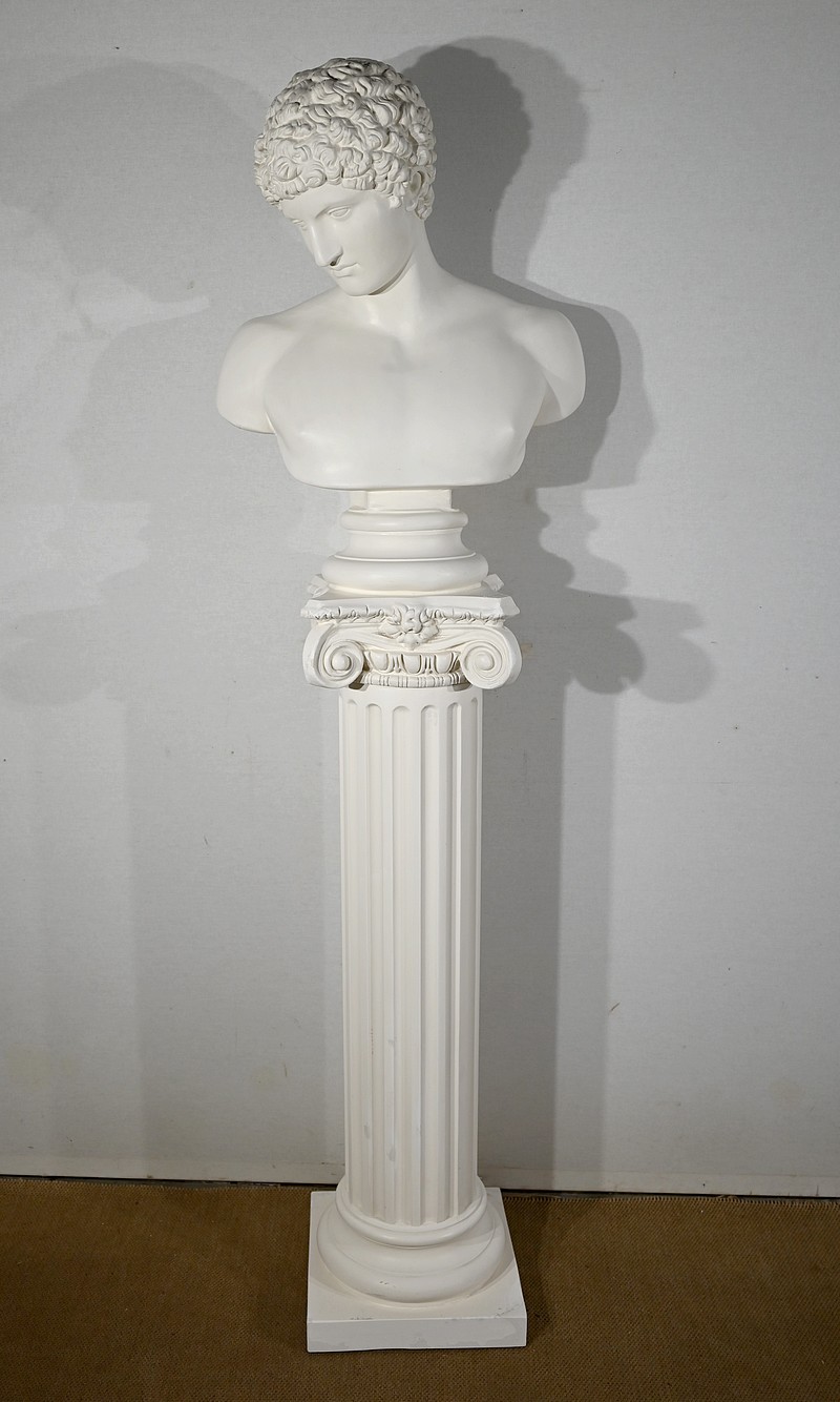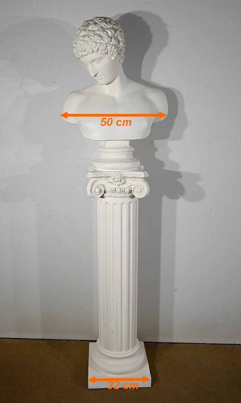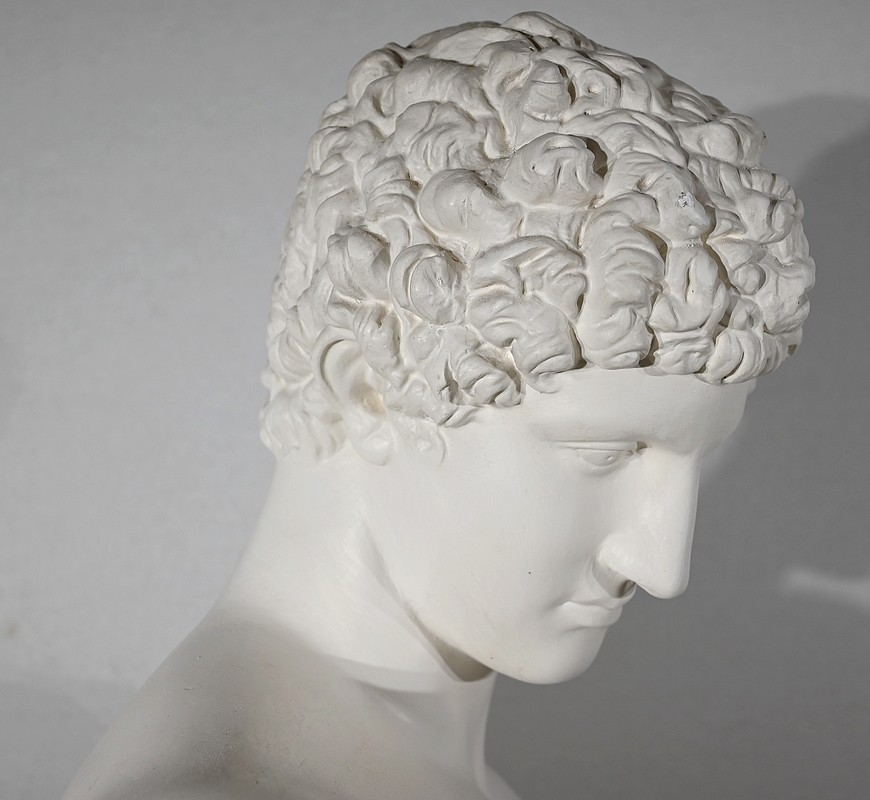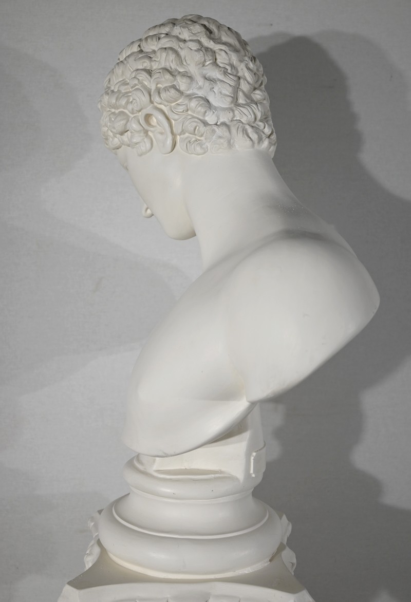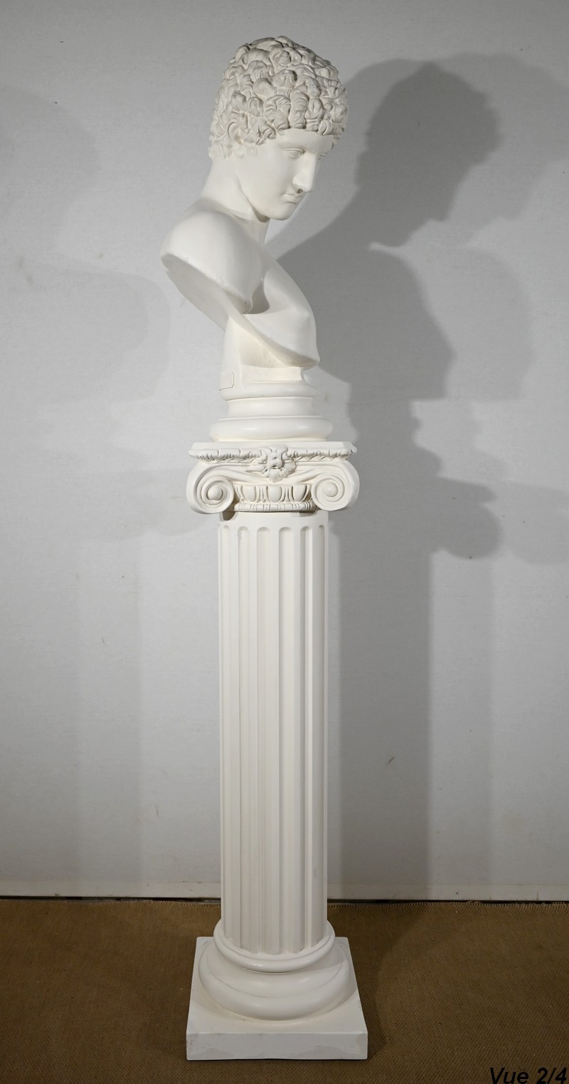 Ensemble en plâtre, buste d’Antinoüs du Capitole sur colonne, sculpté d’un seul bloc.