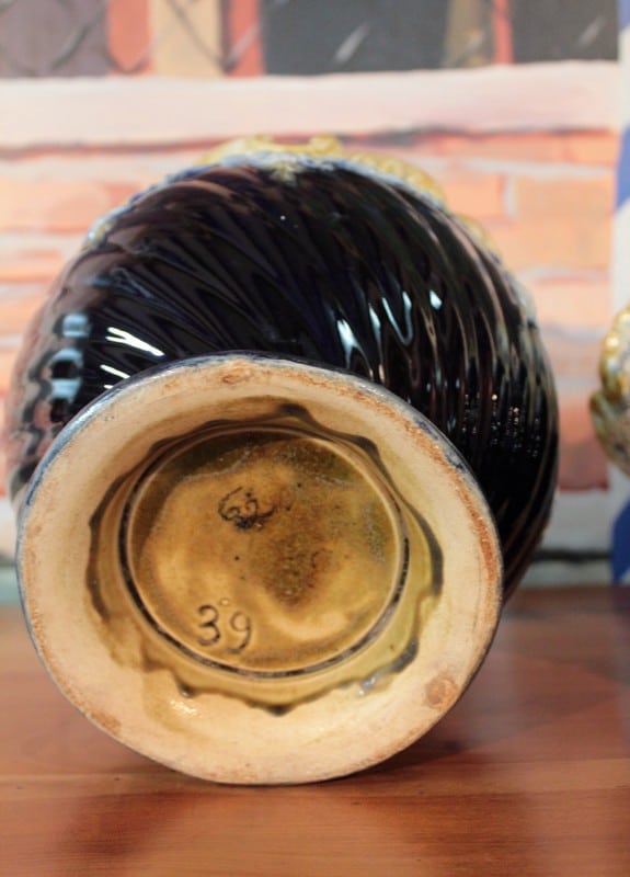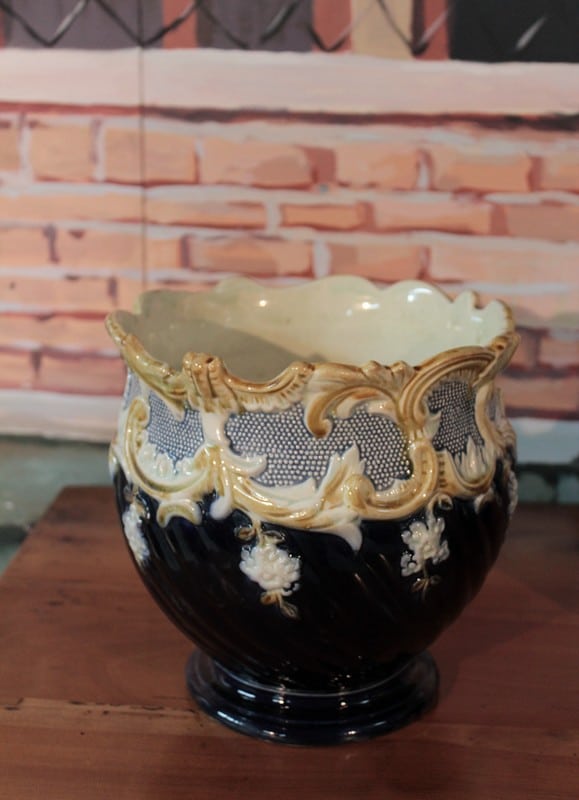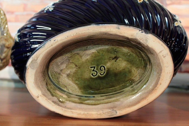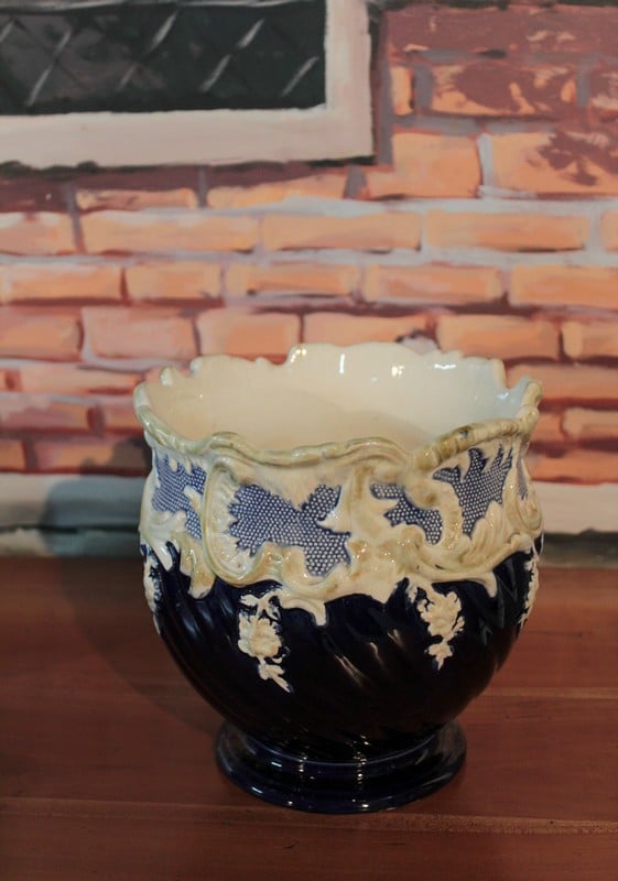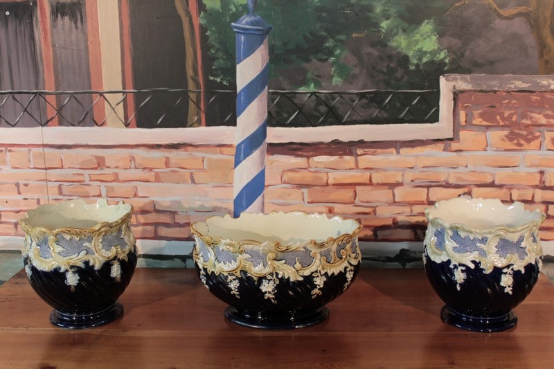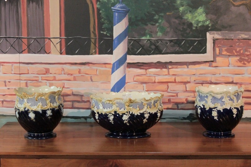 Garniture de cheminée composée d’une jardinière et de deux cache-pots en barbotine. Couleur bleu ‘nuit’ dominante et ornementations dans les tons ivoire et jaune pâle. Fin XIXe