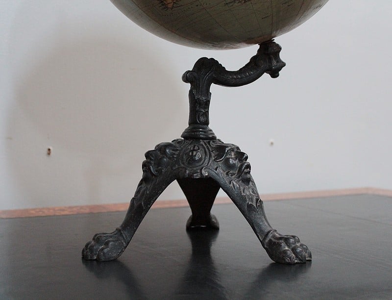 Cet article repose sur un pied tripode en fonte à représentations de grotesques et de pattes de lion.
