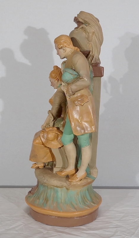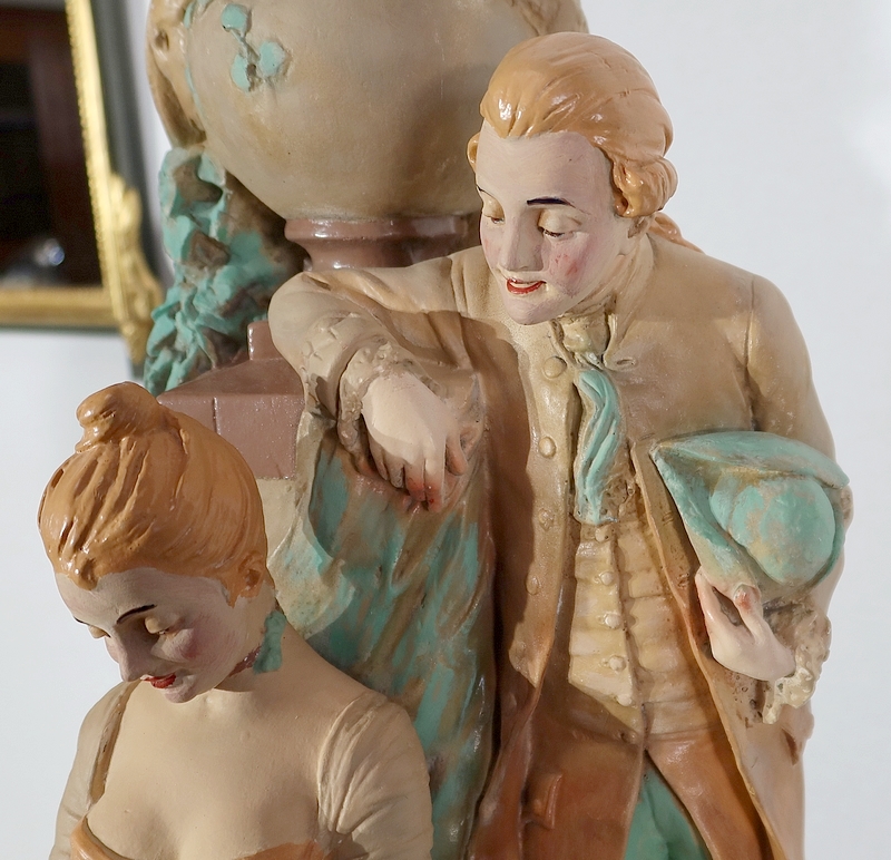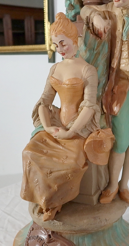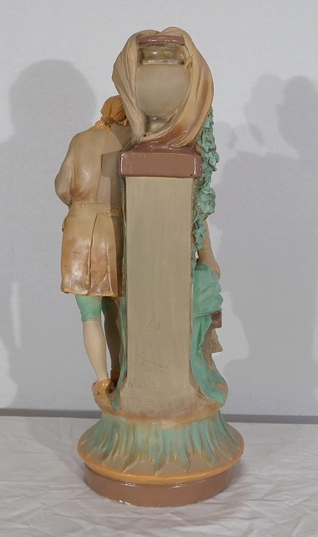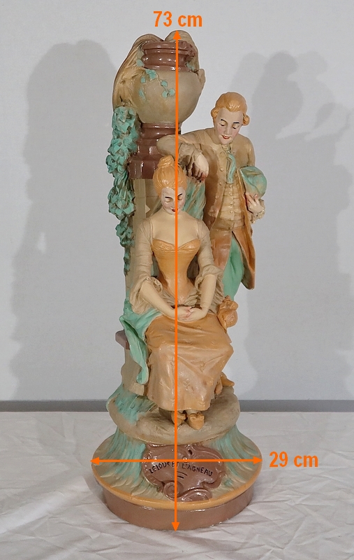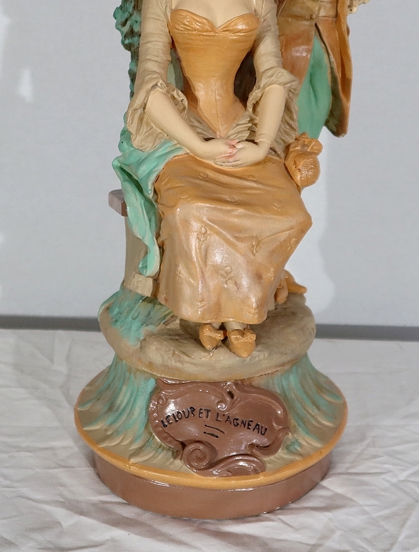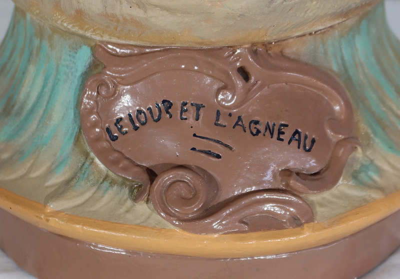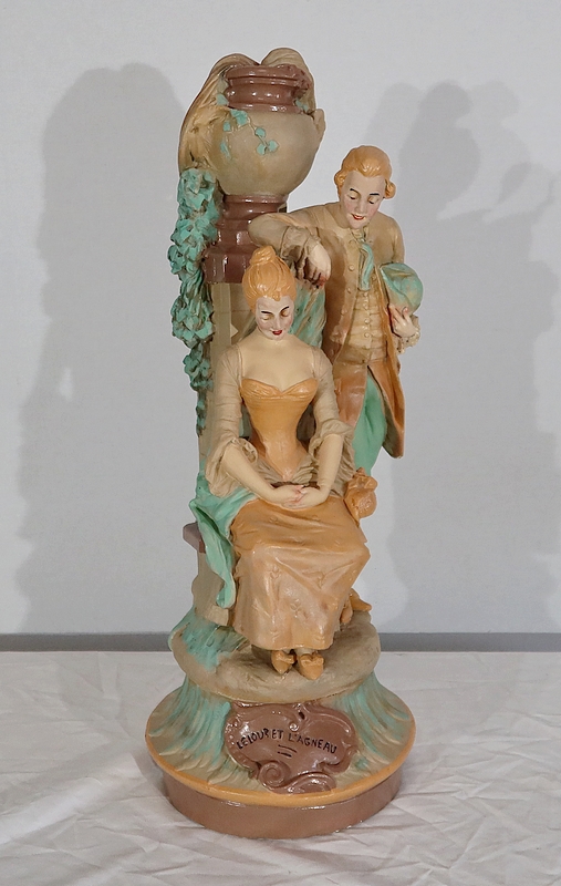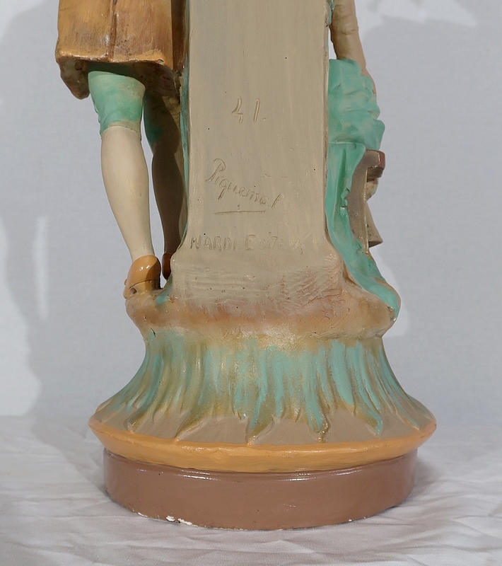 Important sujet représentant une jeune femme ingénue courtisée par un jeune homme. « Le loup et l’agneau » est une sculpture de François Alphonse Piquemal (1869-1911), élève de Cavelin, qui figura au salon et reçu la mention honorable en 1909. Il est également inscrit « Nardi Editeur » sur l’arrière de l’œuvre.