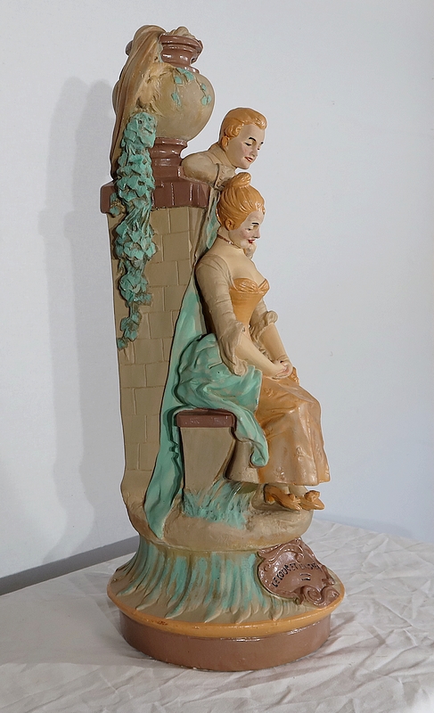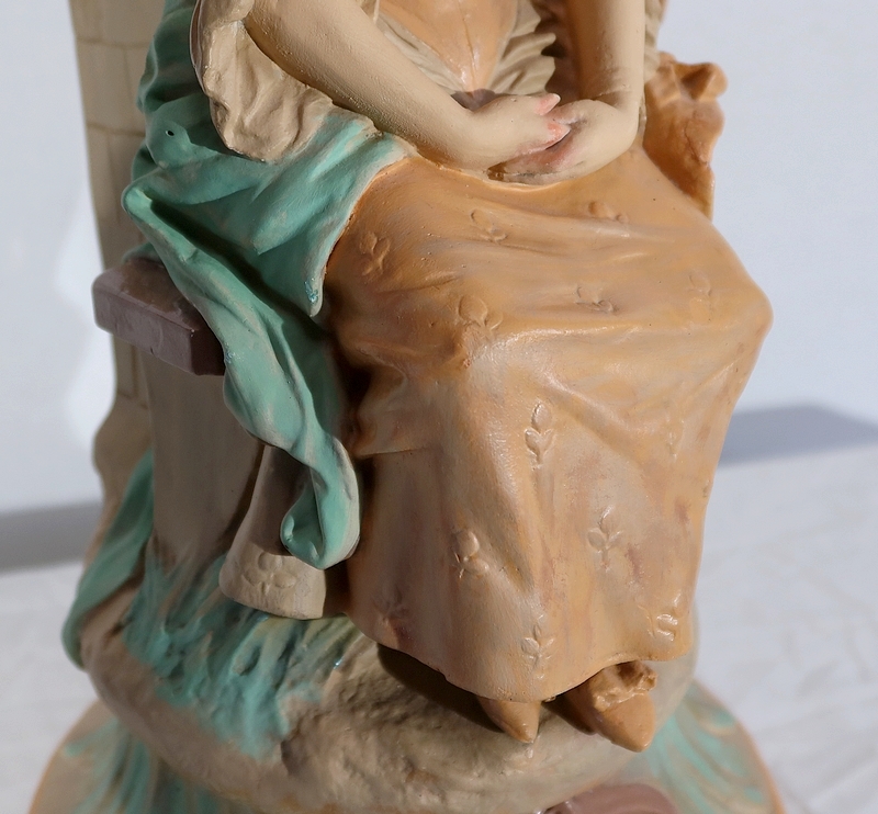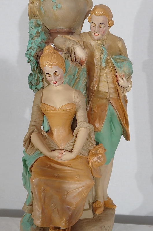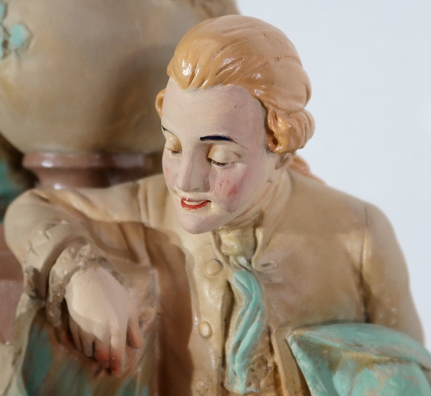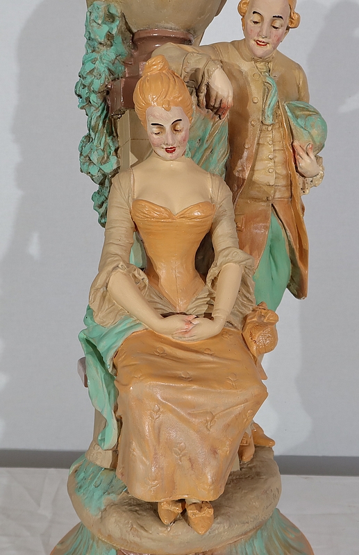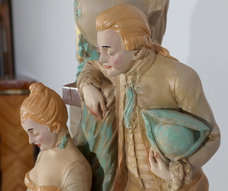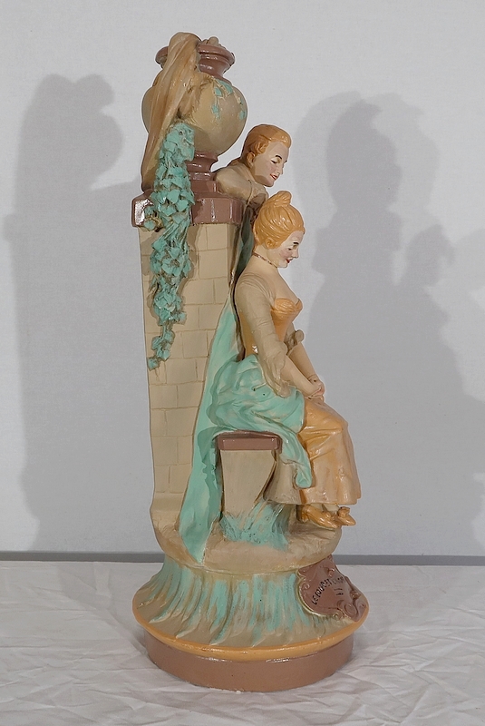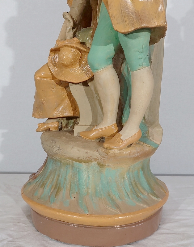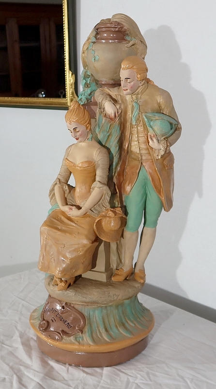 Important sujet représentant une jeune femme ingénue courtisée par un jeune homme. « Le loup et l’agneau » est une sculpture de François Alphonse Piquemal (1869-1911), élève de Cavelin, qui figura au salon et reçu la mention honorable en 1909. Il est également inscrit « Nardi Editeur » sur l’arrière de l’œuvre.