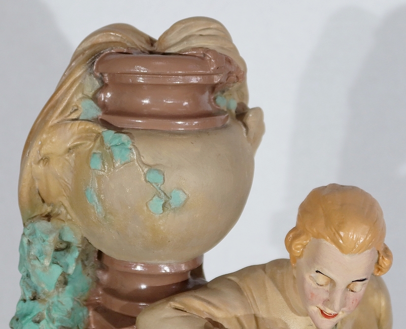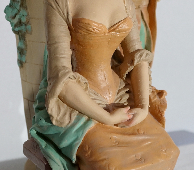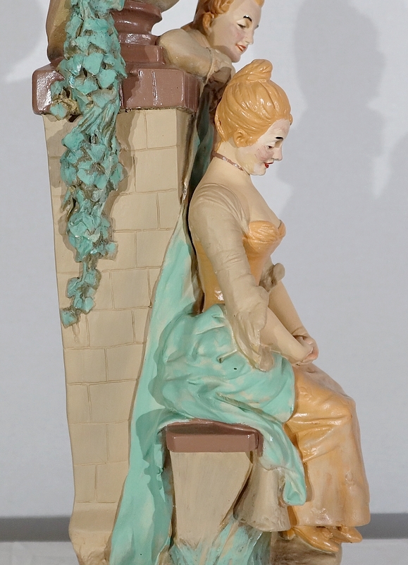Un homme se tient derrière elle, intéressé par la belle. Il lui fait sa cour se tenant nonchalamment contre un mur surmonté d’une vasque.