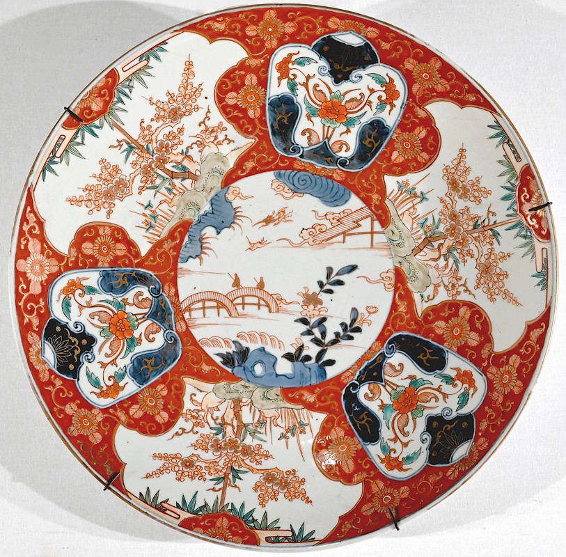 Sur fond rouge et or, les scènes végétalisées de ce plat sont dessinées de manière harmonieuse.