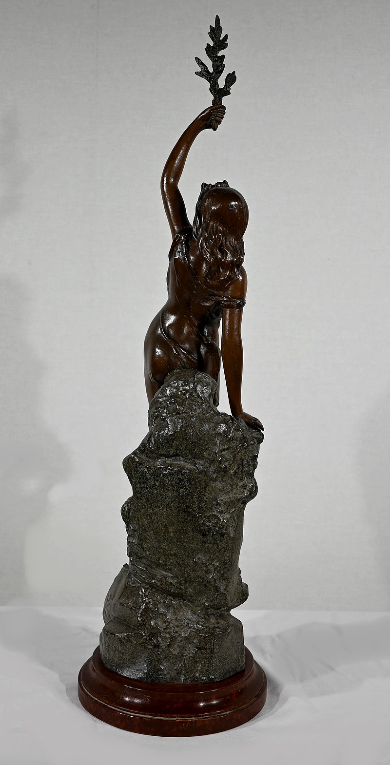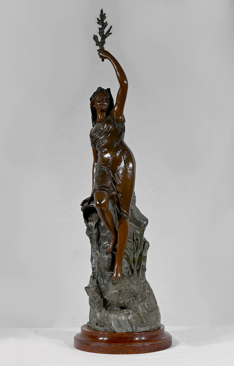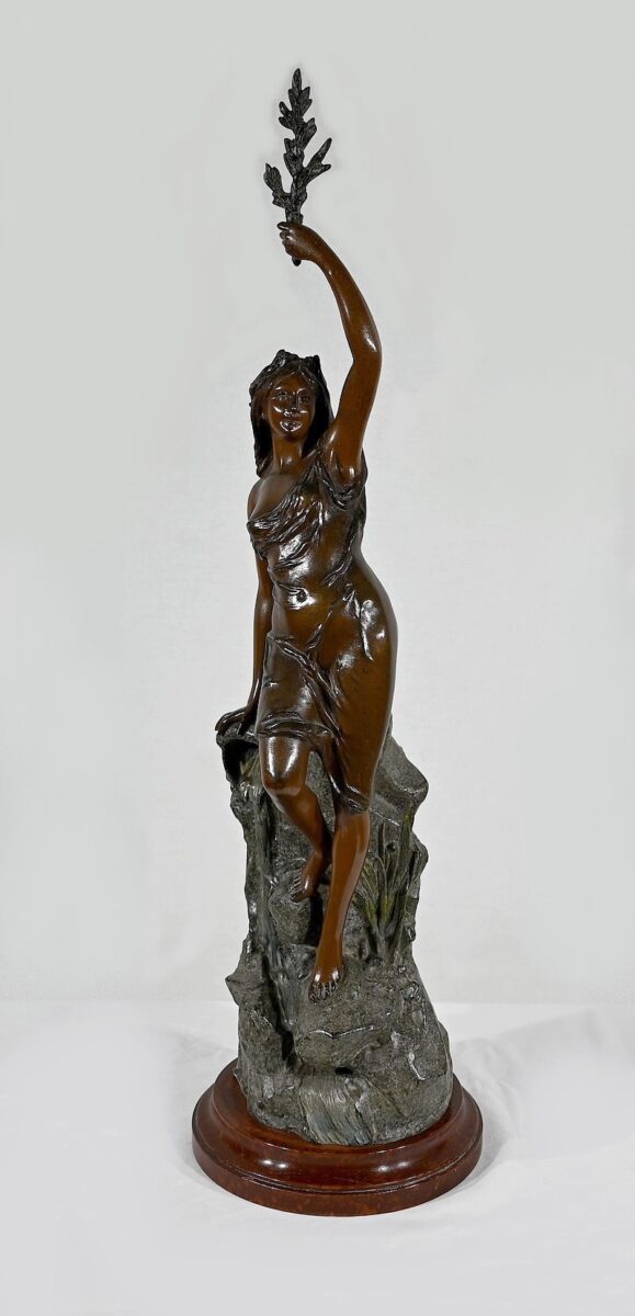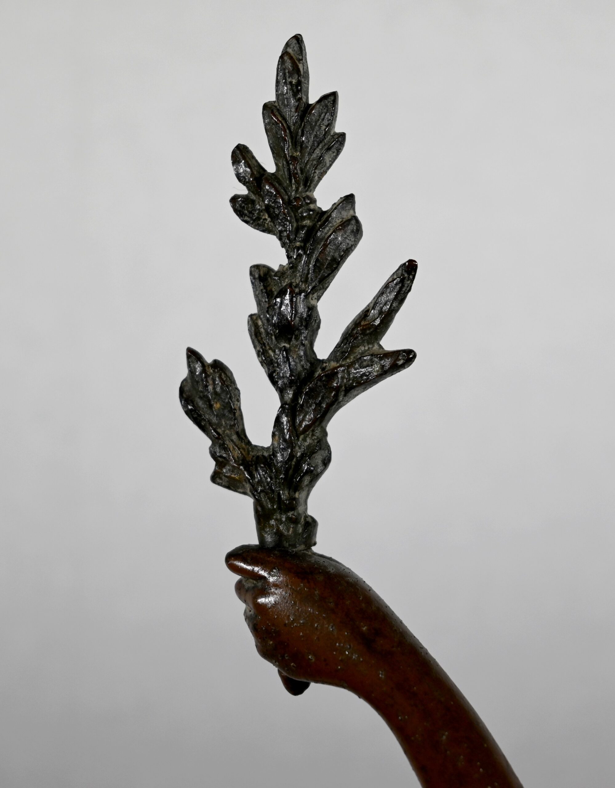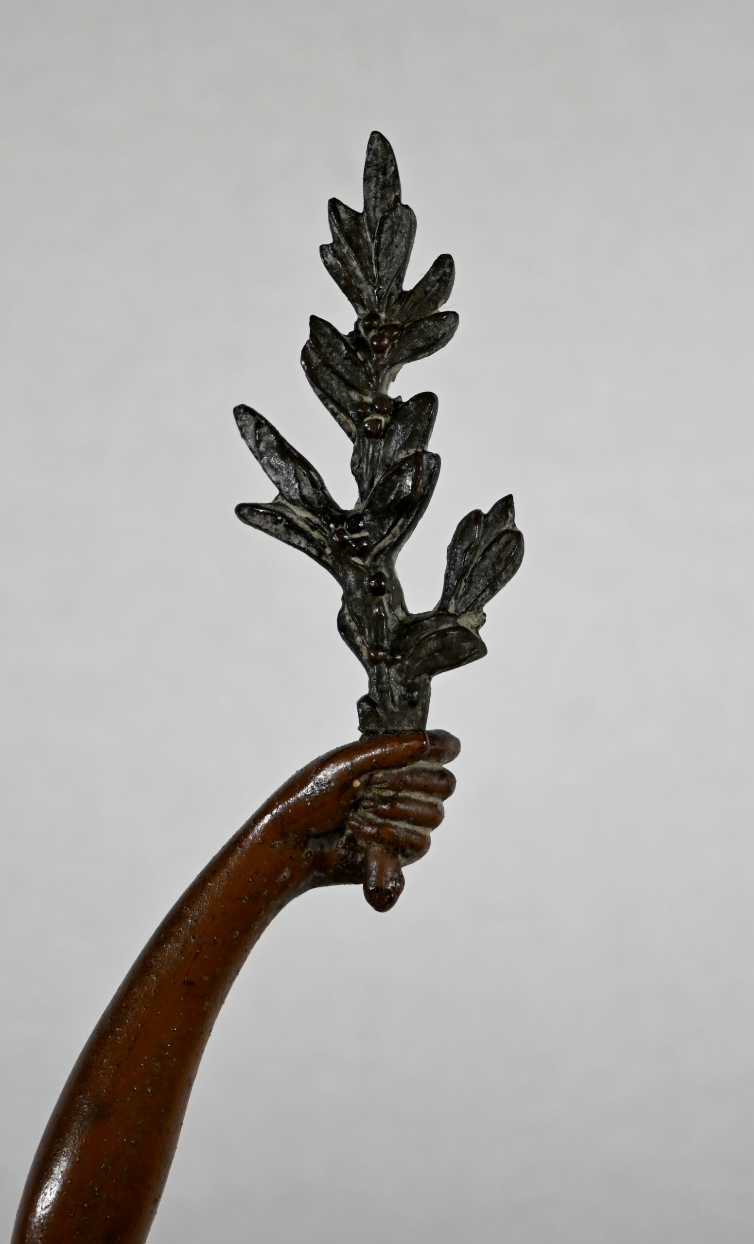 Grande épreuve en régule patiné tricolore, représentant une jeune femme tenant un rameau d’olivier au-dessus de sa tête.