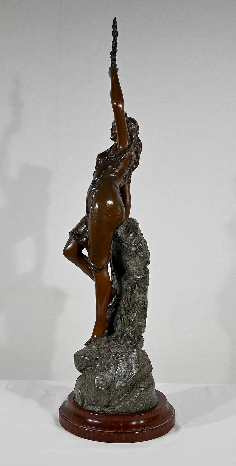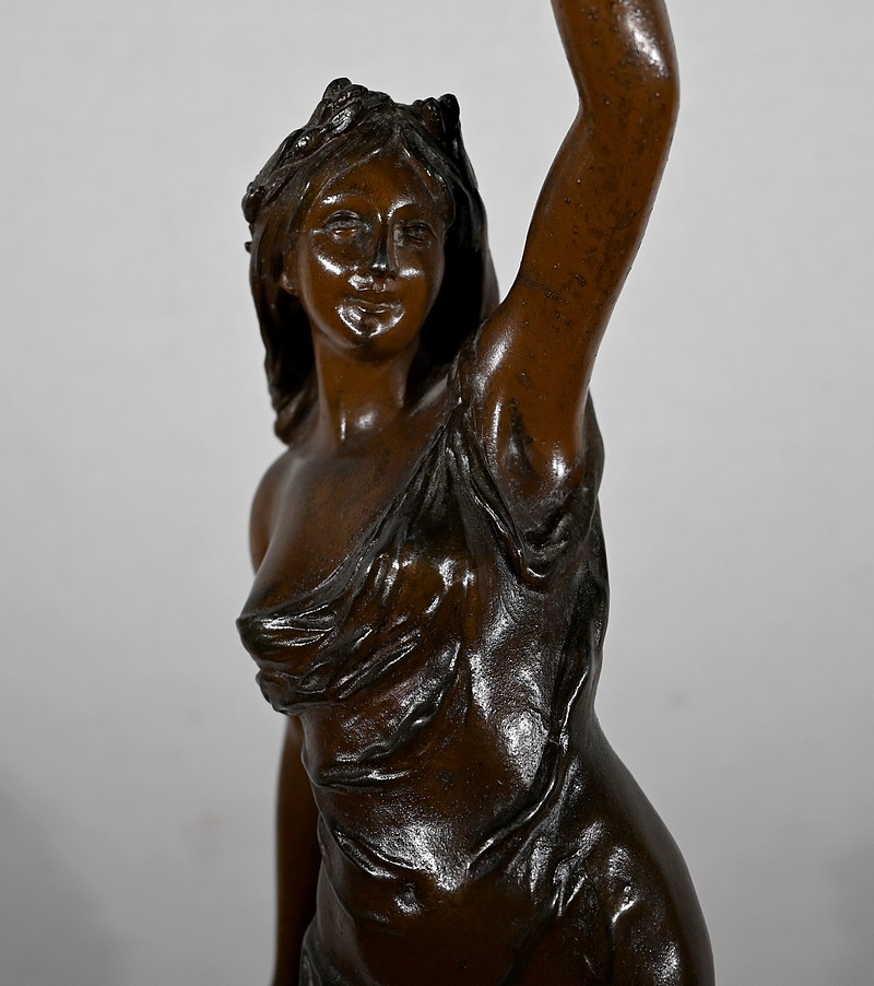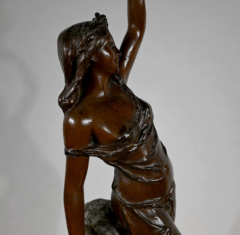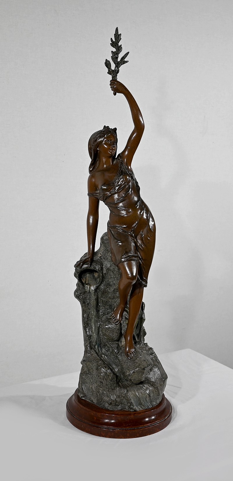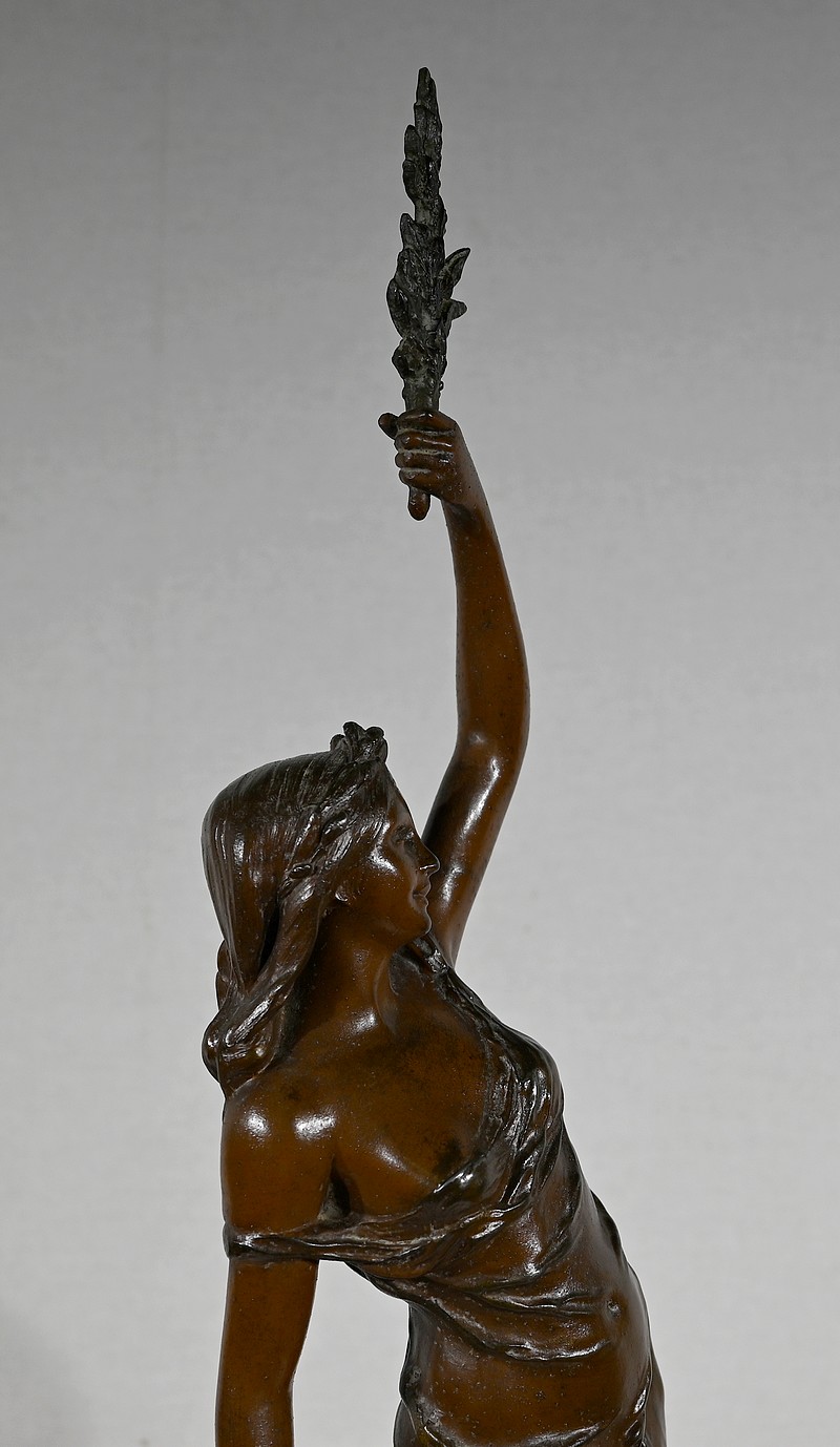 Grande épreuve en régule patiné tricolore, représentant une jeune femme tenant un rameau d’olivier au-dessus de sa tête.
