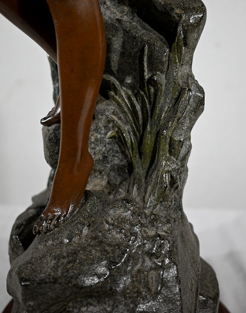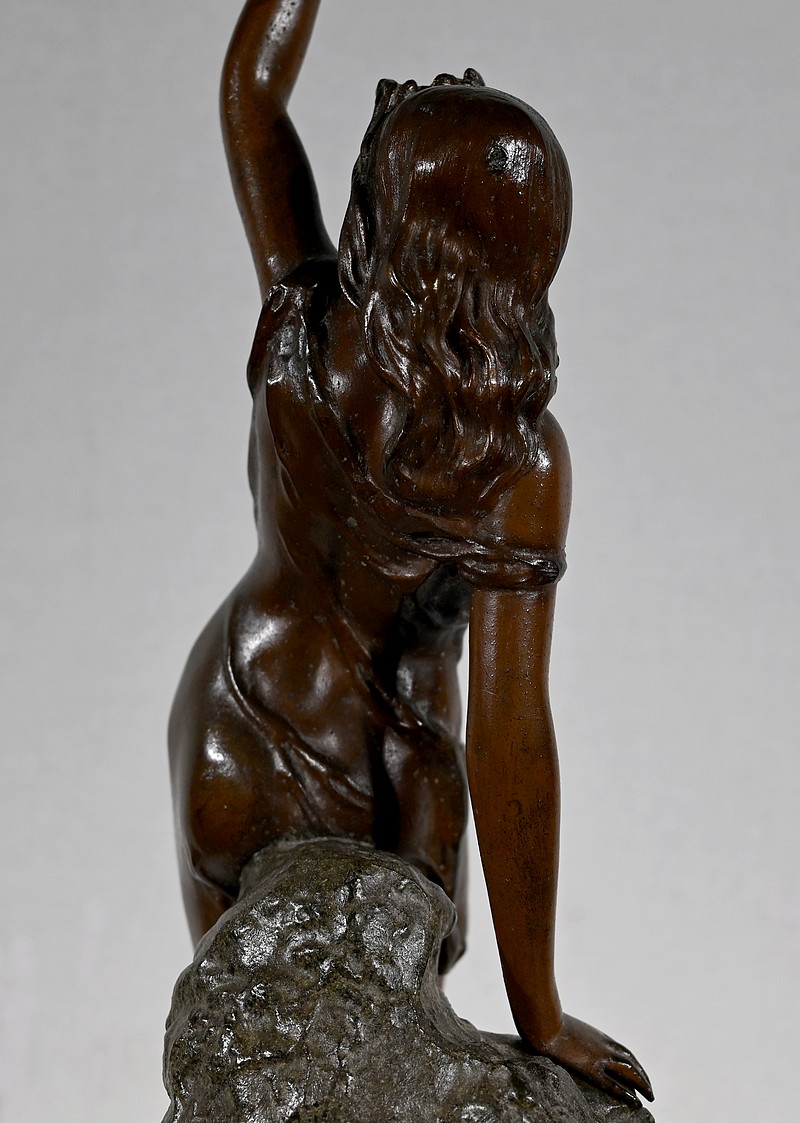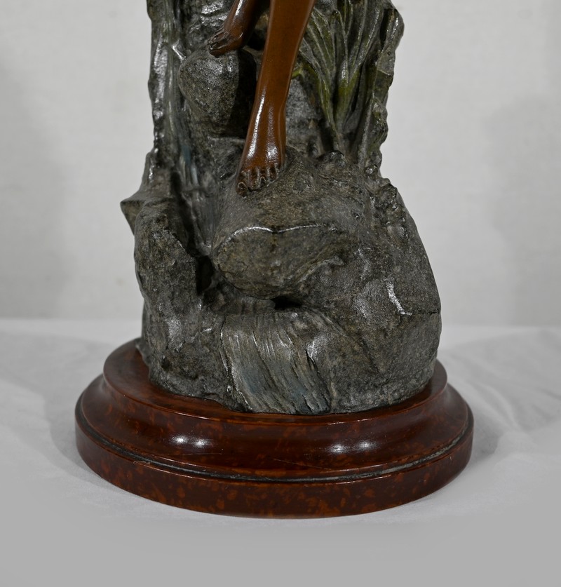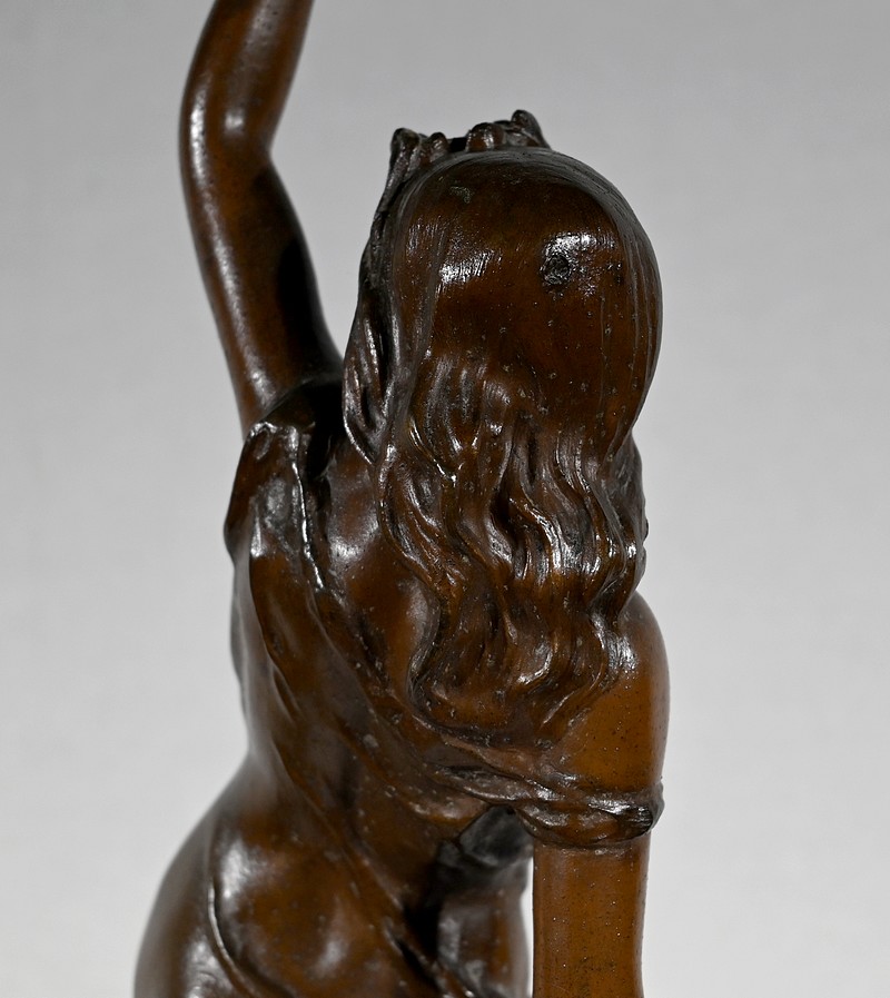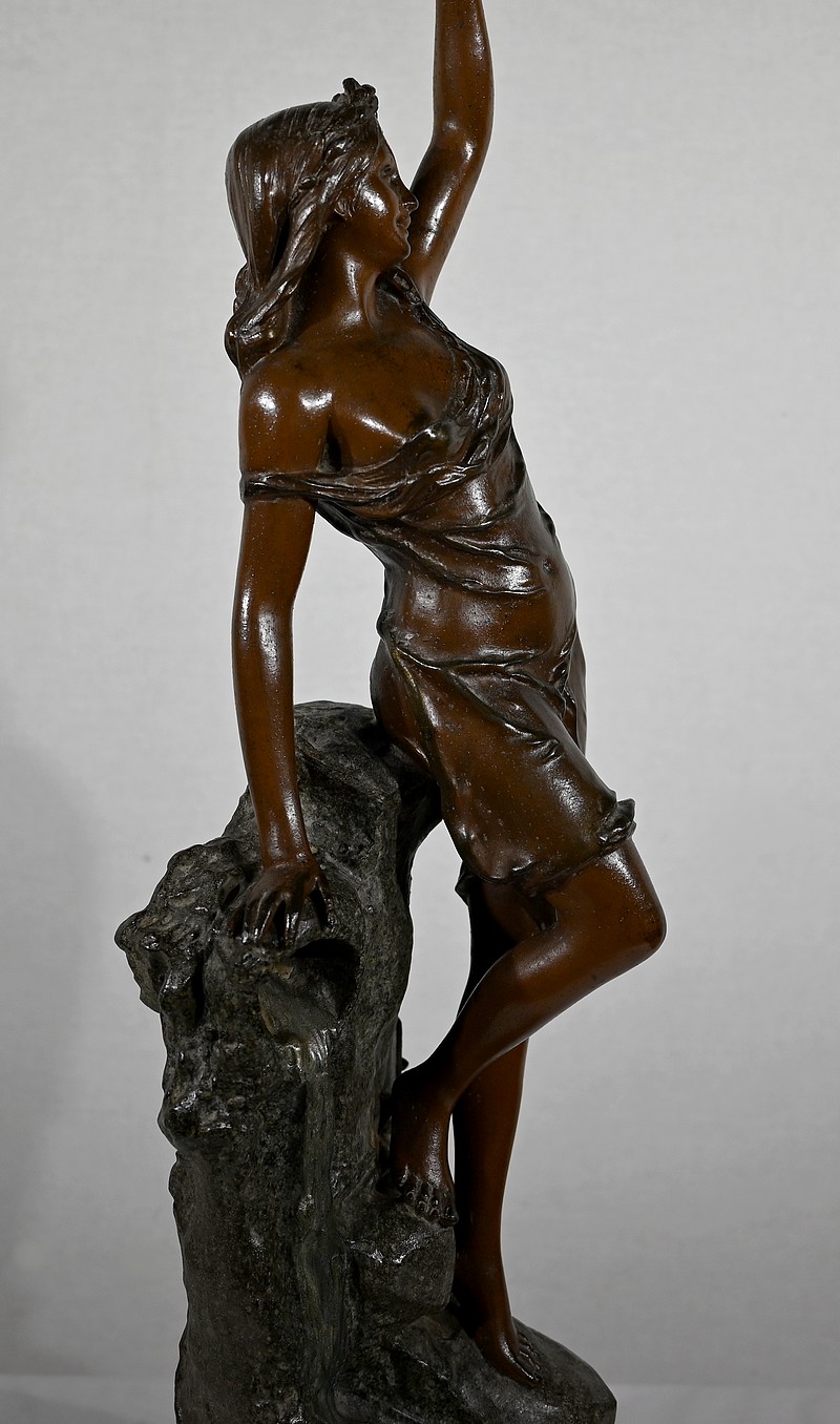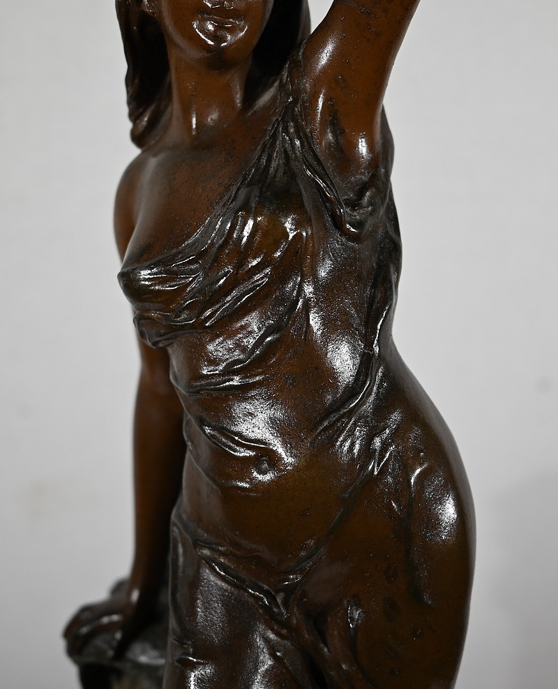 Grande épreuve en régule patiné tricolore, représentant une jeune femme tenant un rameau d’olivier au-dessus de sa tête.