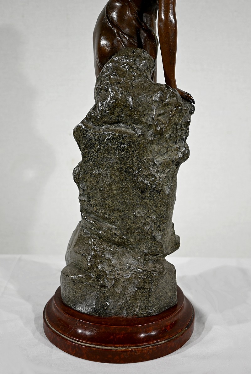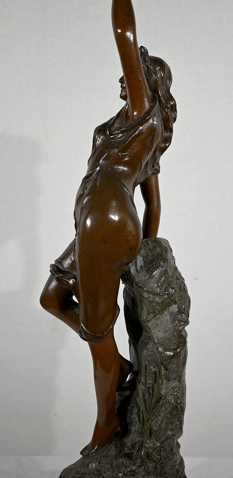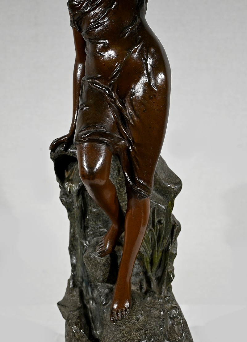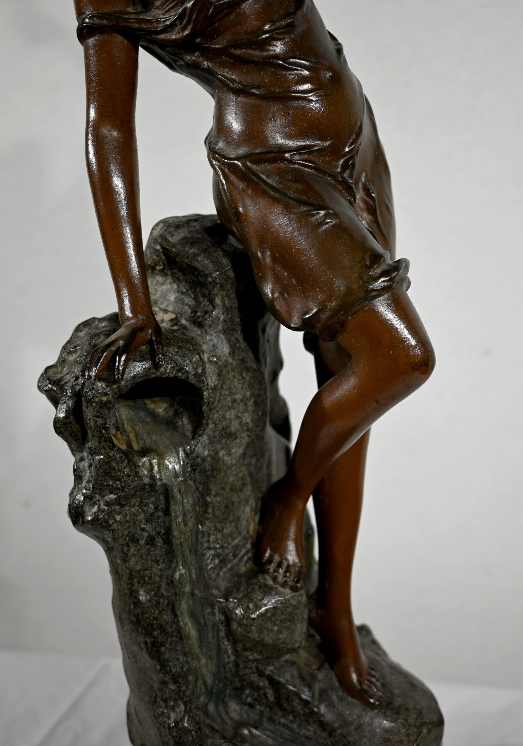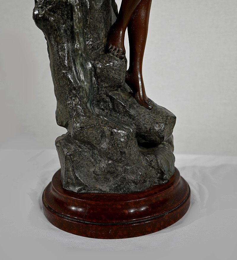 Légèrement vêtue d’un voile mettant en valeur les courbes de son corps, la belle se tient sur un rocher. Son visage doux et souriant est tourné vers le ciel. Ses longs cheveux ondulés sont agrémentés d’une large couronne de fleurs. A ses pieds, un ruisseau s’échappe d’une fontaine en forme de cruche.