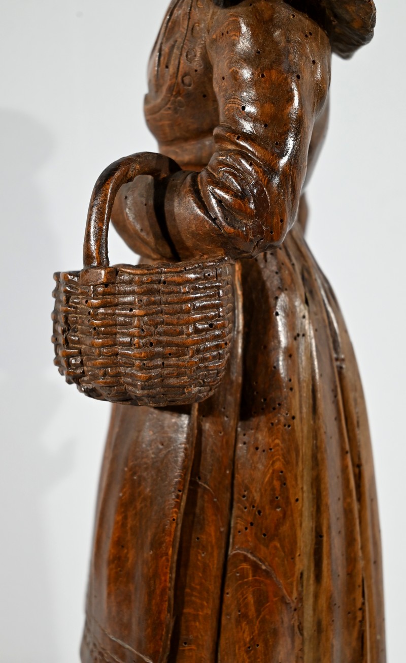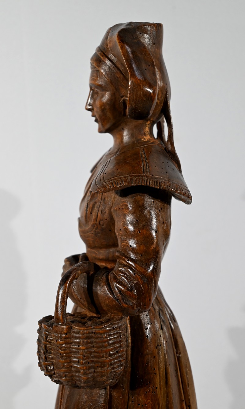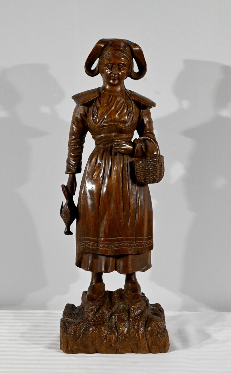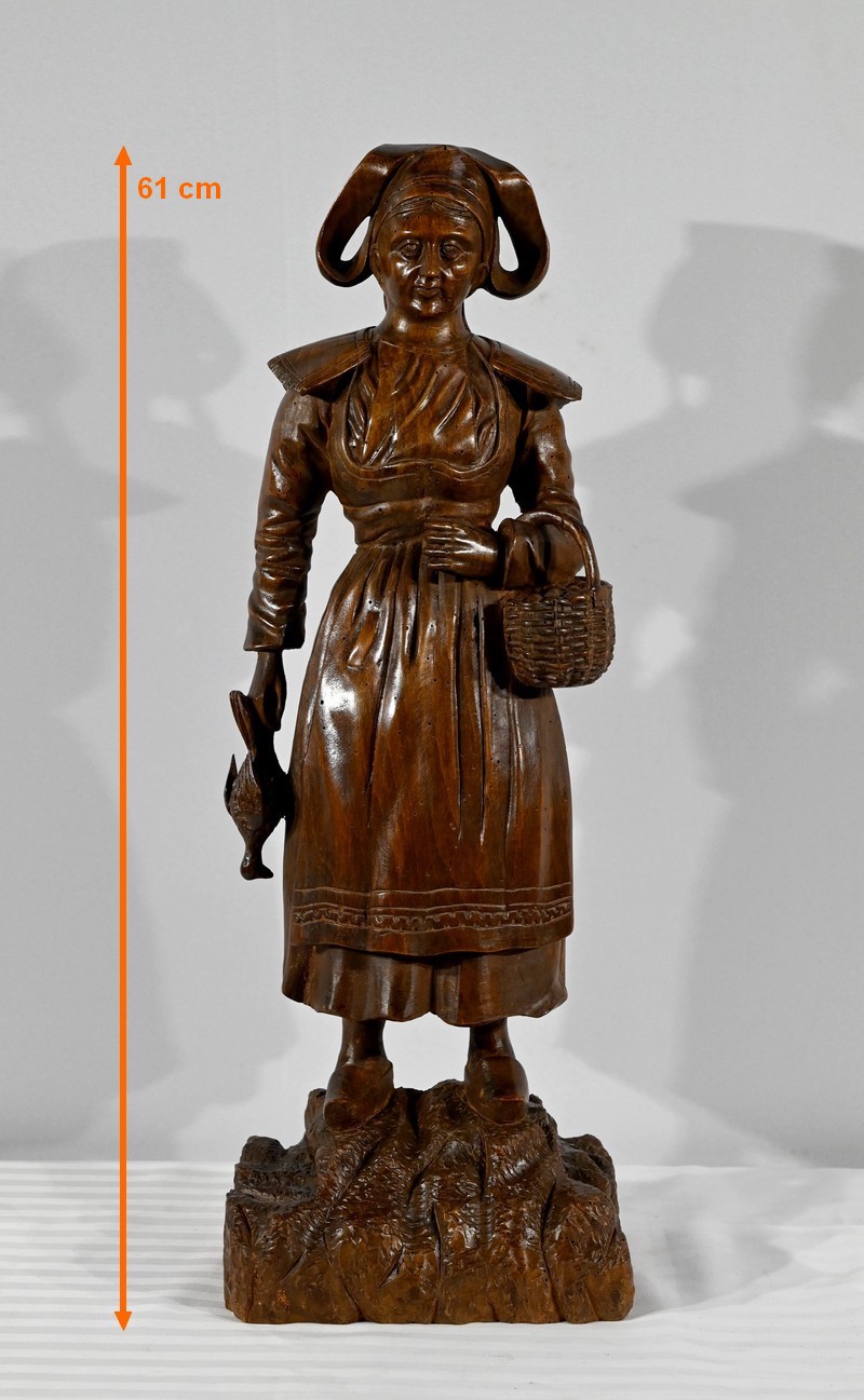 Cette œuvre figure une bretonne vêtue d’habits traditionnels, composés d’une longue robe, d’un napperon, d’épaulettes, d’une coiffe du pays de Carhaix-Plouguer et est chaussée de sabots en bois. Cette bigoudène, au retour du marché, tient un canard dans la main droite et sous le bras gauche un panier en osier rempli de fruits ou de légumes.