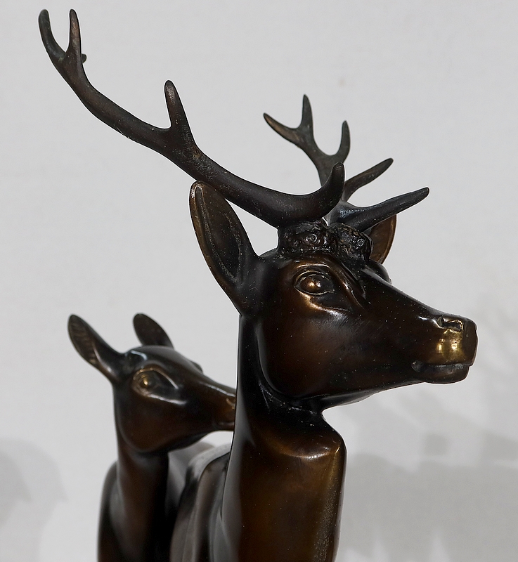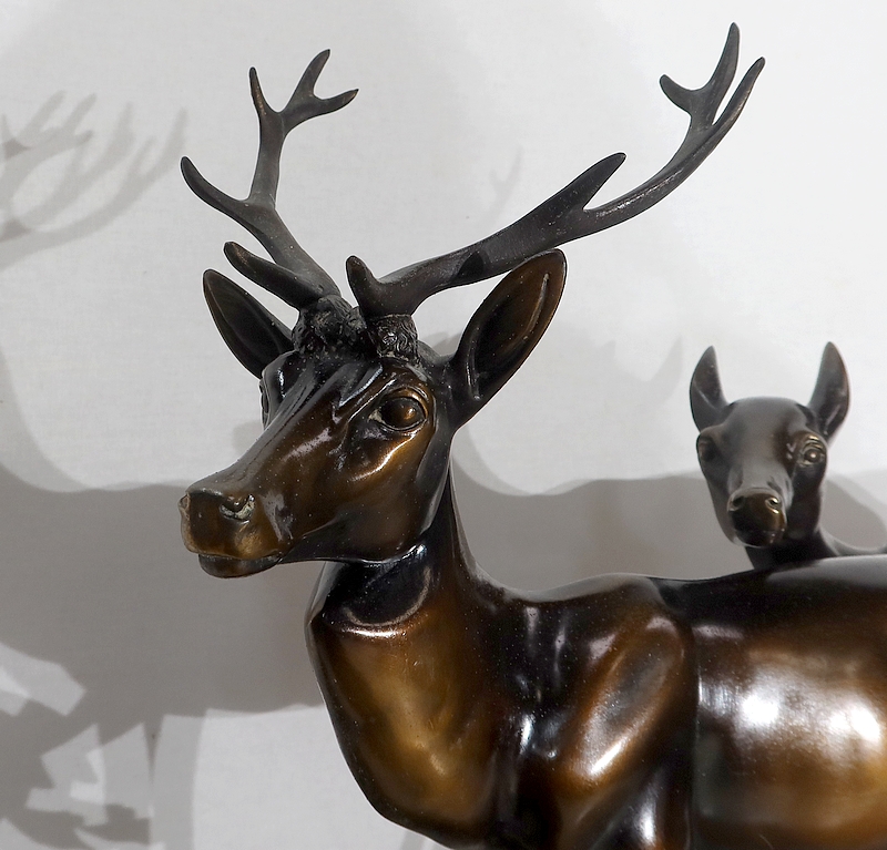 Un cerf majestueux est entouré d’une biche et de son faon. Le groupe en mouvement avance sereinement, têtes relevées, le regard porté au loin. L’artiste met en valeur la beauté de ces animaux charismatiques et souligne la douceur de leurs courbes.