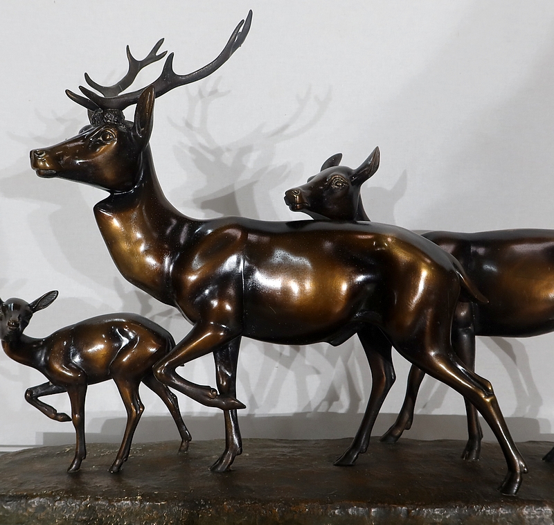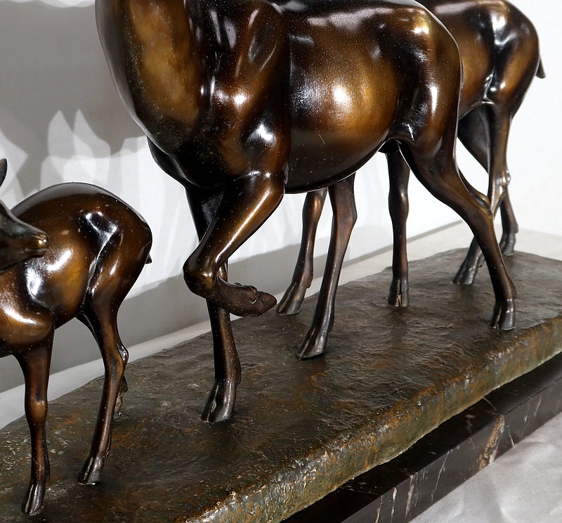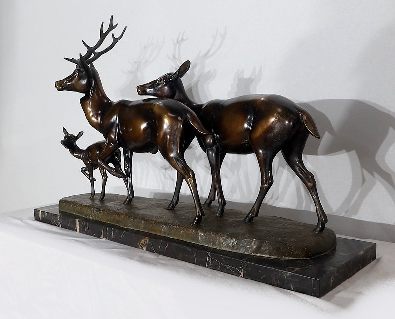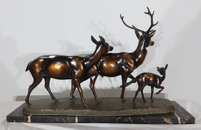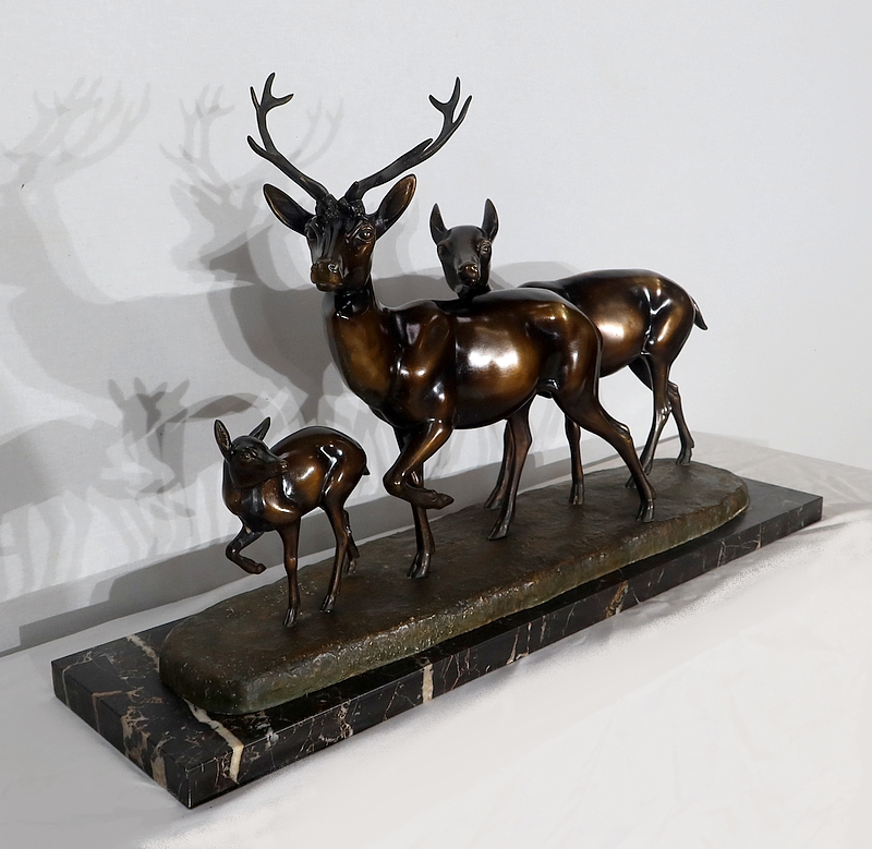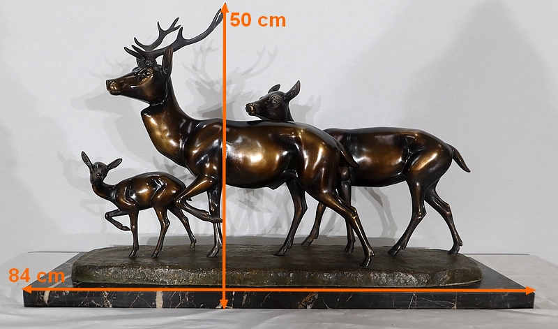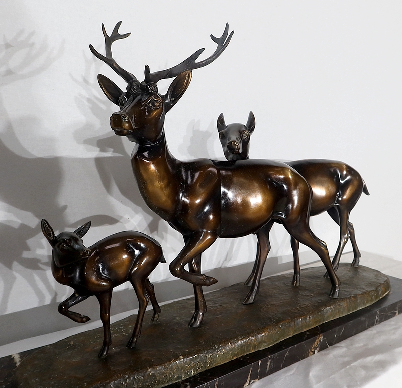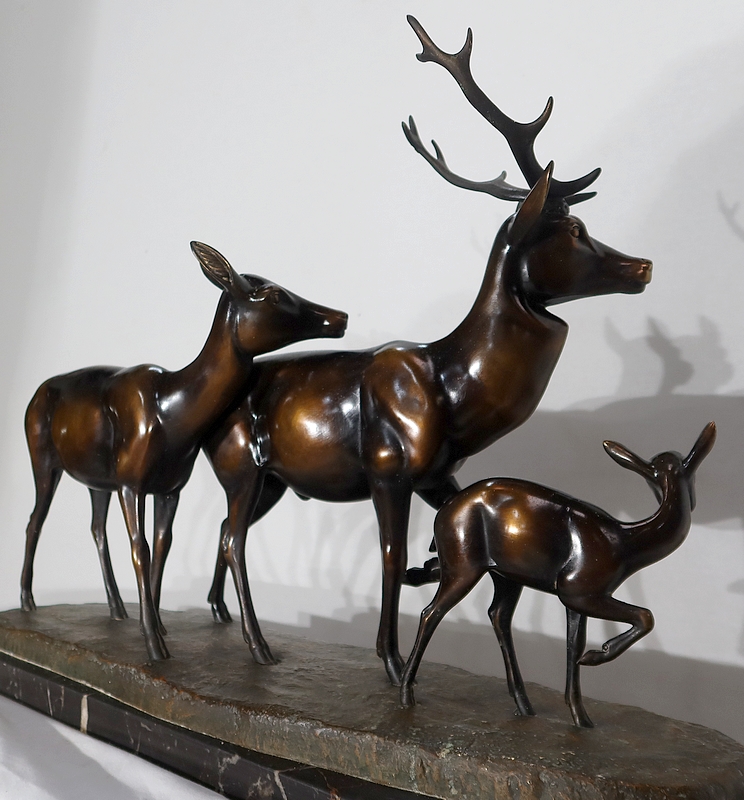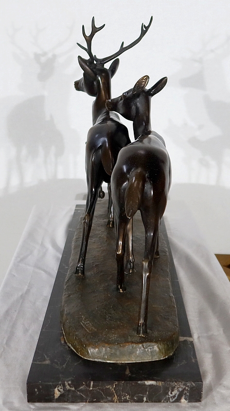 Grande sculpture en régule représentant un cerf, une biche et un faon, réalisée par M. Leducq (1879-1955), artiste français du début du XXe siècle.