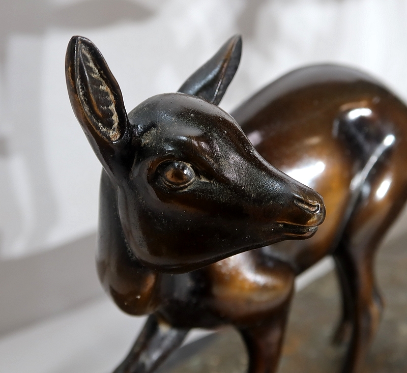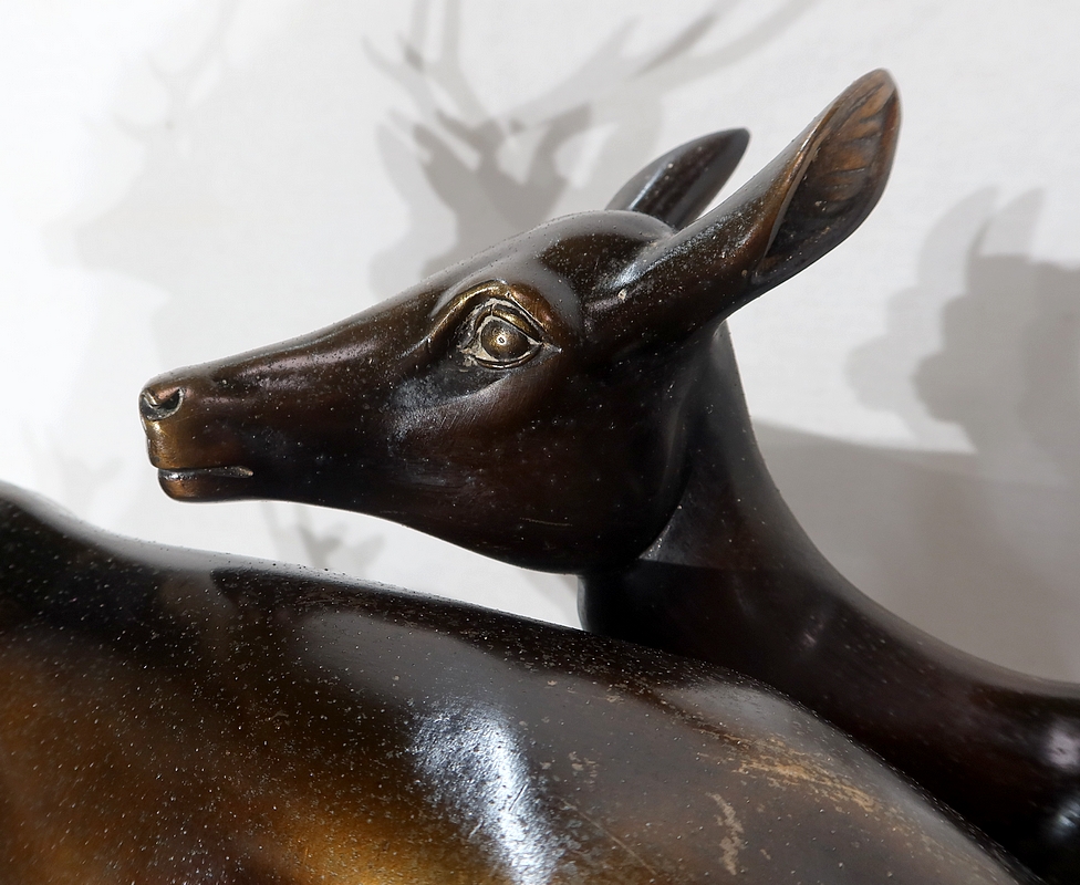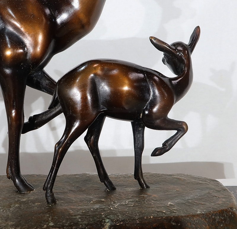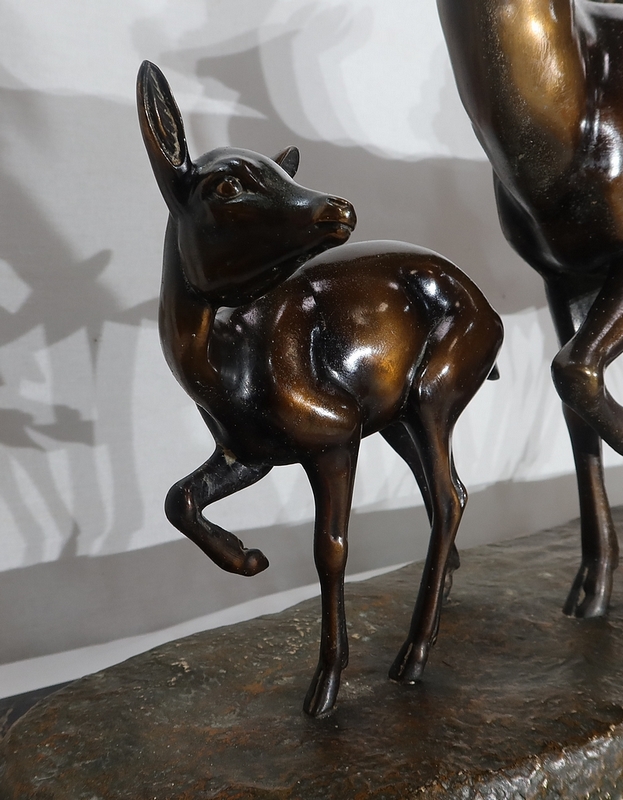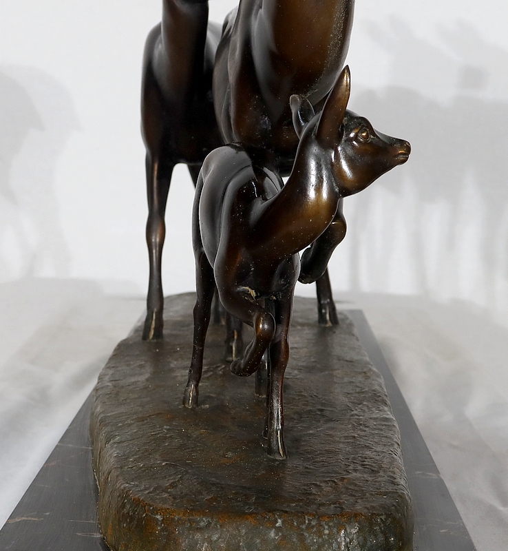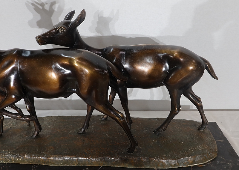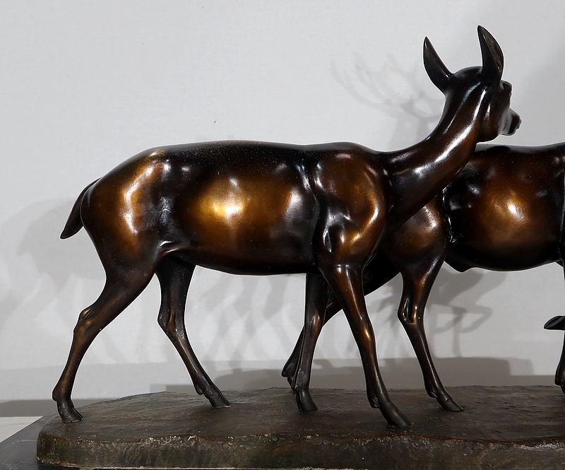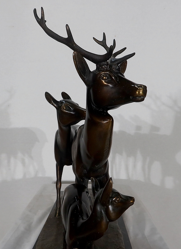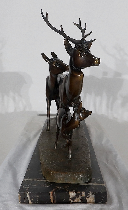 Grande sculpture en régule représentant un cerf, une biche et un faon, réalisée par M. Leducq (1879-1955), artiste français du début du XXe siècle.