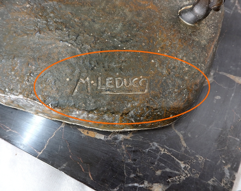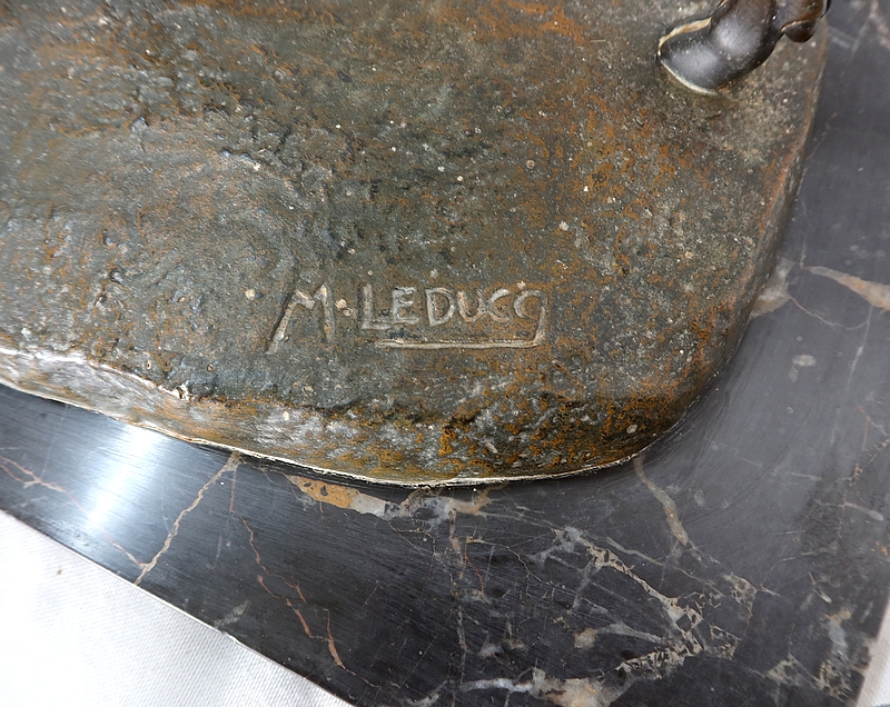 Cette œuvre de grande dimension présente une patine brune nuancée aux reflets dorés. Elle repose sur une épaisse plaque de marbre gris veiné de blanc.