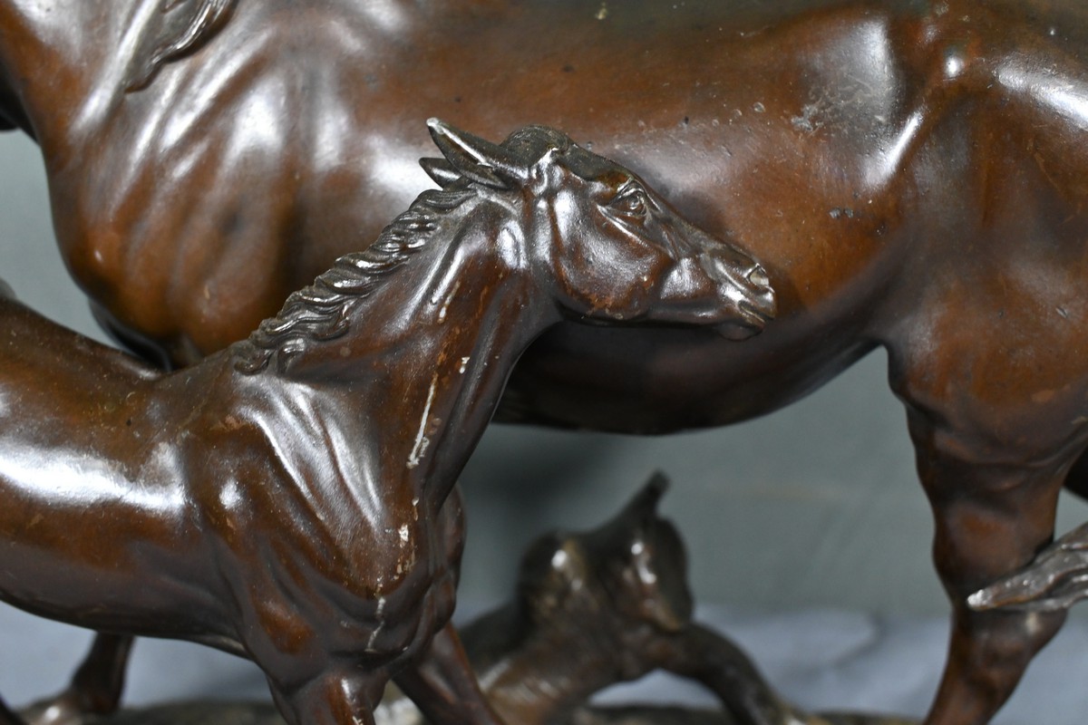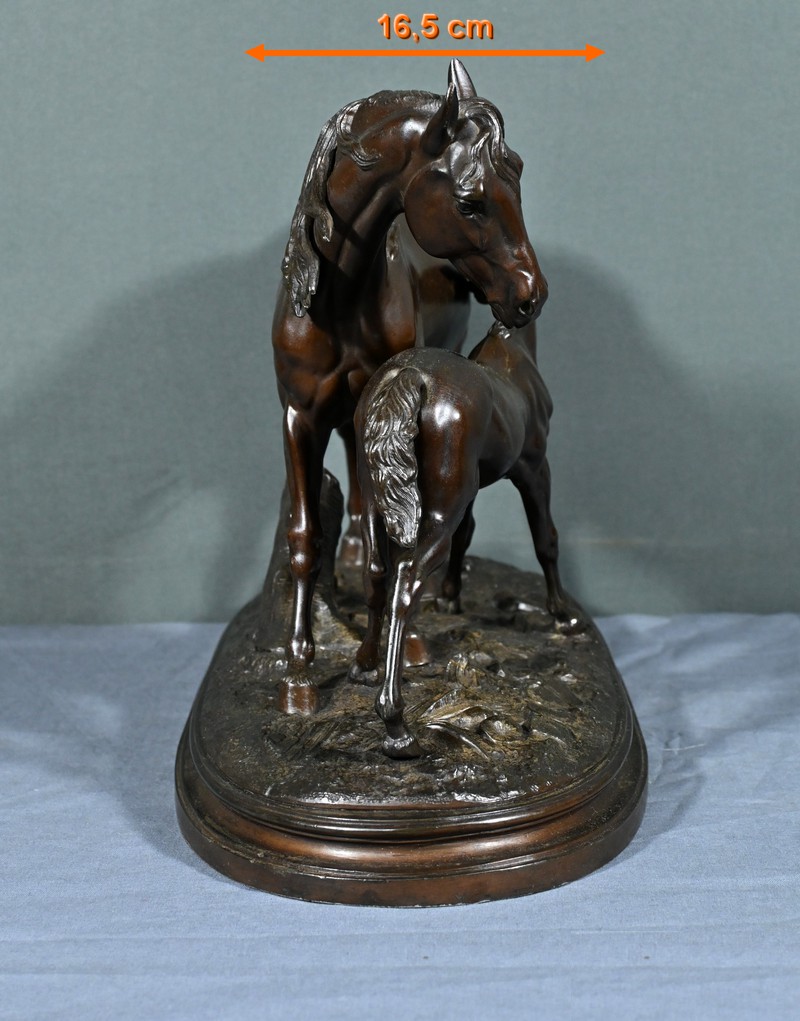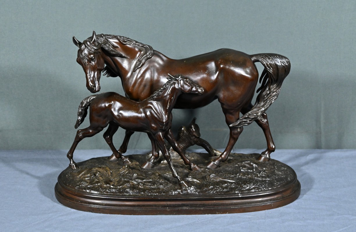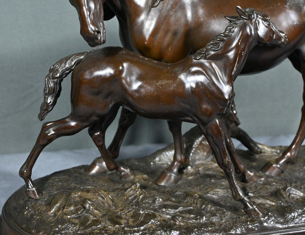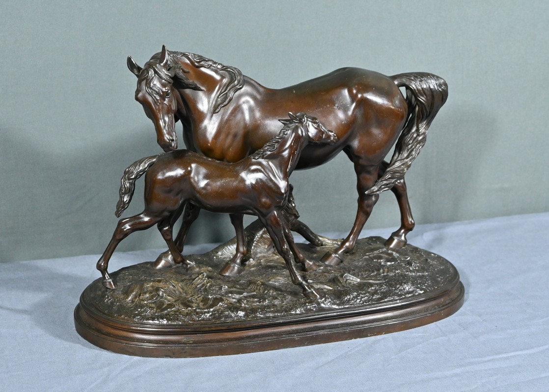 Cette sculpture en régule à patine brune, représentant une jument et son poulain, est une belle illustration de l’œuvre de Pierre-Jules Mène, sculpteur animalier français du XIXe siècle.
