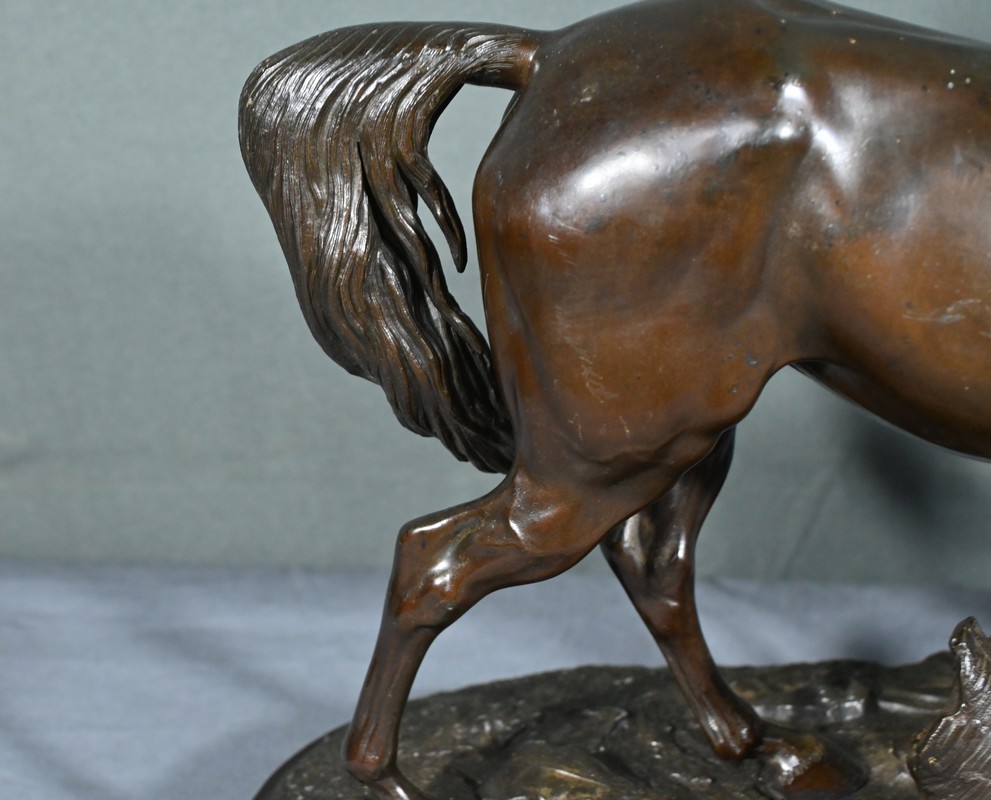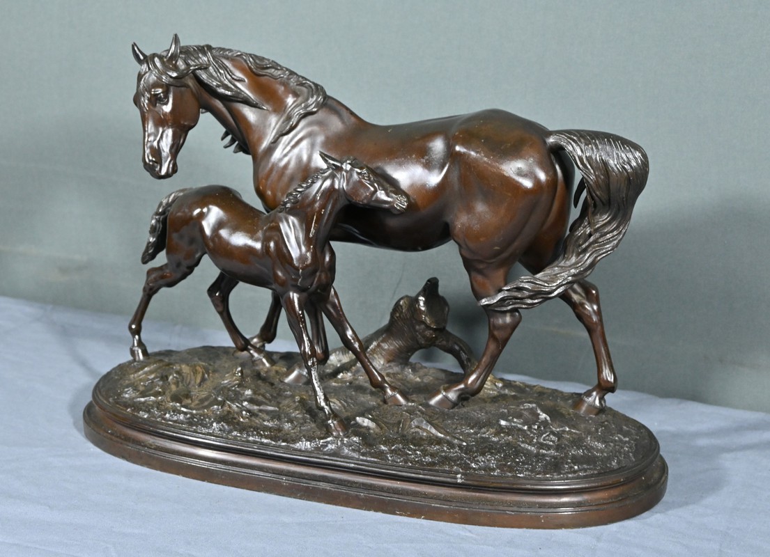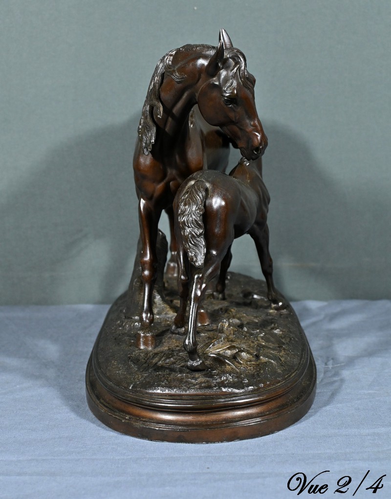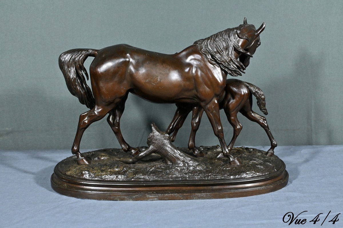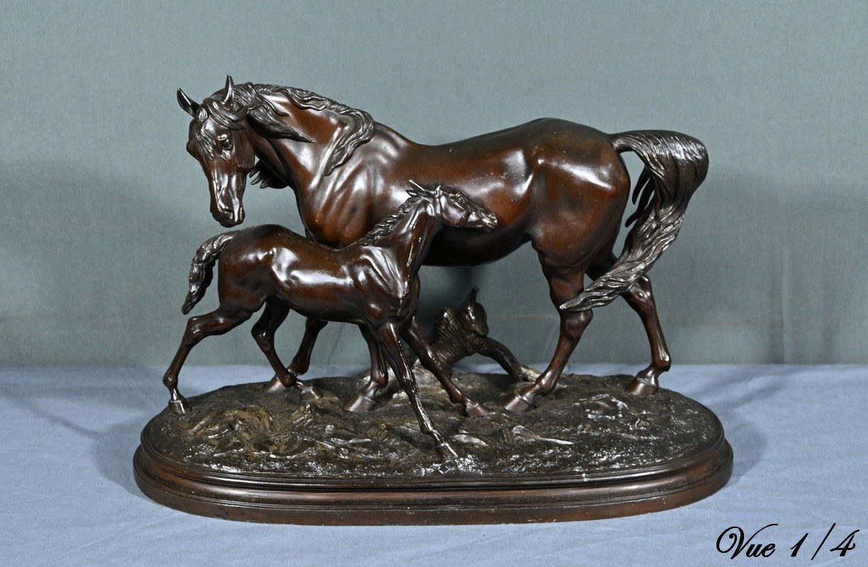 Cette sculpture en régule à patine brune, représentant une jument et son poulain, est une belle illustration de l’œuvre de Pierre-Jules Mène, sculpteur animalier français du XIXe siècle.