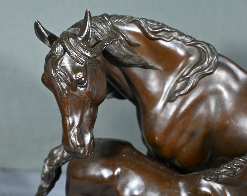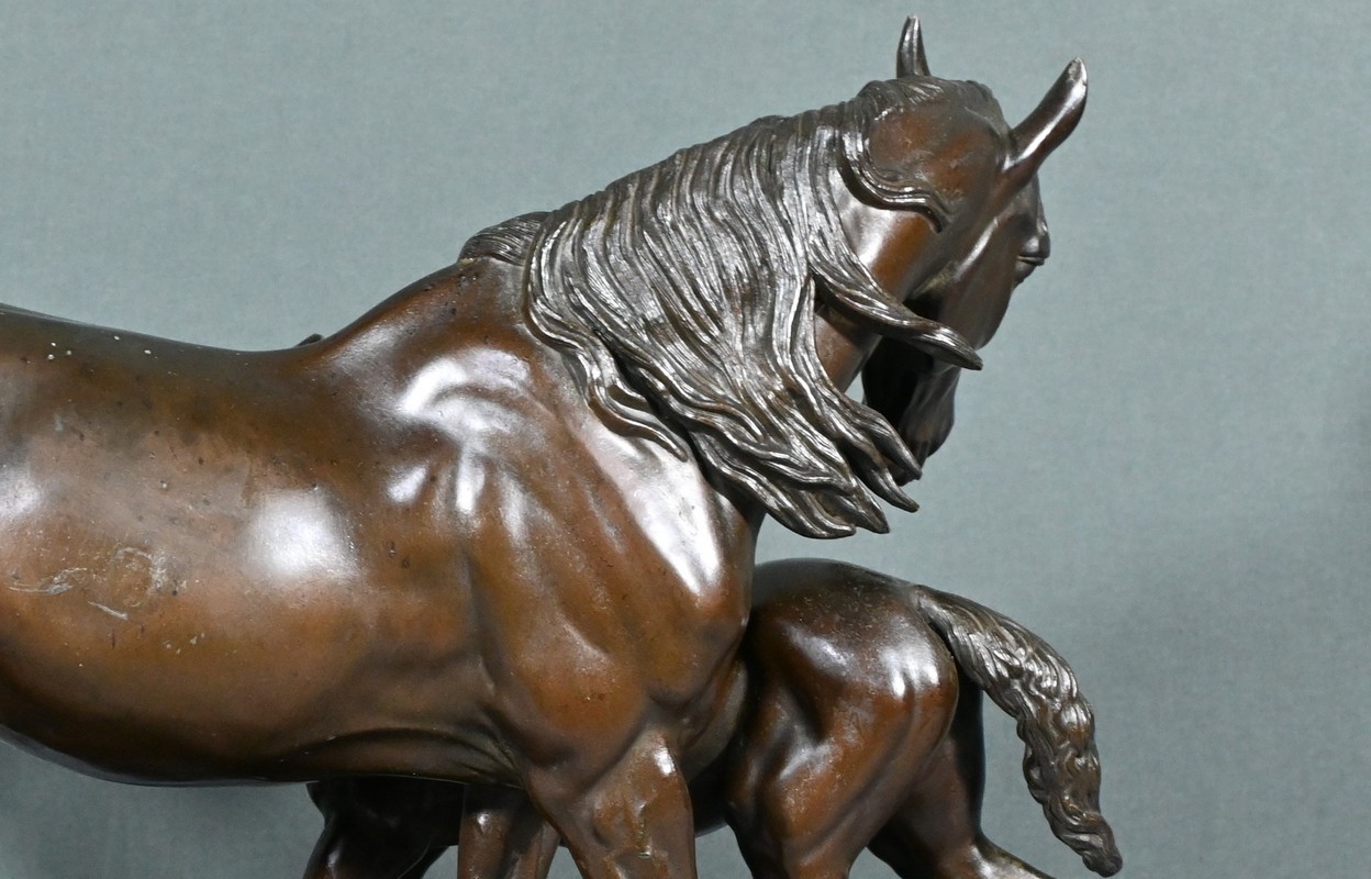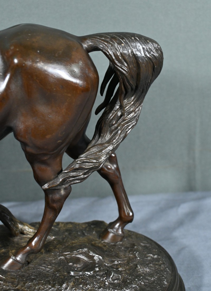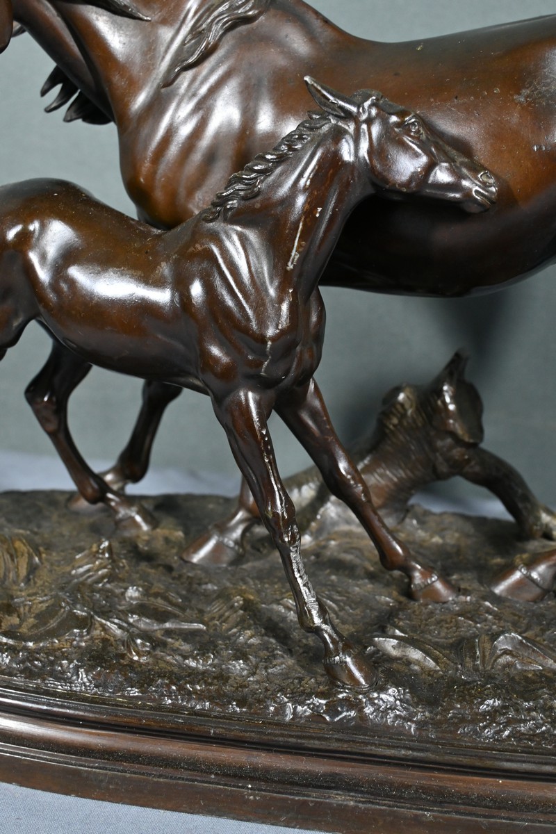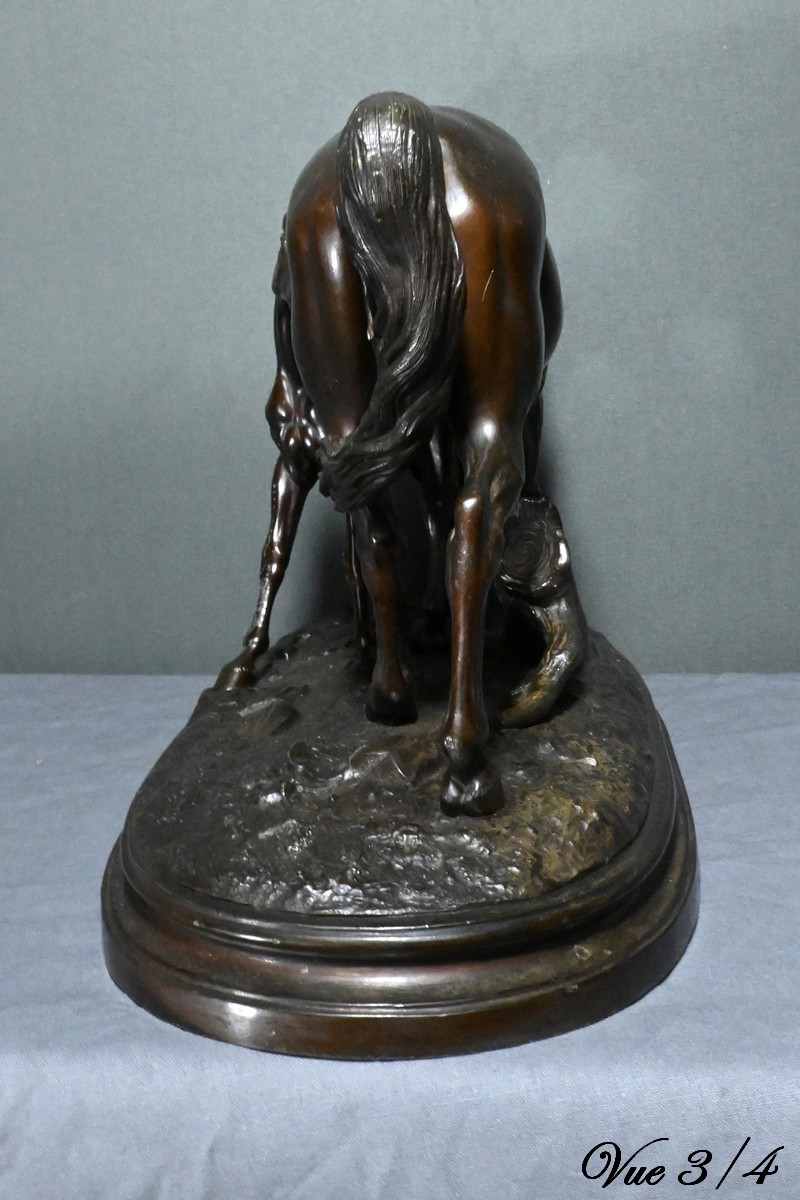 Cette sculpture en régule à patine brune, représentant une jument et son poulain, est une belle illustration de l’œuvre de Pierre-Jules Mène, sculpteur animalier français du XIXe siècle.