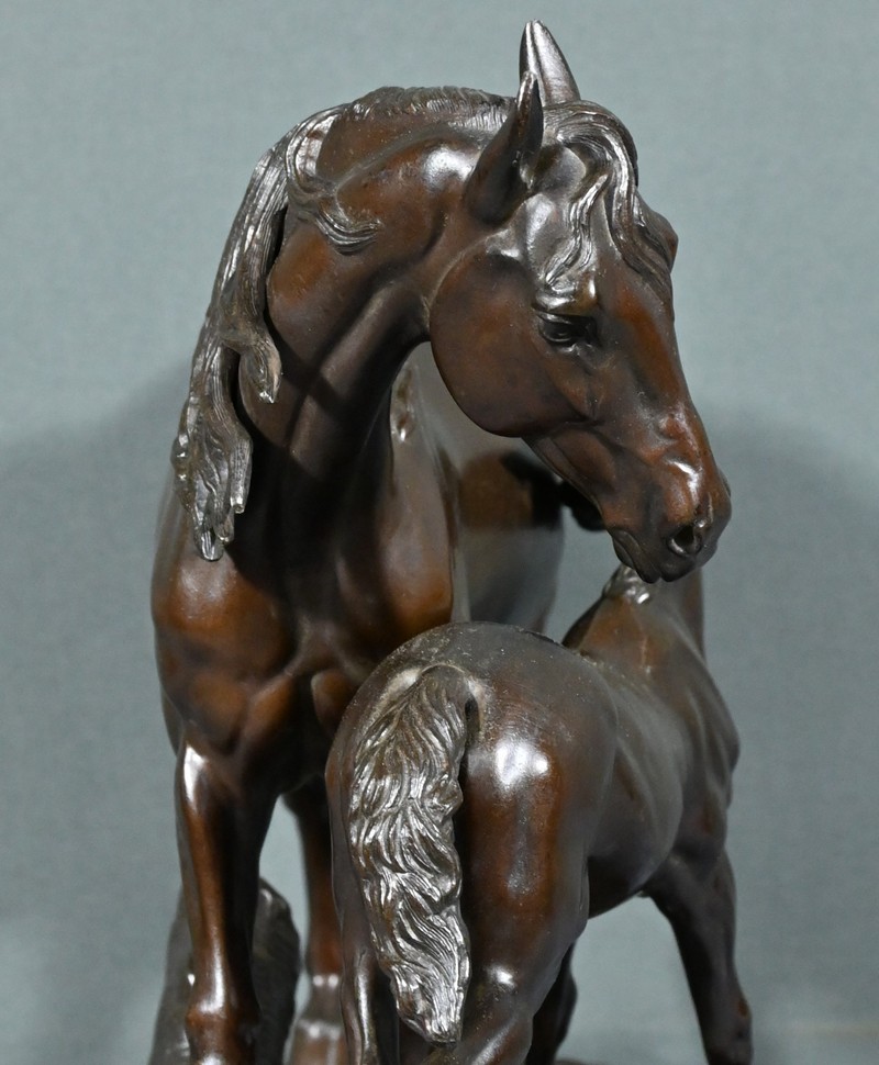 Cette sculpture représente une jument et son poulain, dans une attitude protectrice. La jument, la tête baissée, semble veiller sur son petit.